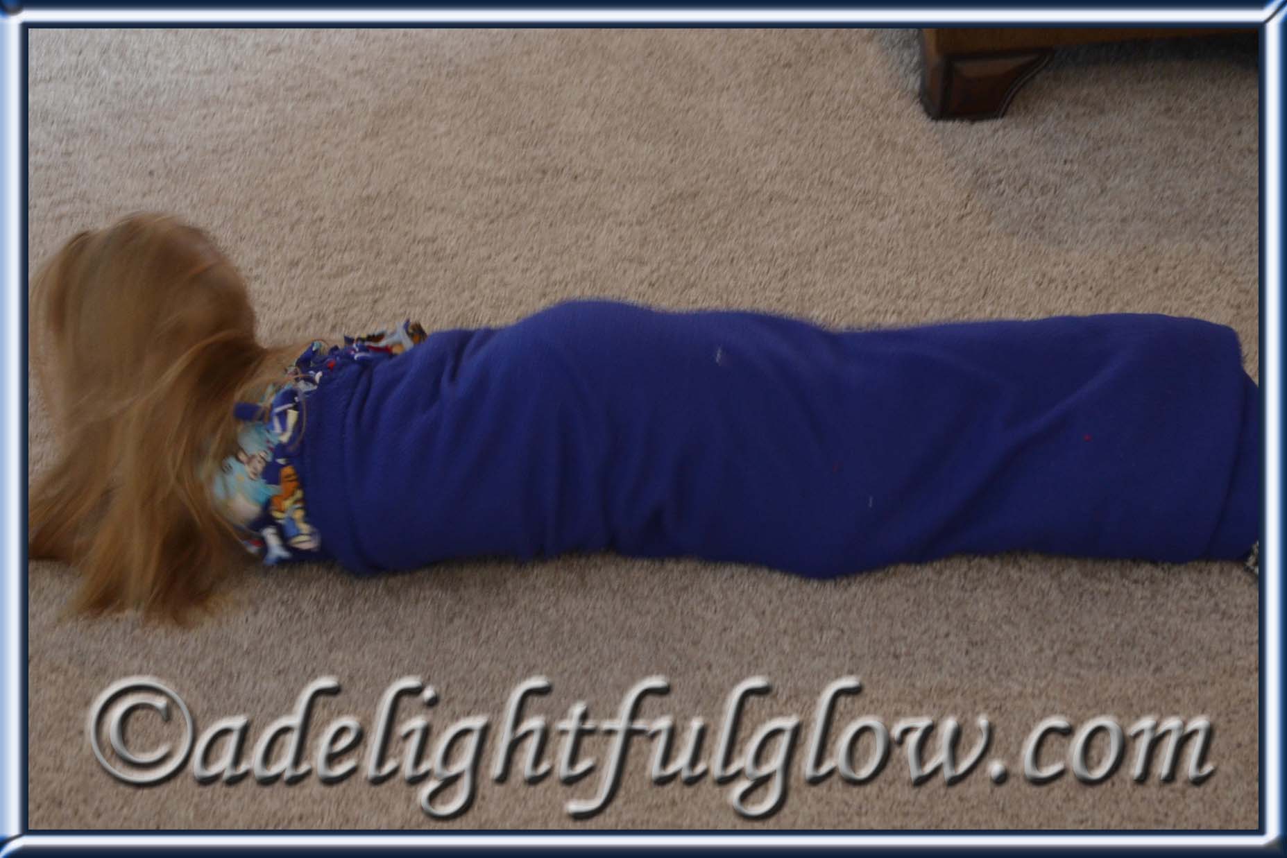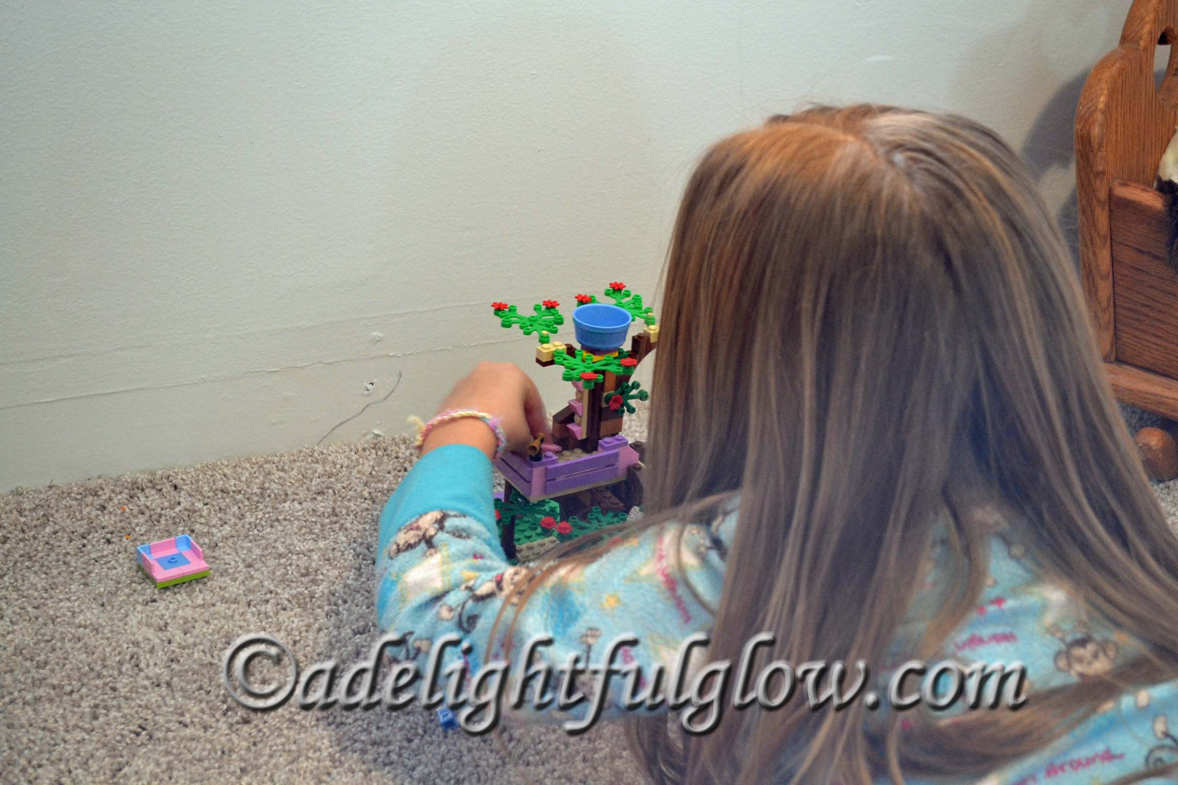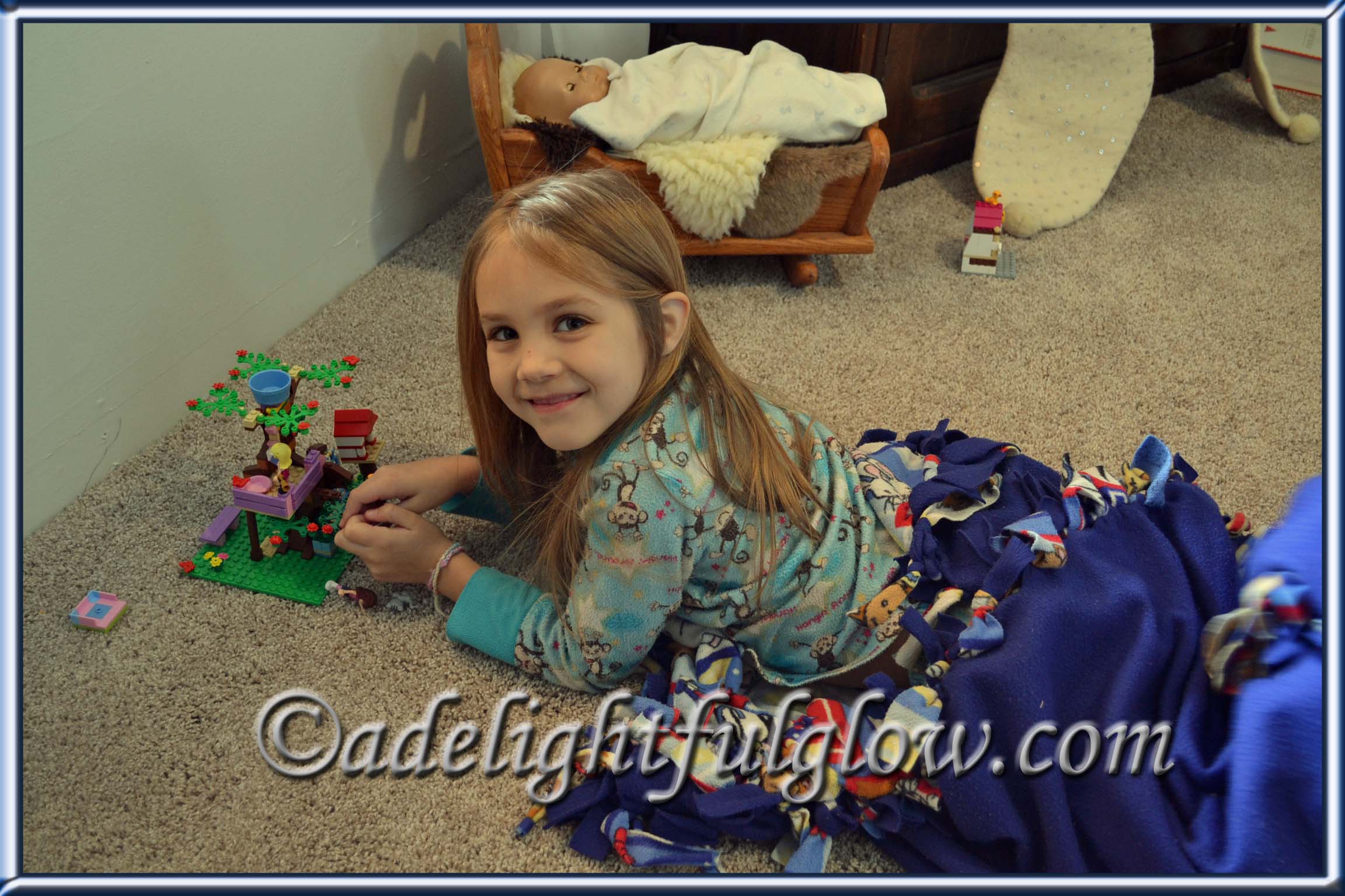 My sweet niece wrapped herself up in her blanket and was happily playing with her new Lego Friends Tree House. She looked so cute. I told her she was a bug in a rug. Later on she laid her blanket out on the floor and rolled herself up in it. She told me, “This is the bug rolling herself up in a rug.” I happily snapped pictures.