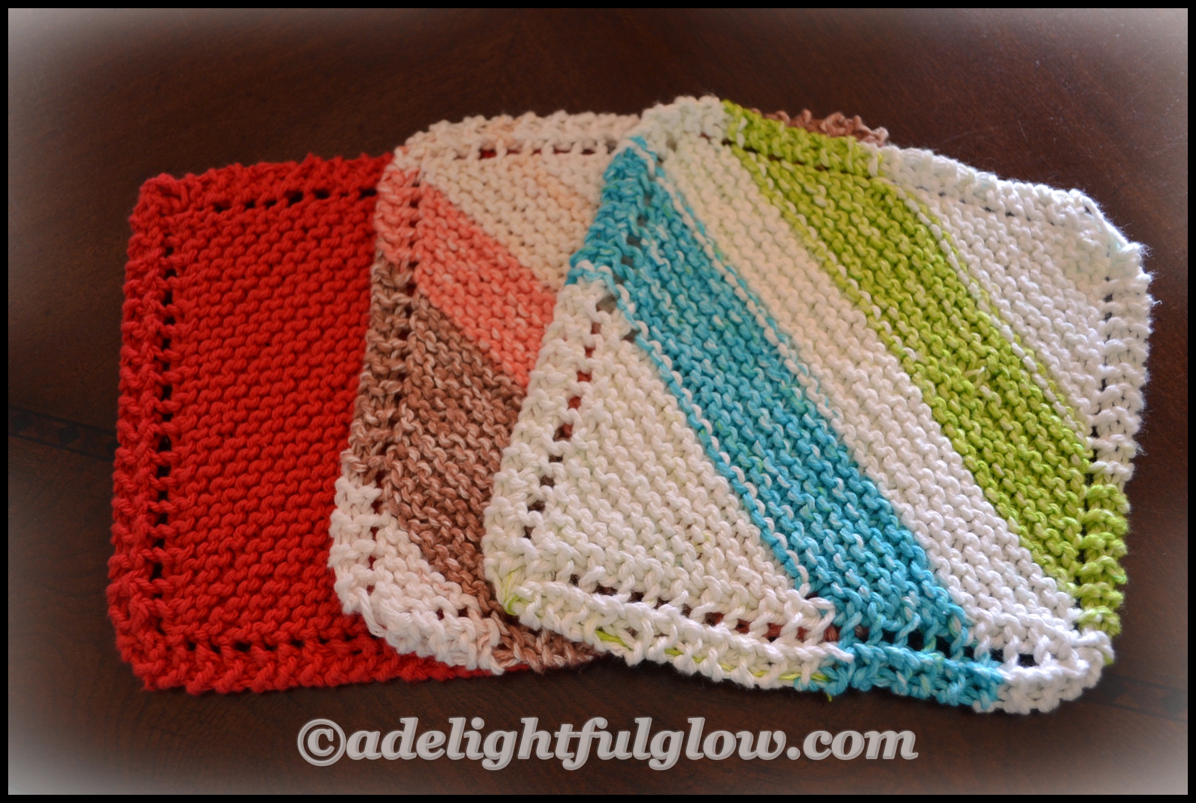 Today, I’m delighting in the moisture, brightly colored towels flapping on the line in the cool morning air, fresh-baked bran muffins, and these pretty, cheery dishcloths that I’ve finished.