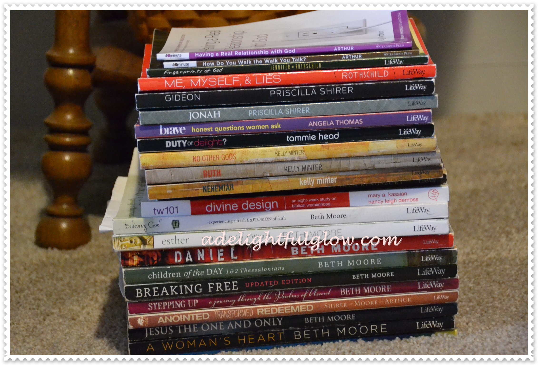 I’ve always liked the look of a stack of books and as I read Beth’s post and her history and saw the picture of the stack of studies and homework that God worked through her, I loved the idea of the visual reminder the stack made.