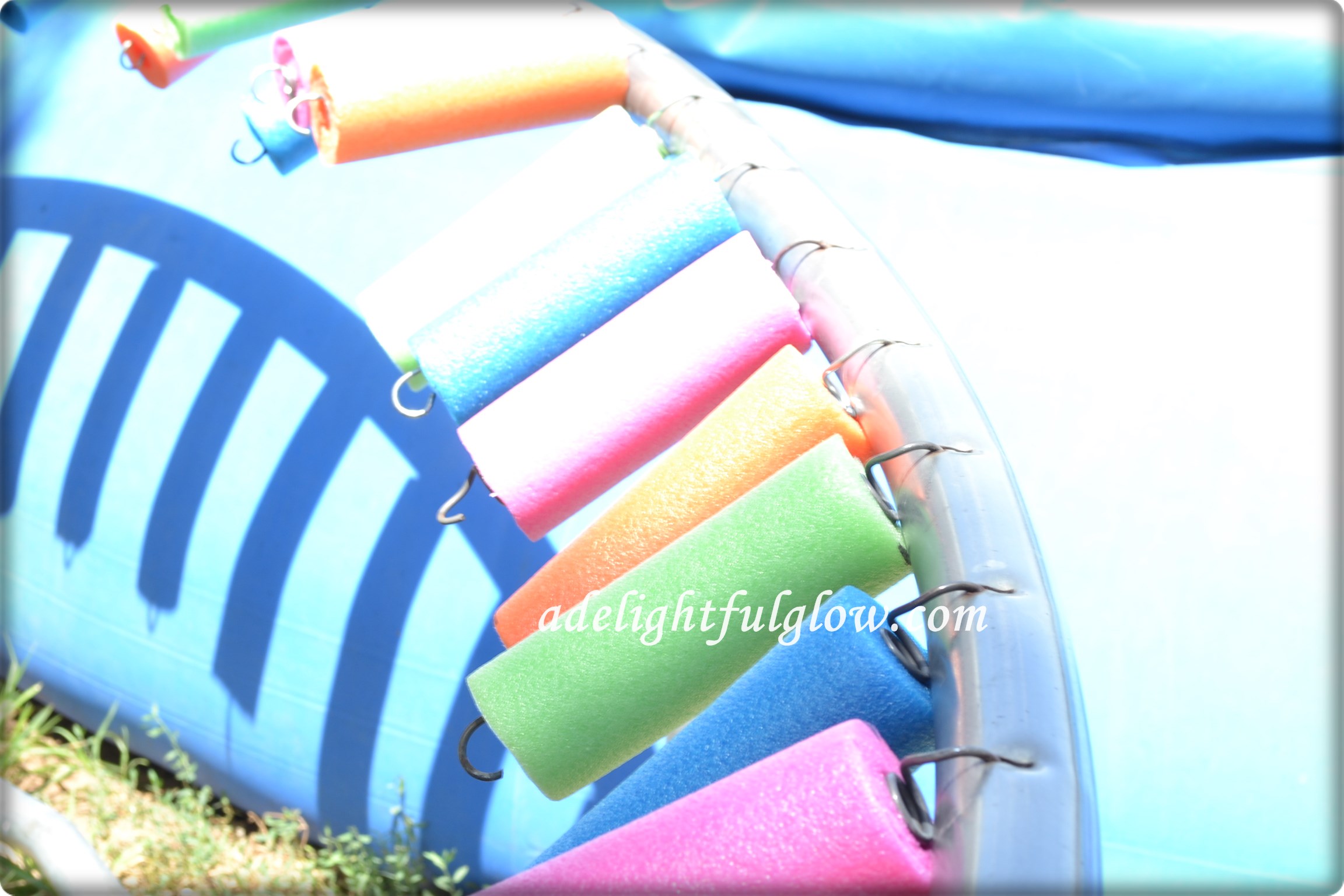 It was good timing too. We were waiting for the trampoline mat, had the trampoline apart anyway, and it was the week of swimming lessons, which meant we were driving to town everyday, which also meant I could run into Wal-Mart a couple of times to gather up, and buy, pool noodles. You can find pool noodles on Amazon here. Or give your local Dollar Store a try!