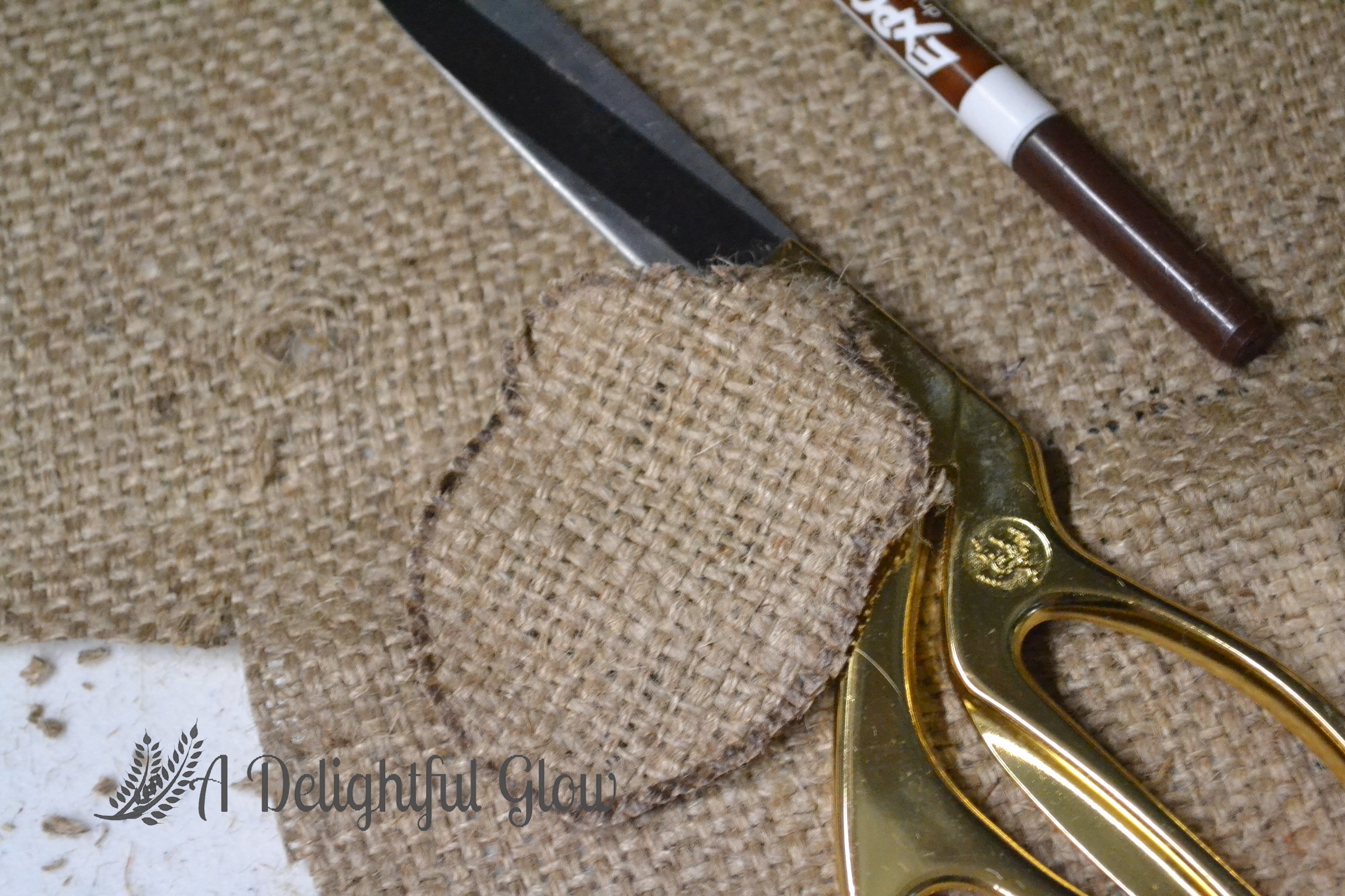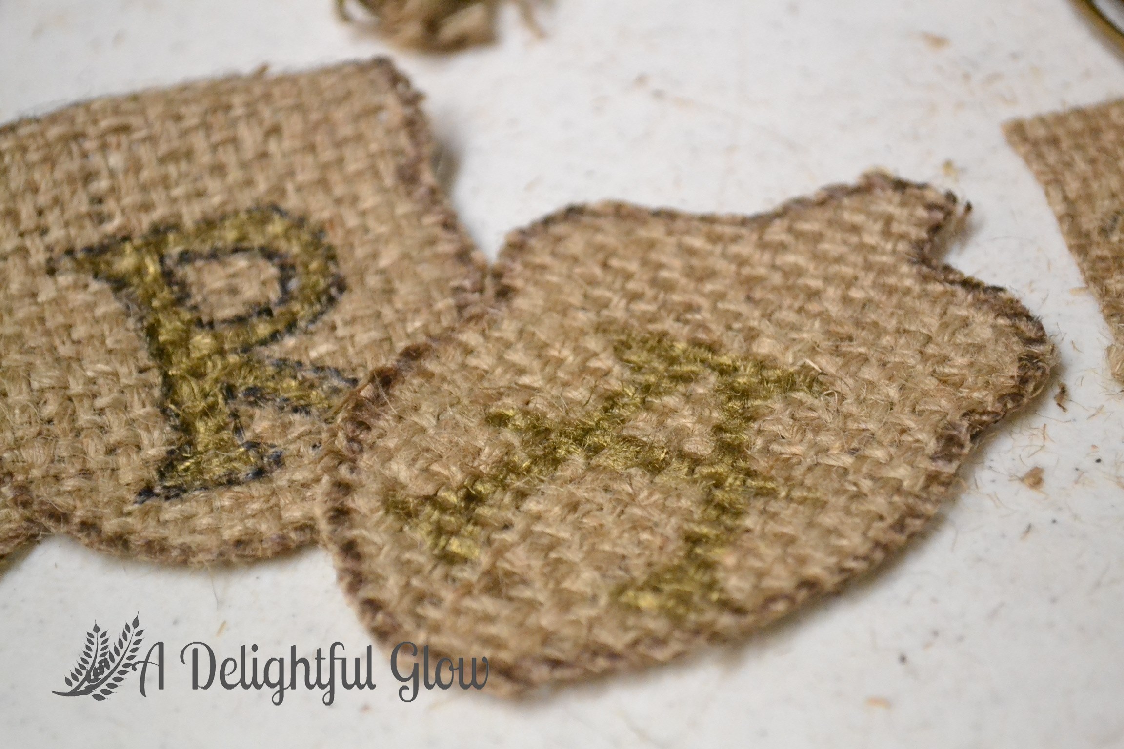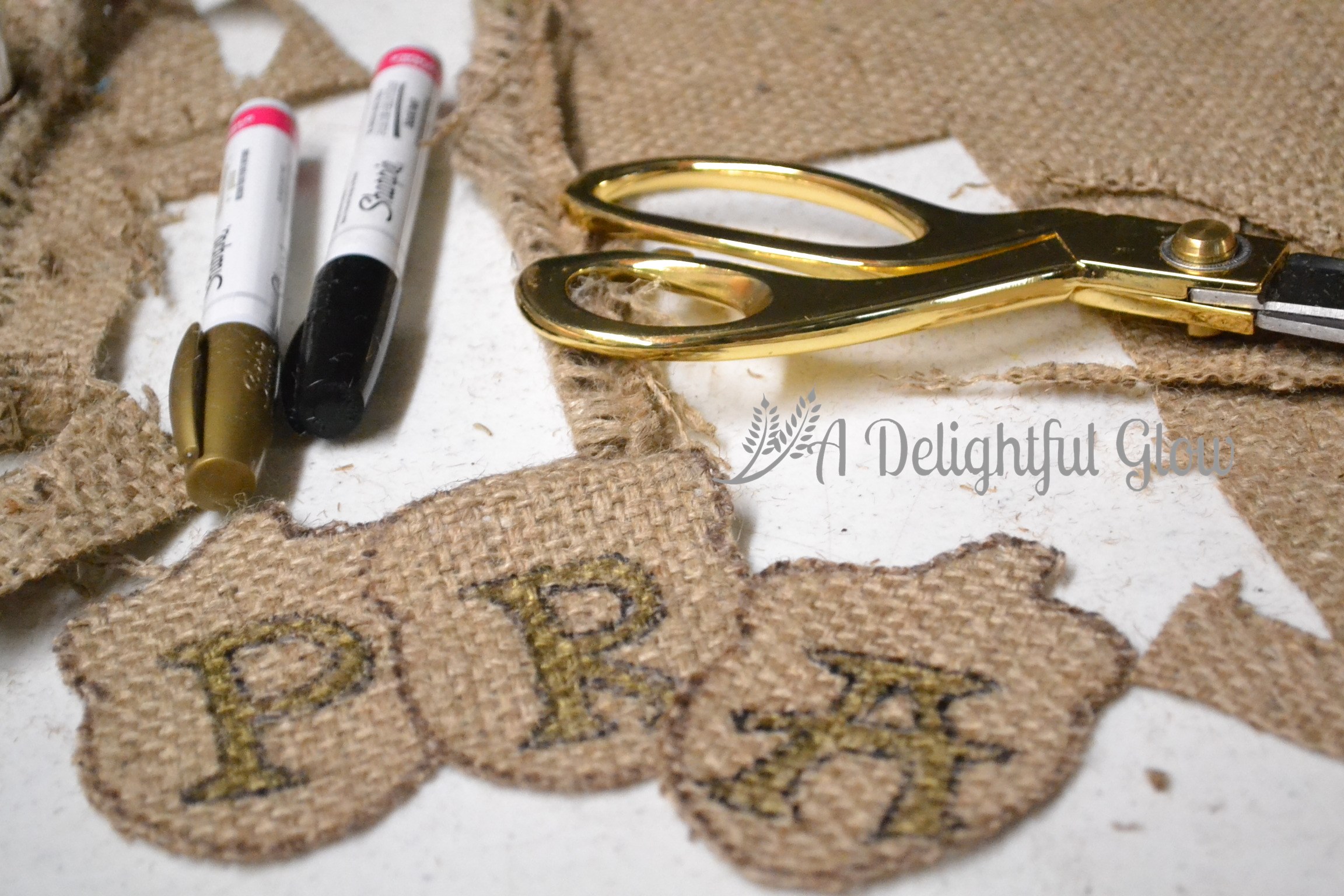 I kept noticing the pennant banner my daughter made last year. Hmmm. Burlap pennants perhaps?