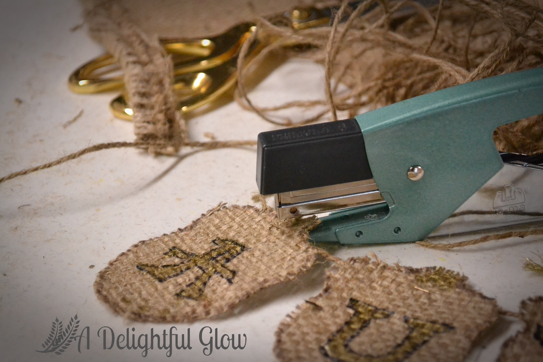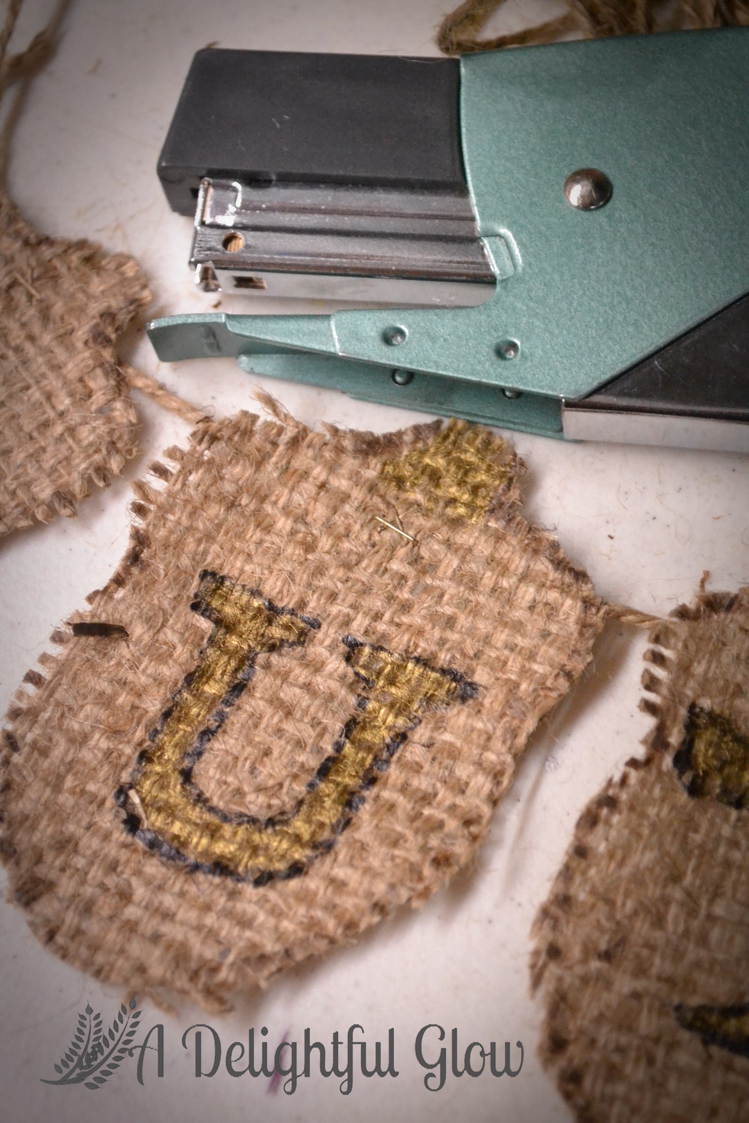 Once the lettering was finished, I grabbed my favorite stapler and stapled my acorns to my jute twine string to make them into a banner.