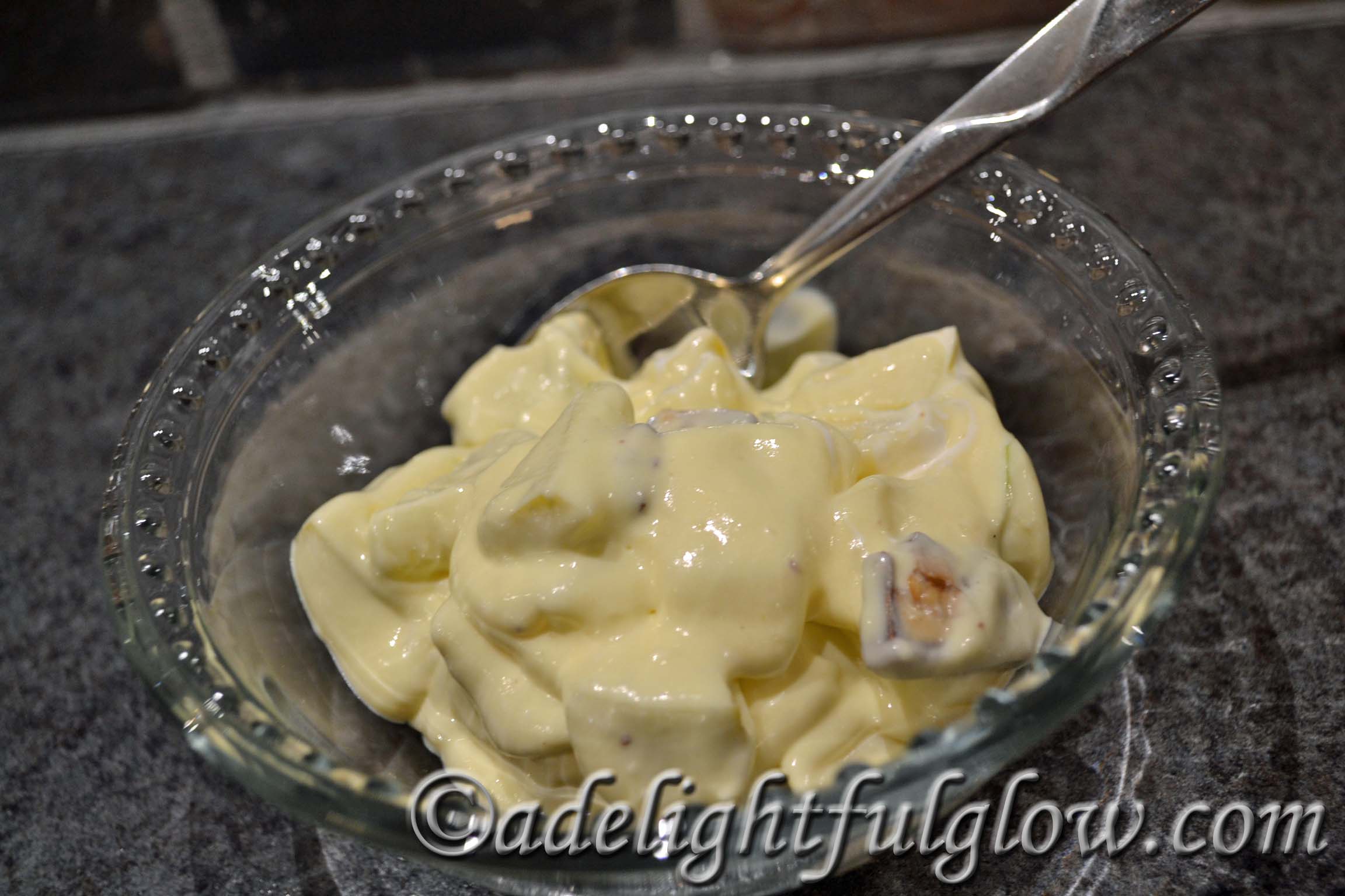 - Mix apples and Snickers into pudding mixture.