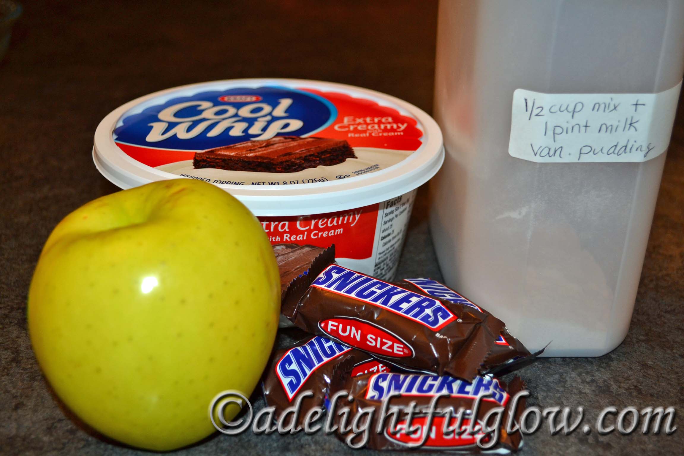 - There's really no sizes on the Snickers and Cool Whip. I just mix in the amount that looks good. And you could add more apples and Snickers, but not change the amount of Cool Whip and pudding. I like recipes that can be stretched and changed up...