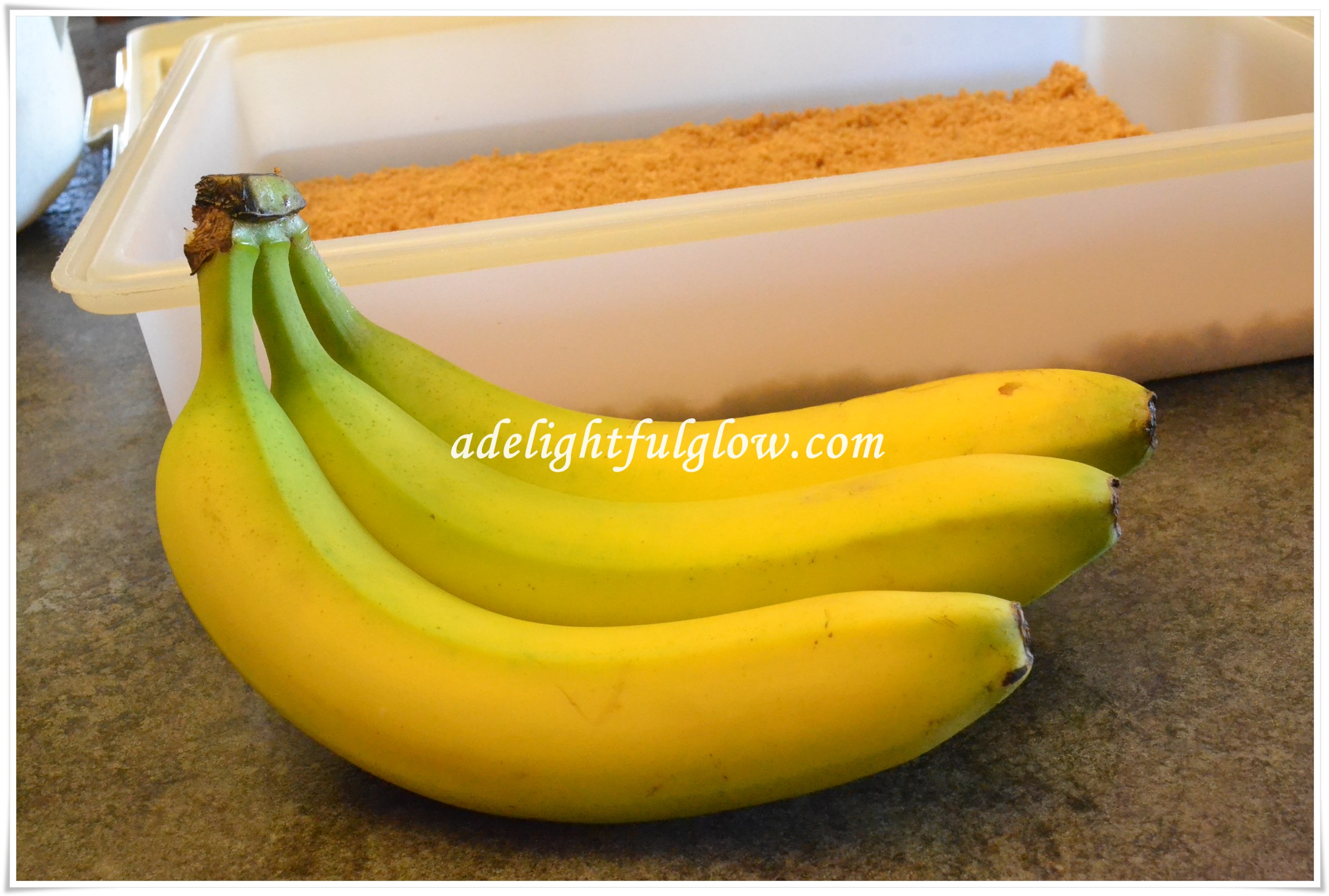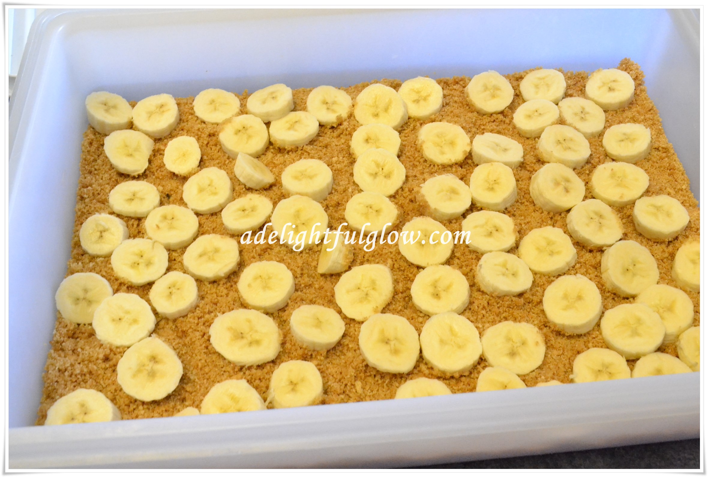 - Slice {chop into small pieces} bananas and layer on top of crust.
