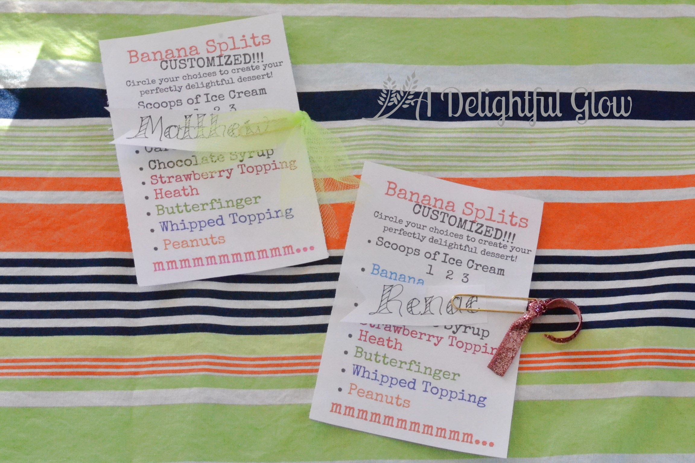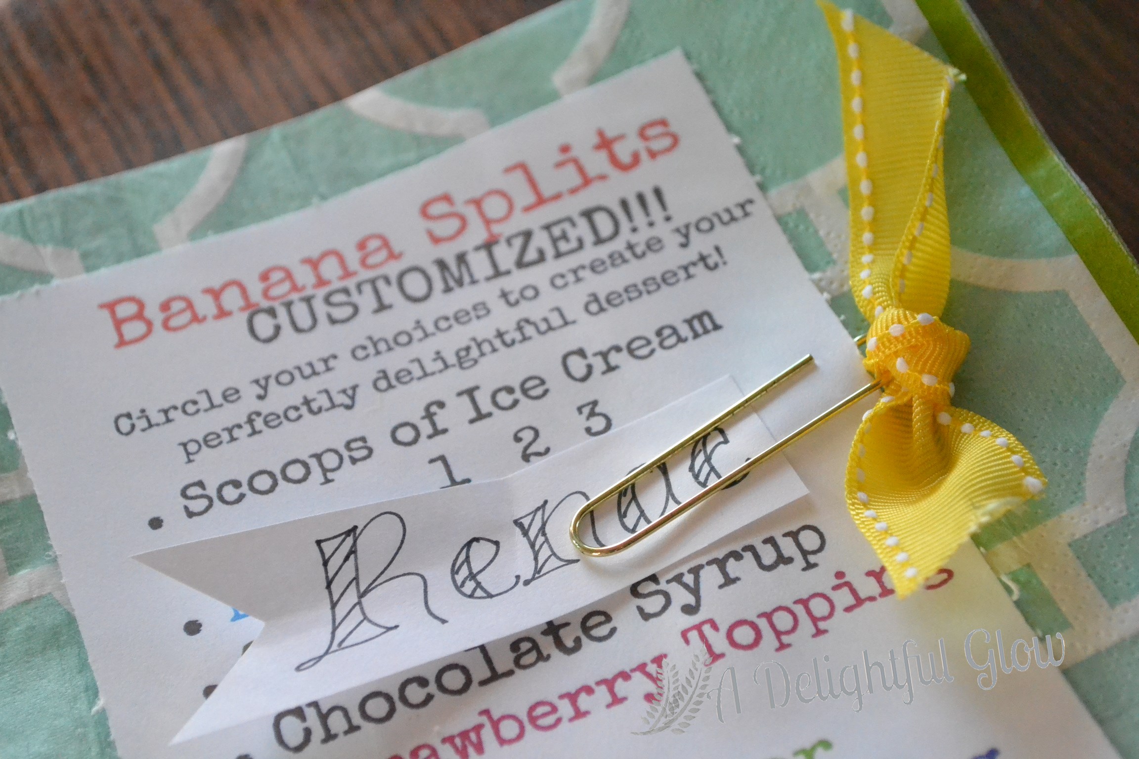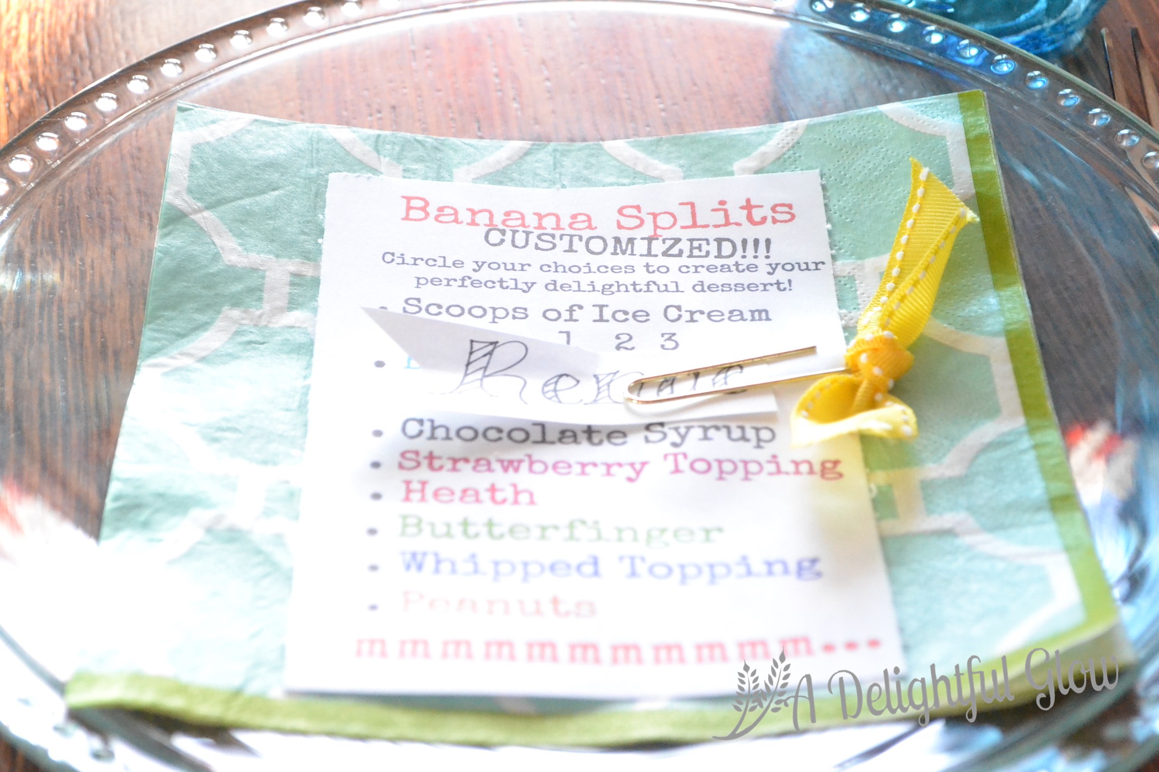 To print out your own Banana Split menus go over here! The only catch is you’ll have to want to use the same topping options as we used or get creative in changing it after it’s printed, cause they are what they are!! 🙂 And we totally stray from the original pineapple/strawberry/chocolate options.