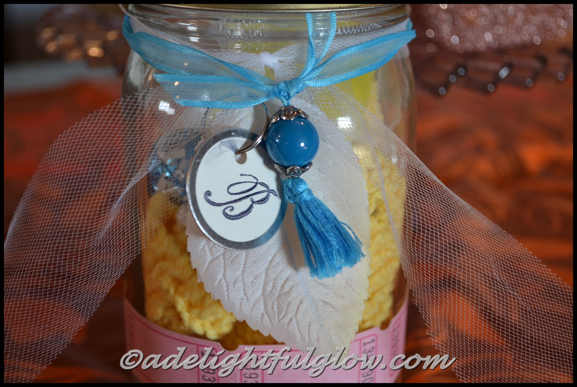 Hello to a gift in a jar! My mother told me about being invited to a birthday party and she was supposed to bring a gift in a jar! I thought it was a fun idea, so I borrowed it for the birthday tea party!