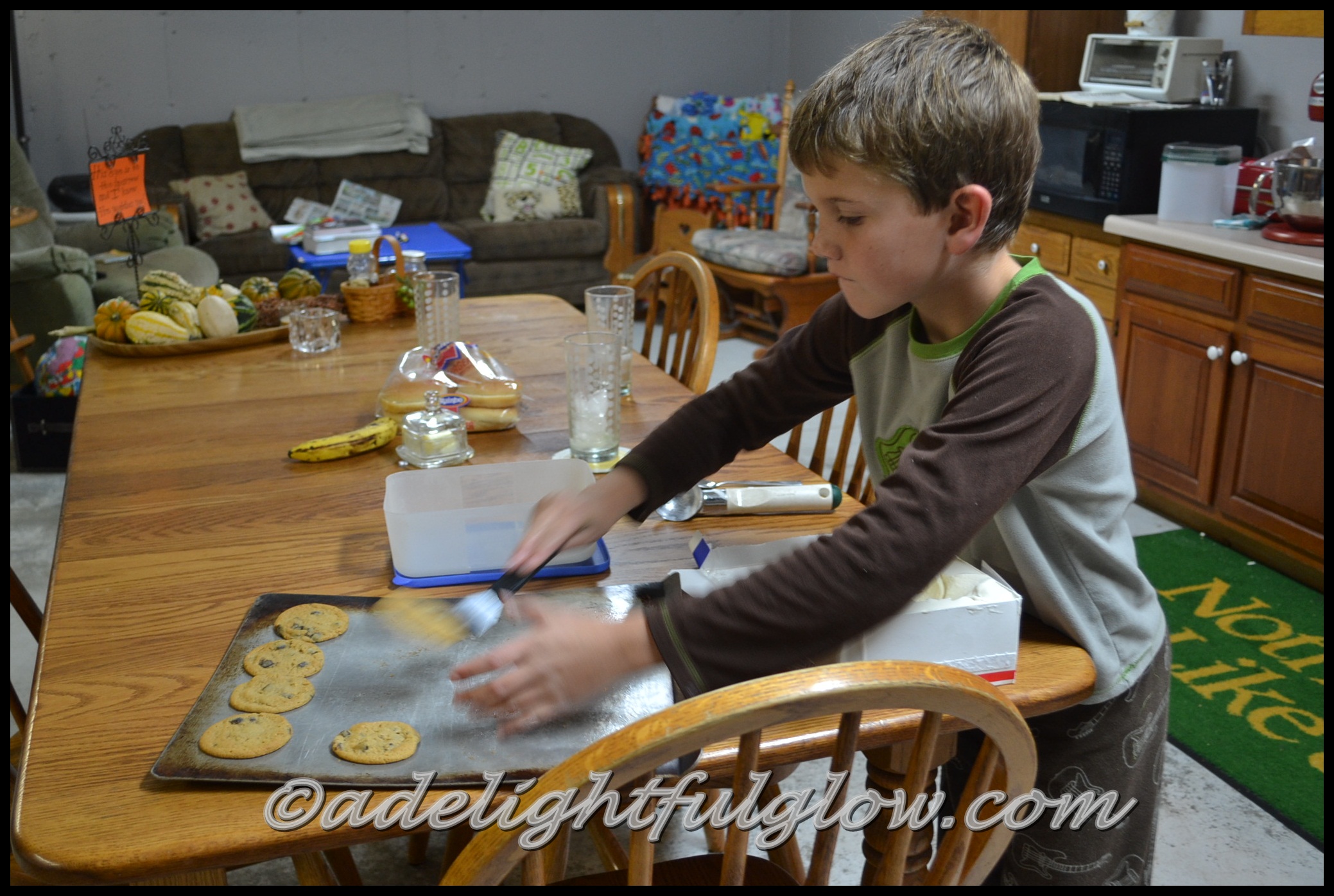 I made butterhorns last week, too, and thought of all of you cause I know you all like them so much. Would have loved having your good helpers here to help me. There were no 2 gift jars alike at the party I went to. So fun to see everyone’s ideas. Your jar gift looks so neat. The first pic of the butterhorns being rolled out makes me think of my Grandma Garber. Tucker is holding his mouth the way I remember her doing.Same thing in the first pic of him taking cookies off the pan. Love seeing them work in the kitchen. Your butterhorns are beautiful. Good job, Renae and Tucker!