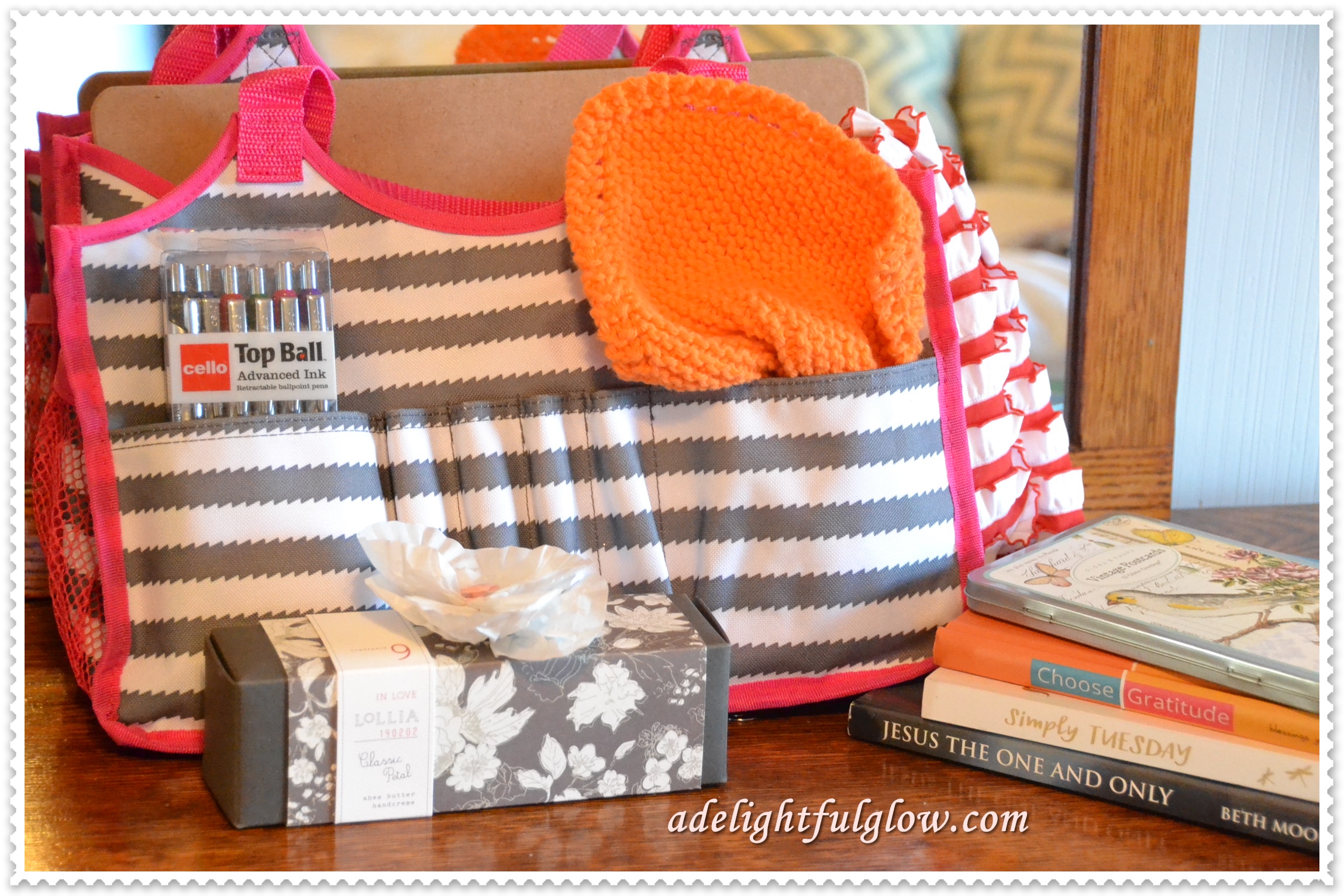 This giveaway package comes in a gray and white striped Thirty-One bag with pink accents. I have a bag like this and love it. Thirty-One is one of my favorite companies. Every bag I have from them, I simply love.