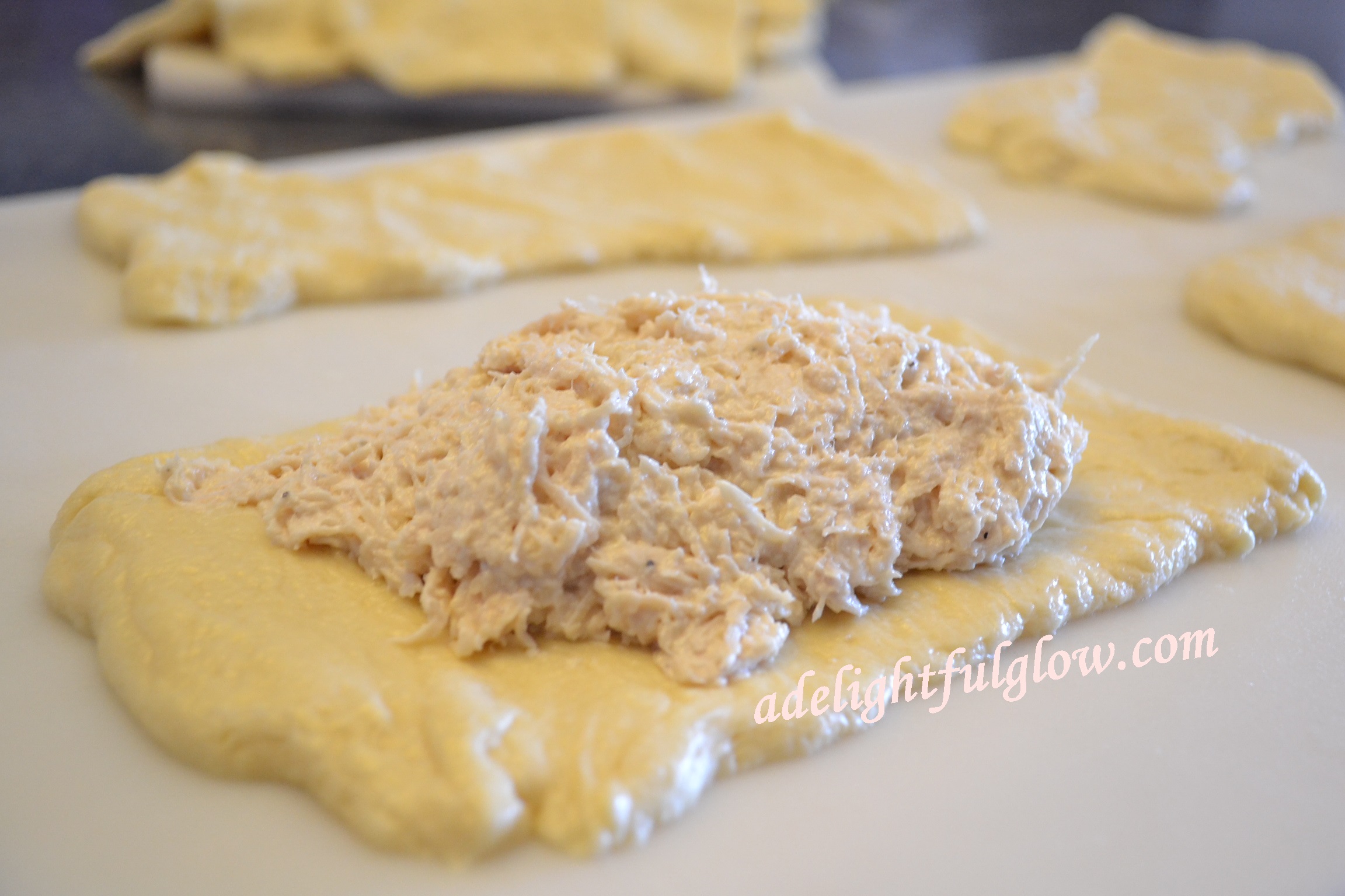 Spoon 1/2 cup chicken mixture evenly onto each rectangle.