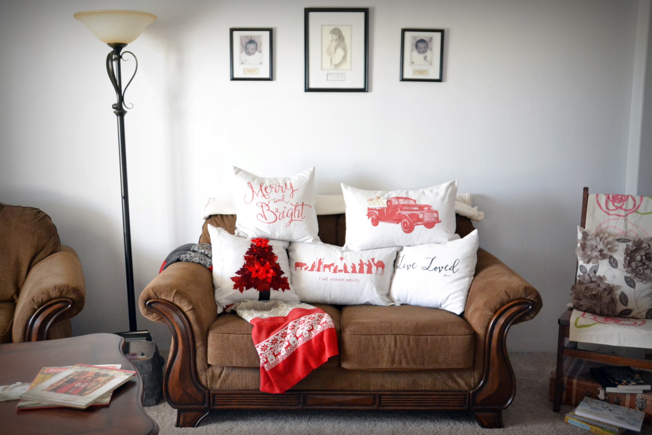 {I am totally smitten with my Poinsettia Tree pillow.}