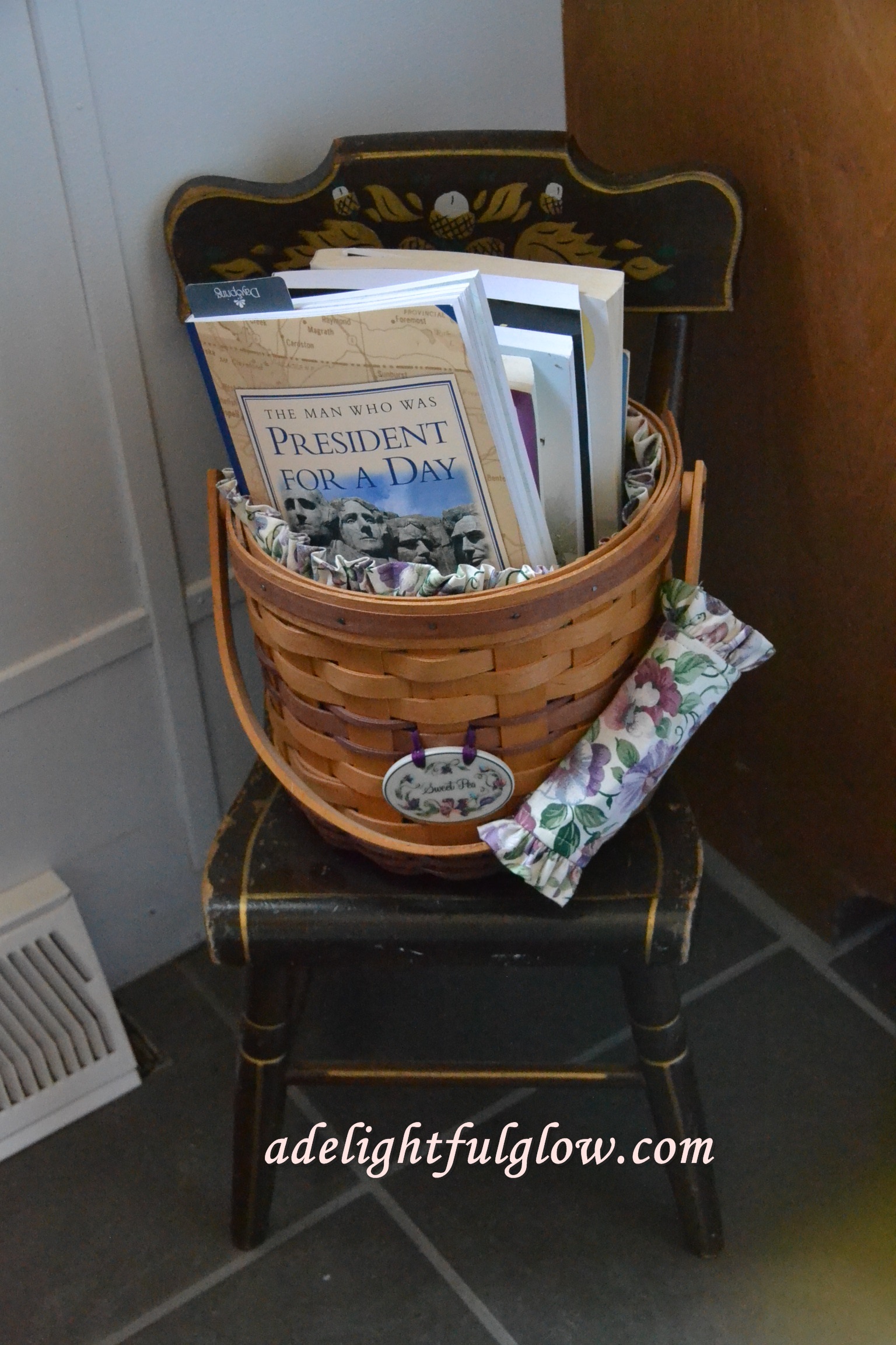 I’d been wanting somewhere to set this basket in our bathroom and was happy when I thought about using this little chair. I love using things with memories attached and this chair has them! My aunt and uncle gave it to me when I was young. I always liked it and then I had two chubby, baby people that used it and loved it. My aunt died from cancer when my daughter was little, and my memories of her are dear. The chair reminds me.