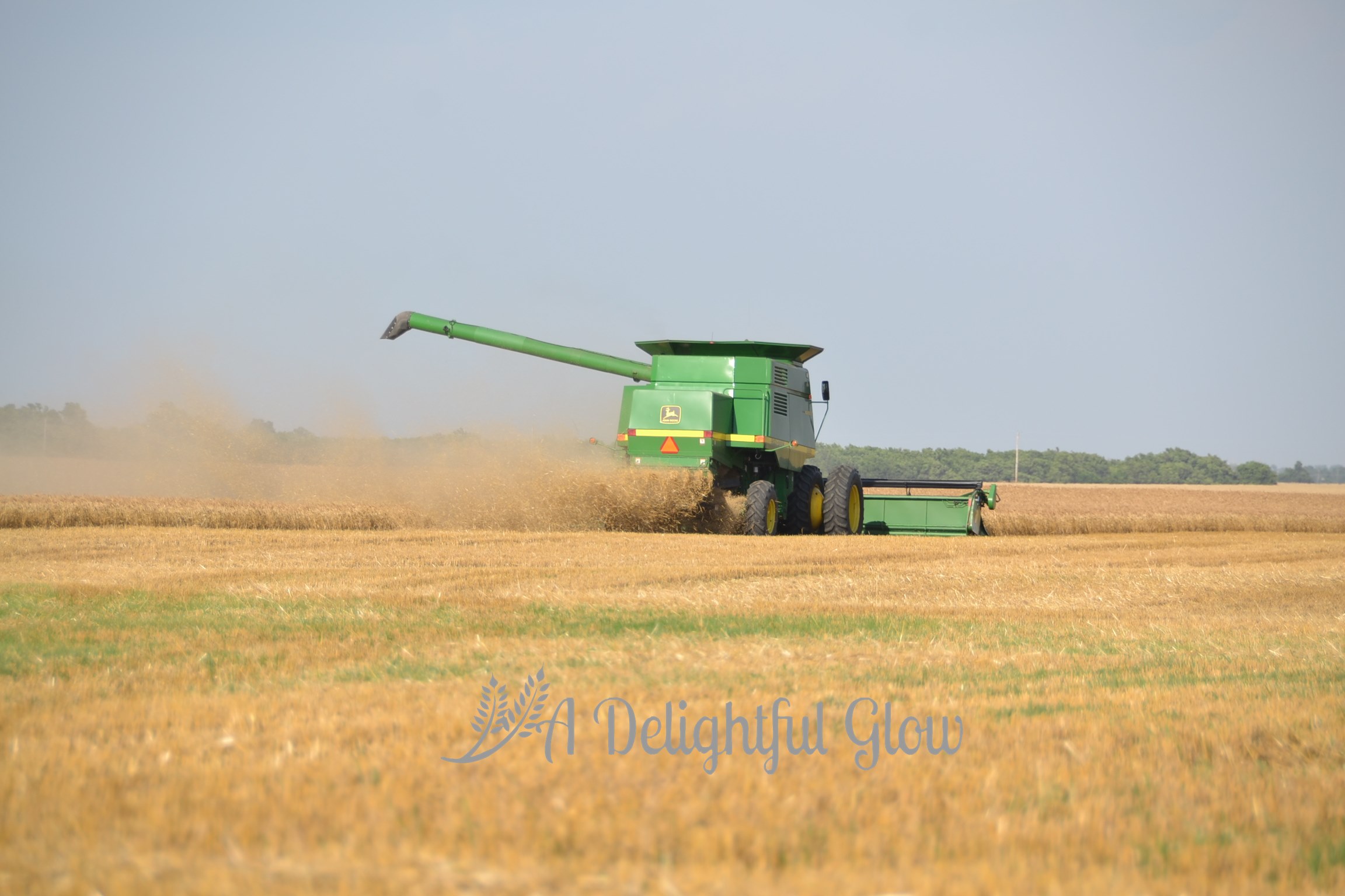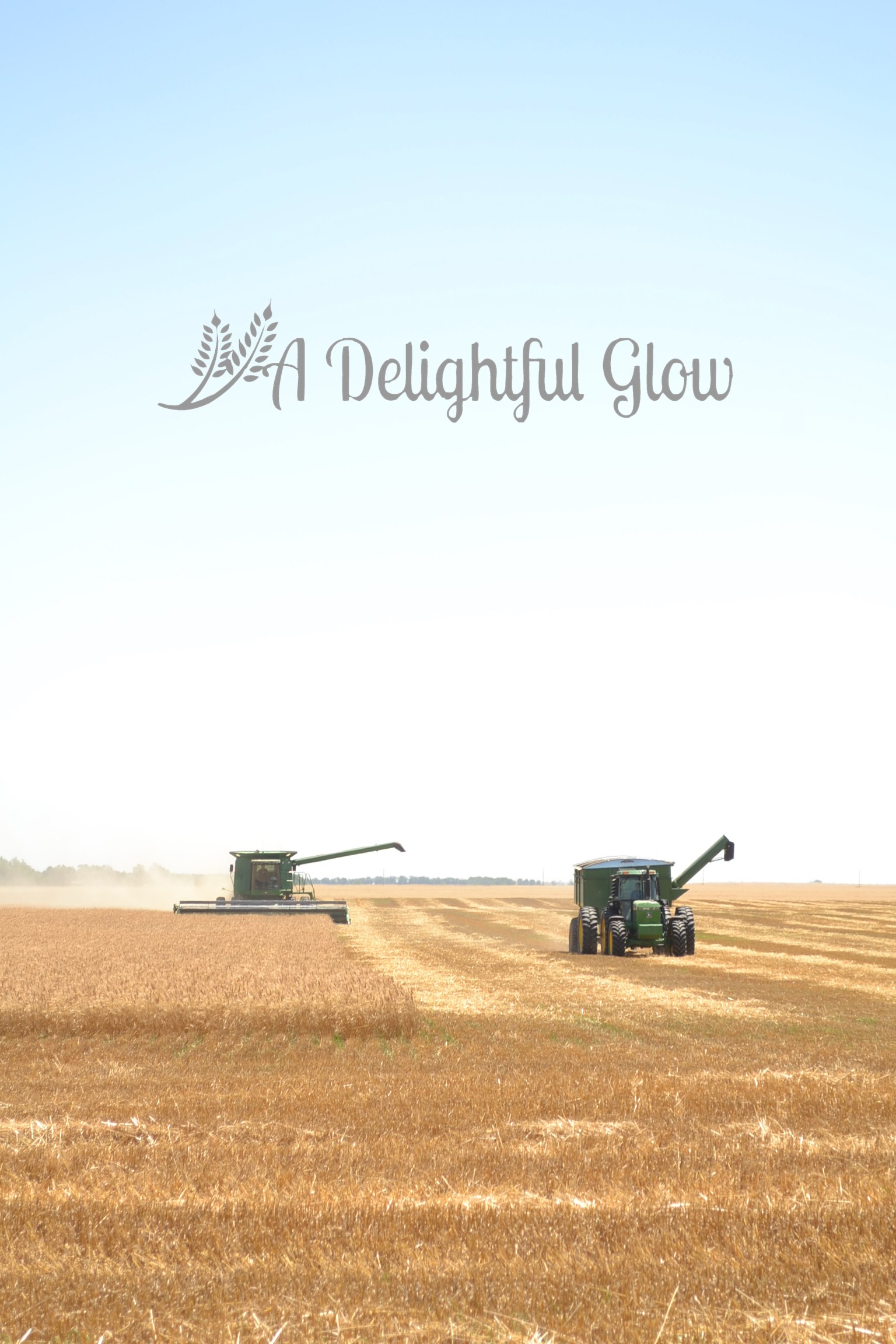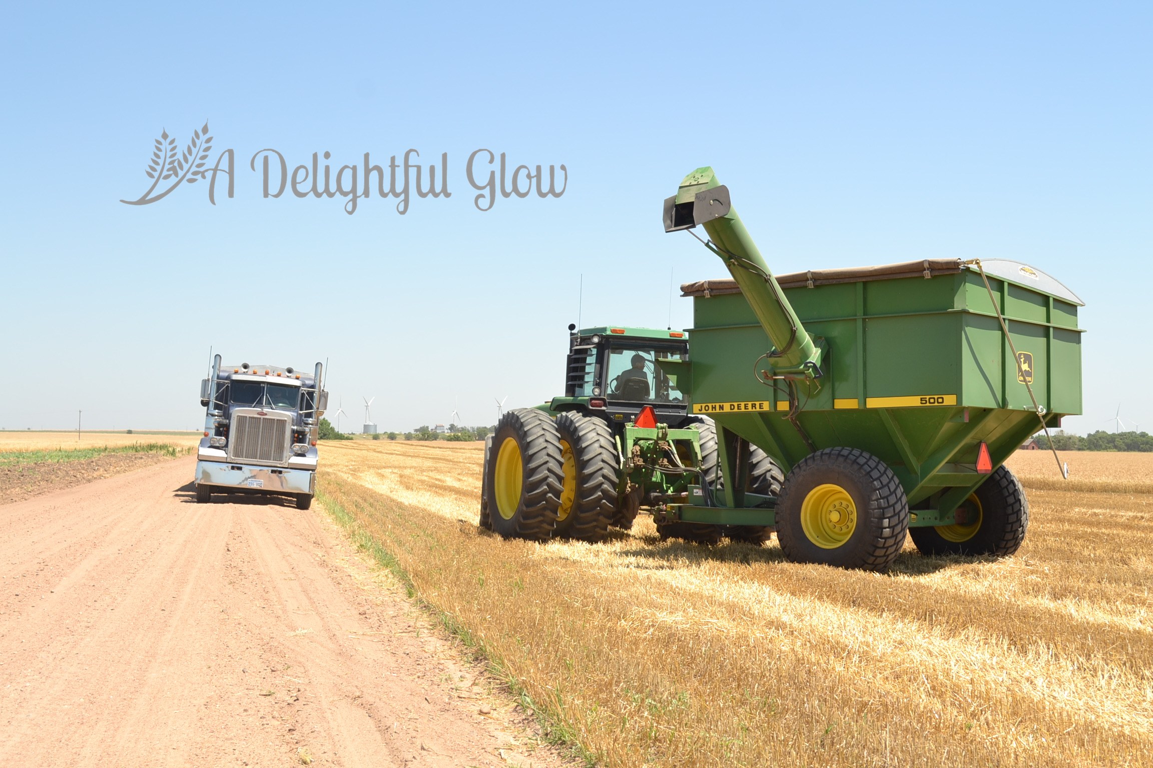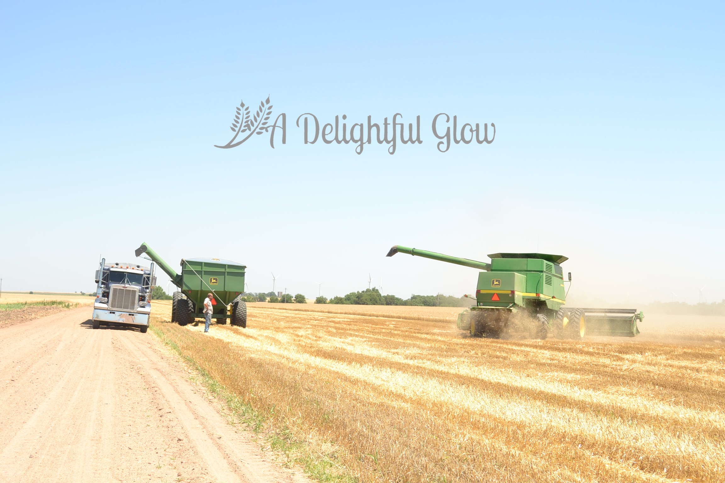 These pictures are the essence of Kansas–blue, blue sky; golden wheat; and some nice John Deeres! : ) I love the ones with the bit of dirt road. I miss those roads. I miss the wheat. They have corn here in Indiana, and the fields are so ugly most of the year. The wheat fields are beautiful at every stage.
