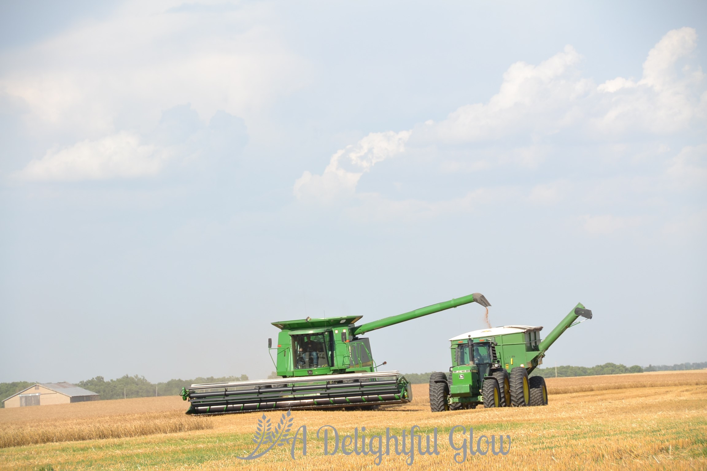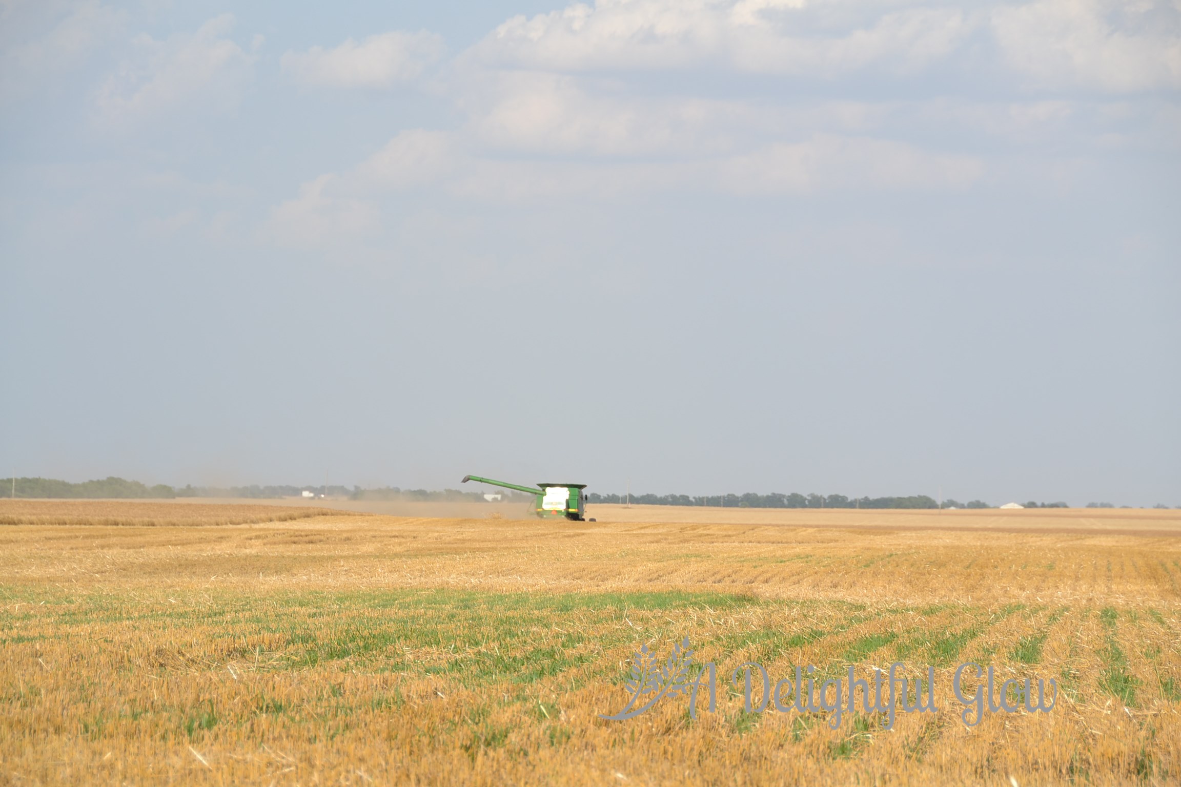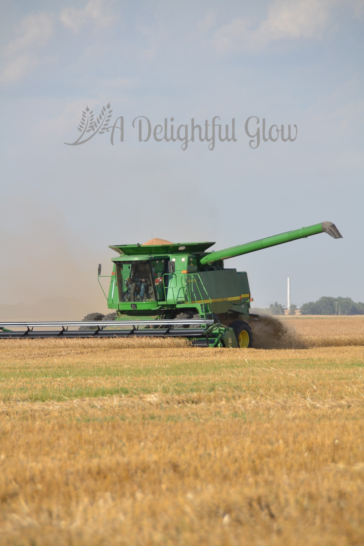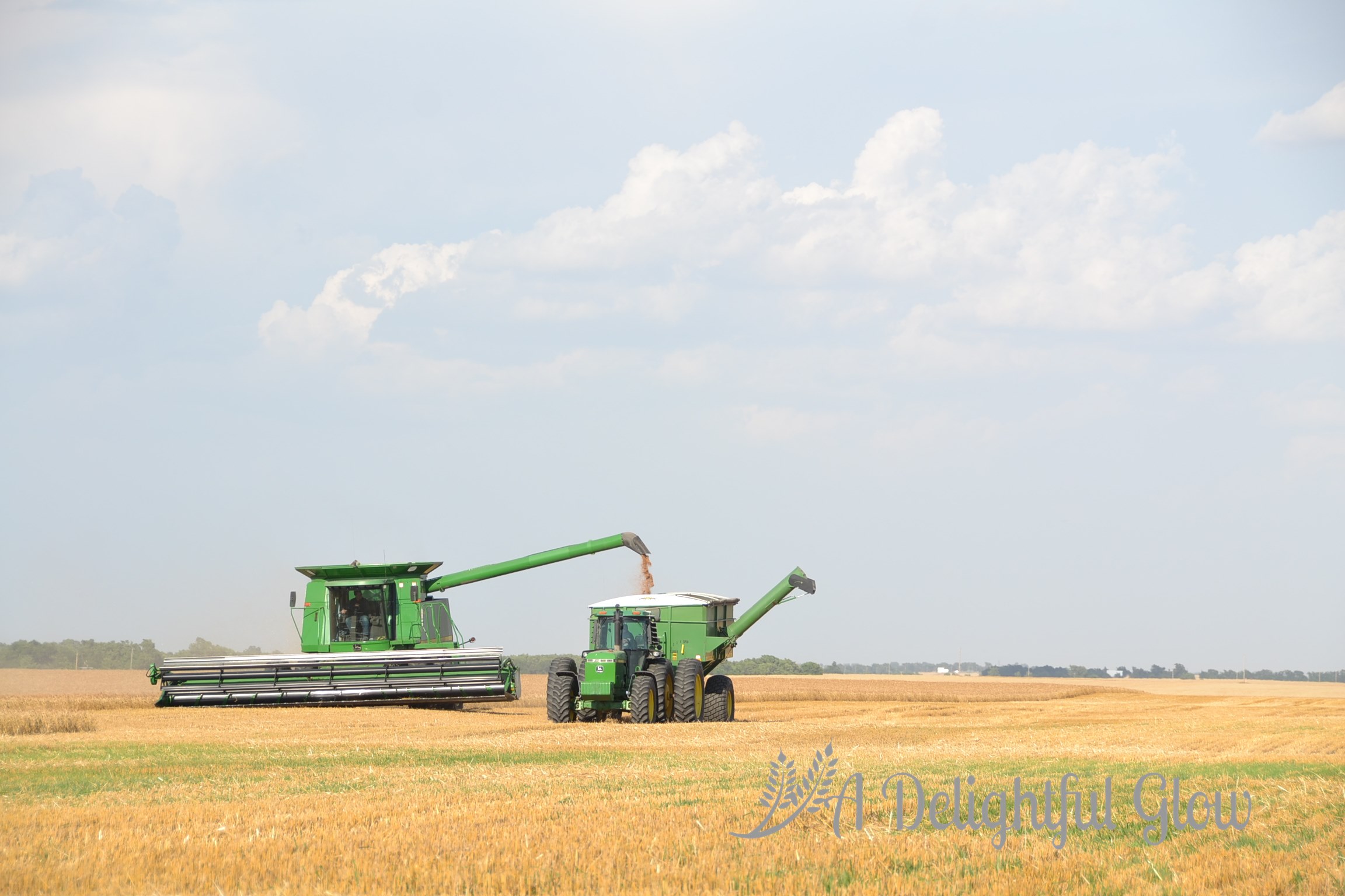 These pictures are the essence of Kansas–blue, blue sky; golden wheat; and some nice John Deeres! : ) I love the ones with the bit of dirt road. I miss those roads. I miss the wheat. They have corn here in Indiana, and the fields are so ugly most of the year. The wheat fields are beautiful at every stage.