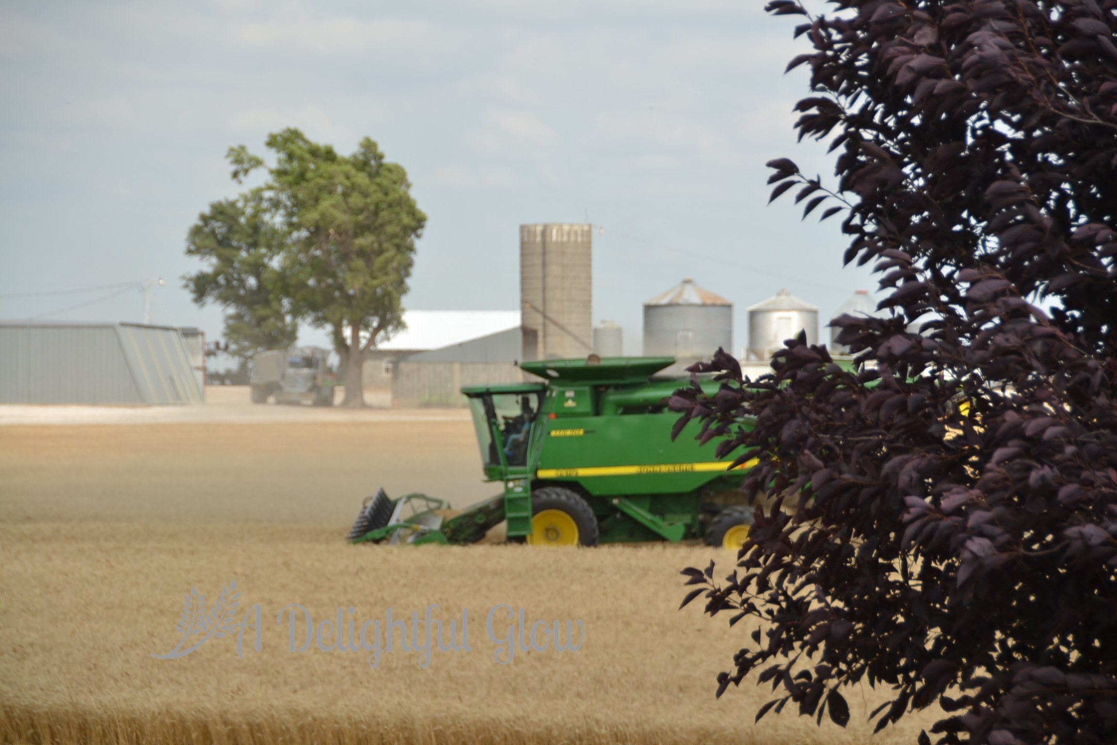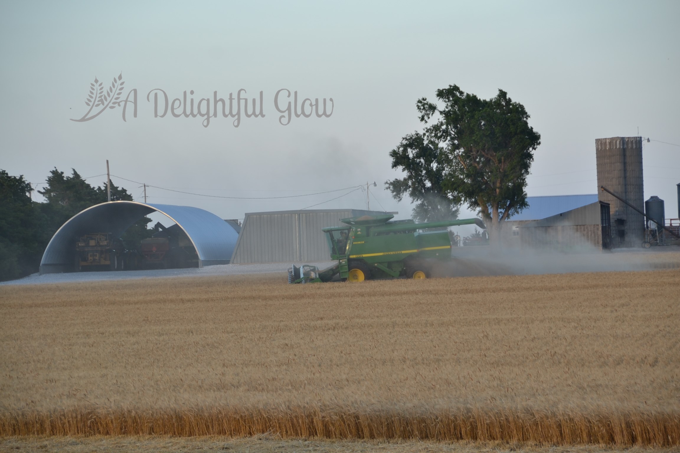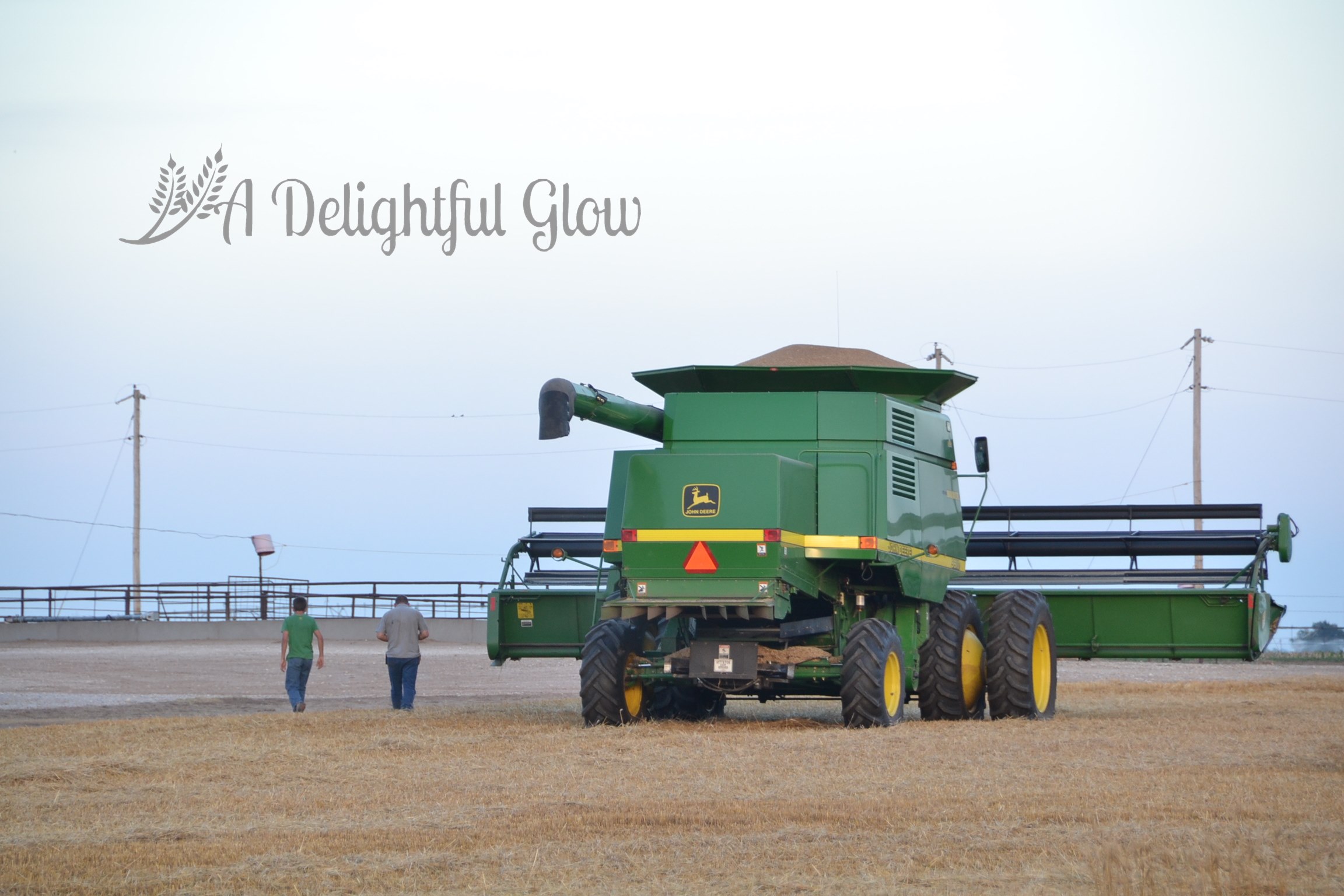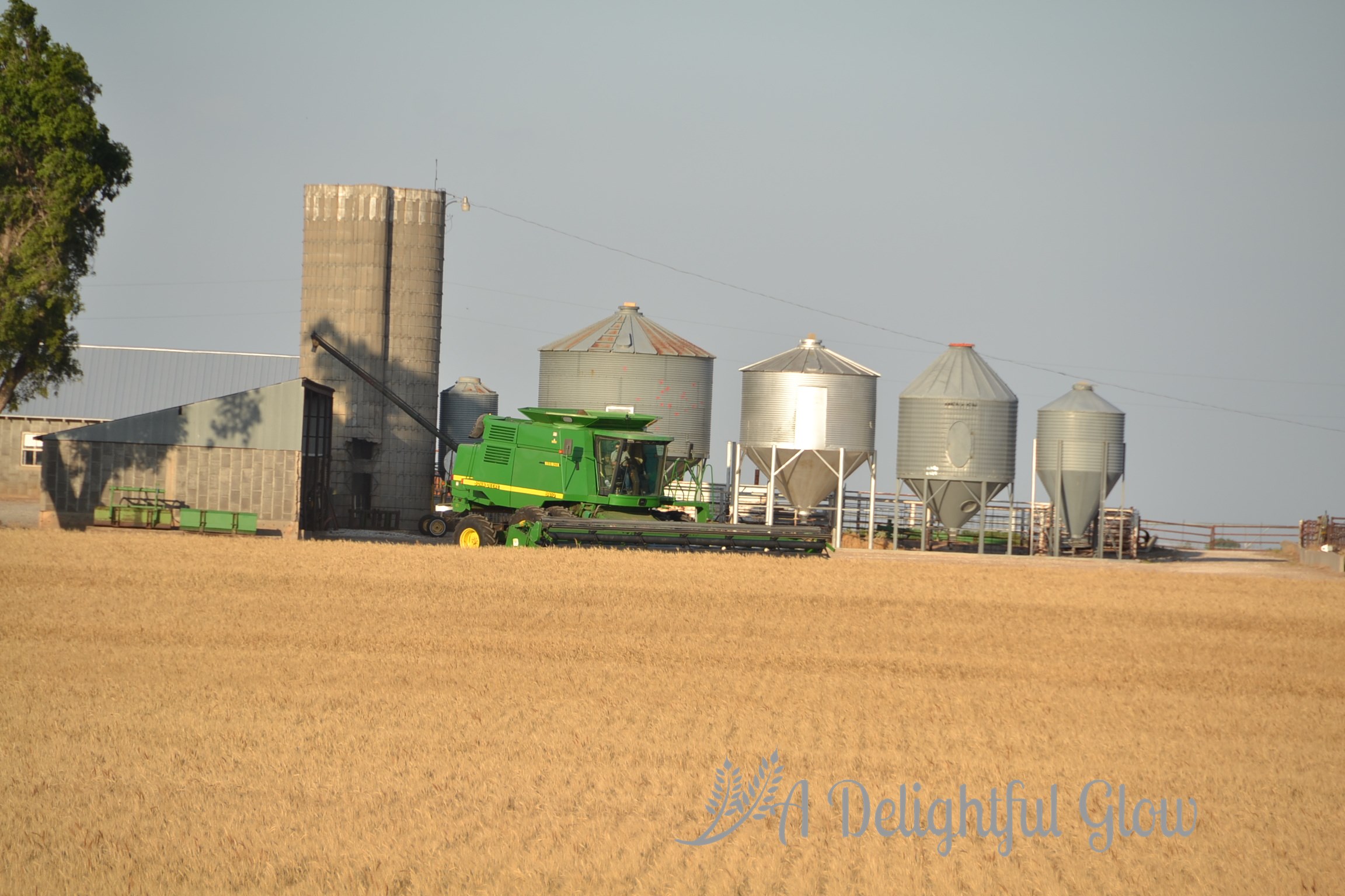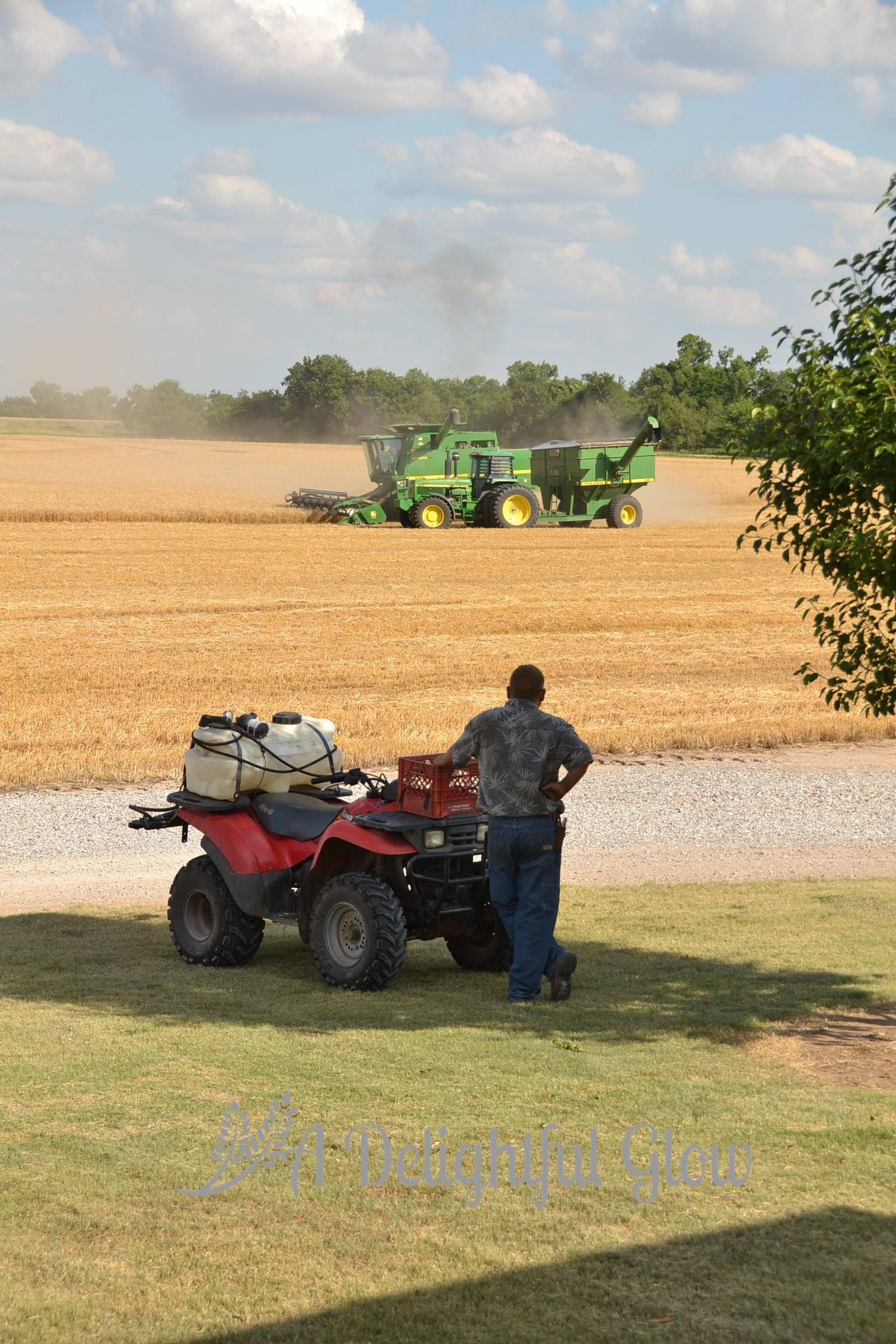 Tuesday morning we had a tiny shower again. Late afternoon, the combine fired back up and we did get some acres cut. Mr. Matthew was cutting the small field right beside our house. I always love it when he’s working so close. It makes for porch-sitting and watching, great photo opportunities and easy-easy to deliver meals or drop by the kitchen for food or an iced tea and easy access to go ride with him.
