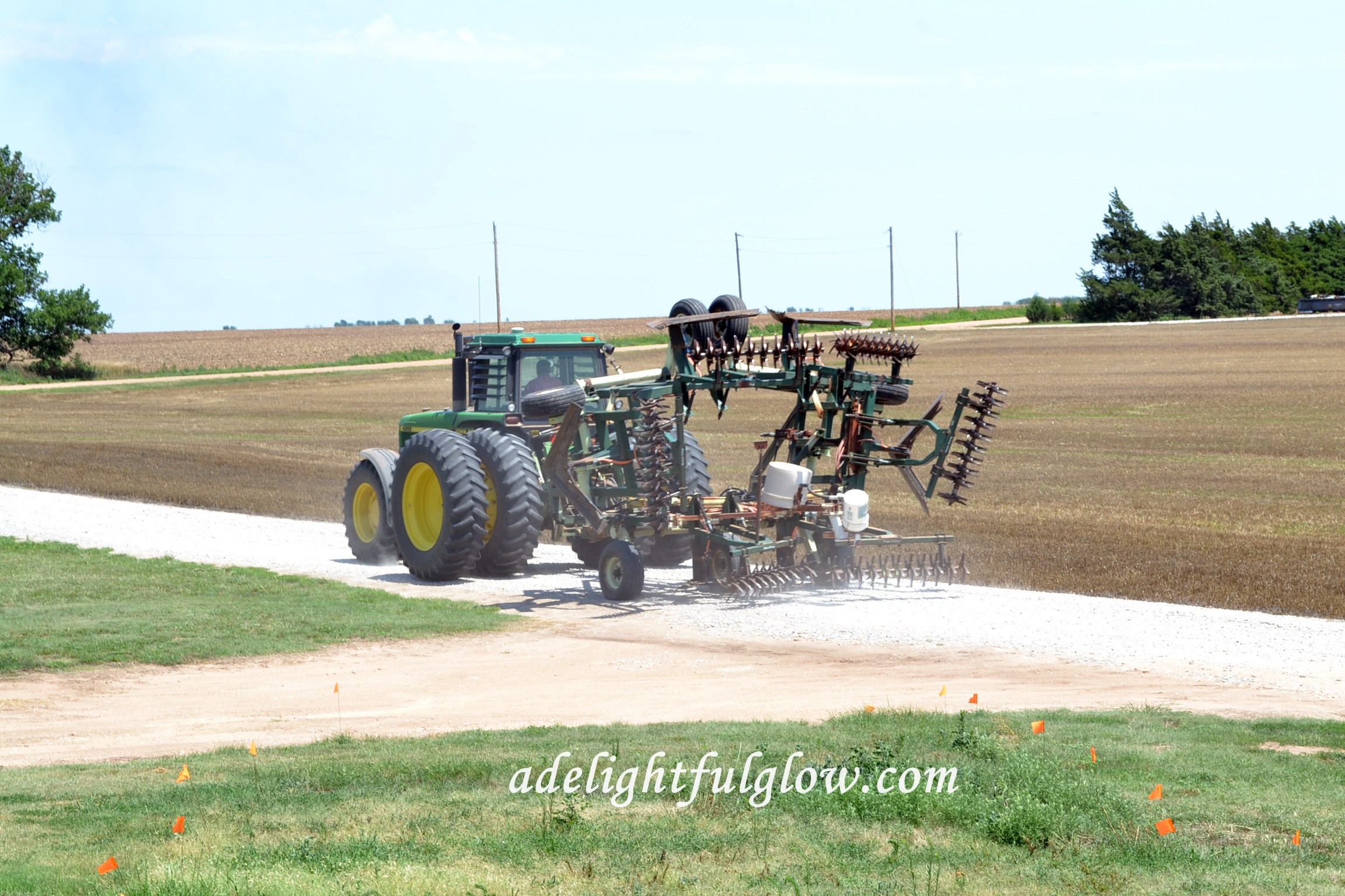 Hello to walking and washing sheets and phone calls and fixing a casserole for some neighbors and riding along with my man to get a load of gyp and picking up cold meat that was slivered and ready and hello to fieldwork and starting systems and cutting down sweet corn stalks to feed to the cows in our pasture. This chore was extra fun for the boy on our farm because the sprinkler was running in the garden and he chopped away anyway. And hello to putting pictures on cd to send off in the mail and to renewing my blog and to little things like cleaning out drawers and combining the two bags of peppermints that were both open, on Friday.