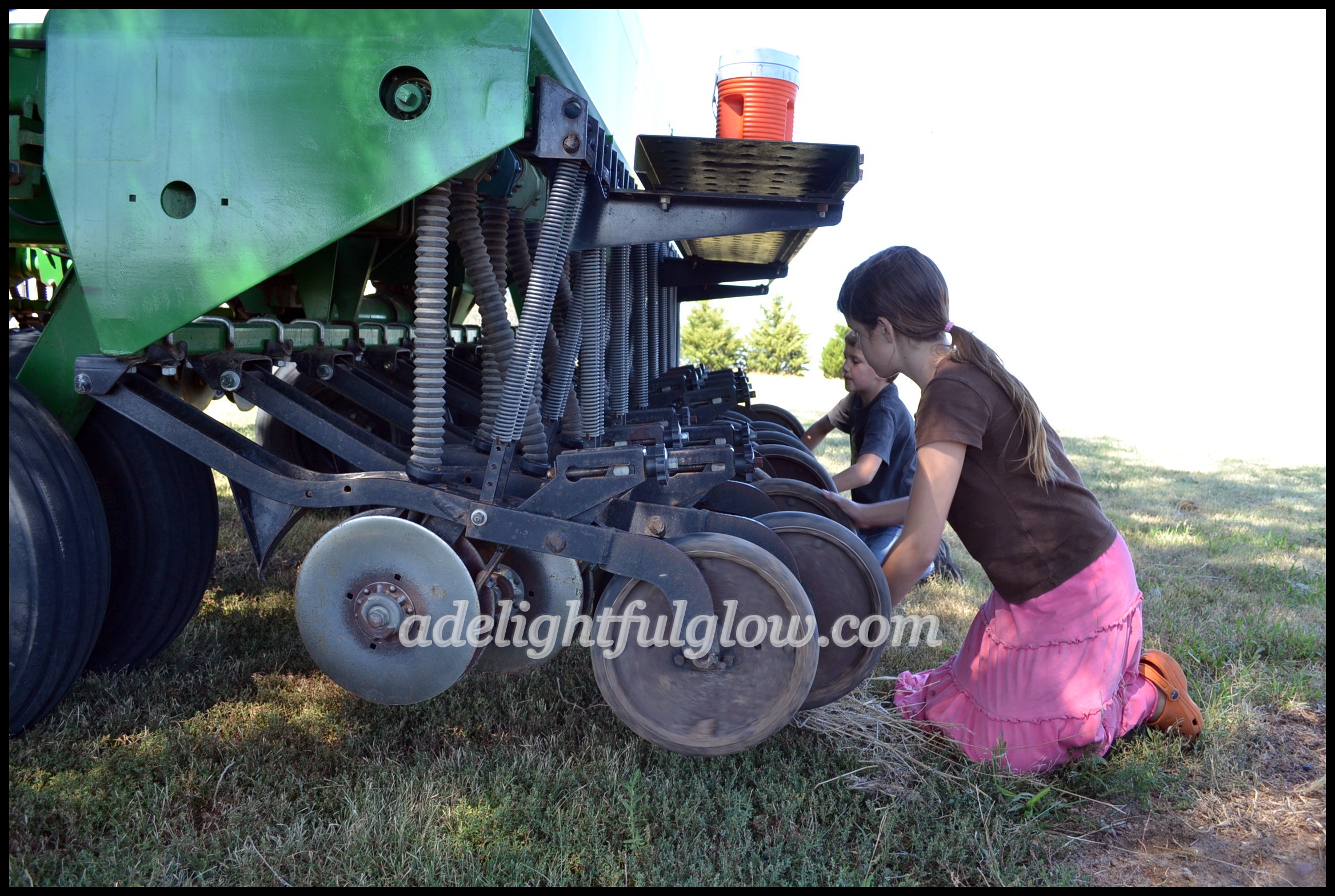 I looked and looked at the picture of the kiddos behind the grain drill, trying to figure out who was who! It looked like R in the skirt til I got to the head and then it looked like T. Now, I was certain T would NOT be wearing a skirt so why did it look like him? Finally, I saw the ponytail hanging down. Didn’t know their heads looked so much alike! LOL Sounds like you had a good week.