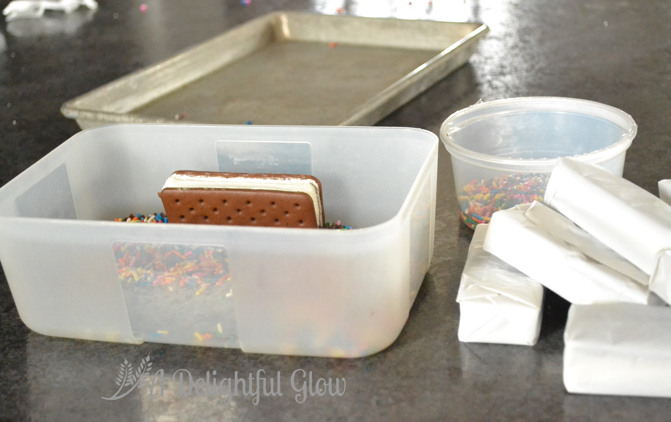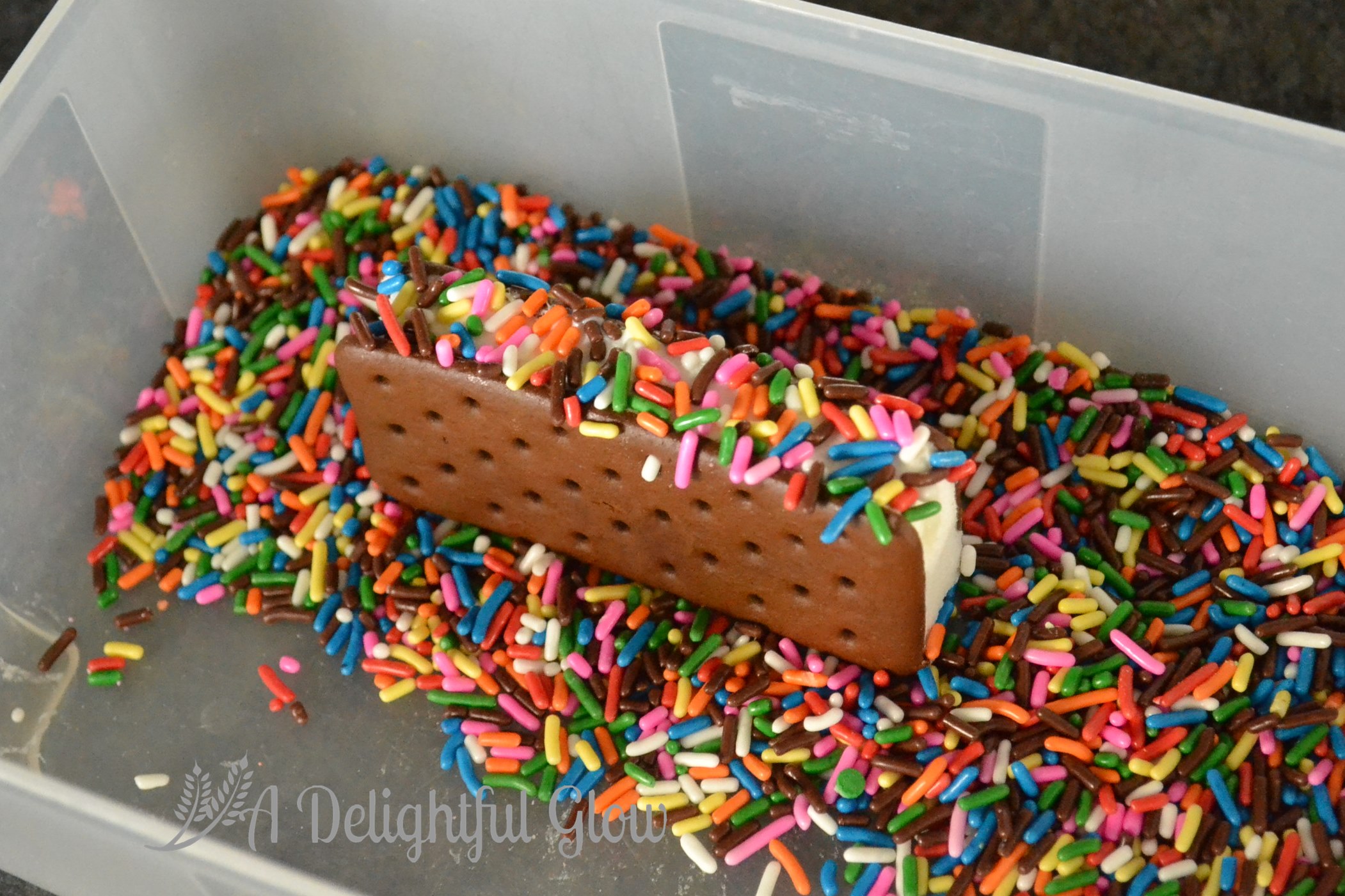 I picked up a pack of mini ice cream sandwiches and I dipped all the edges in sprinkles for flair!