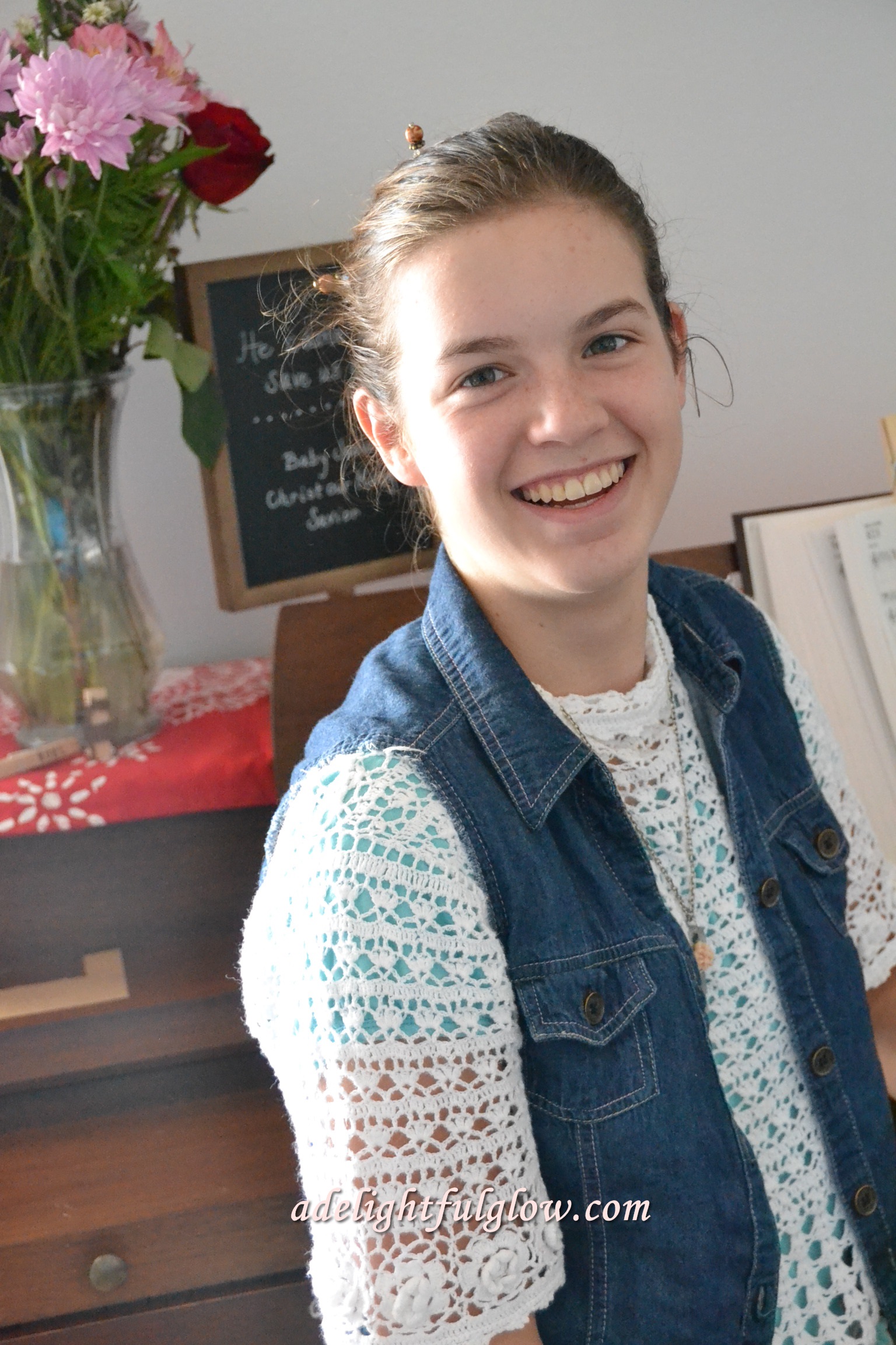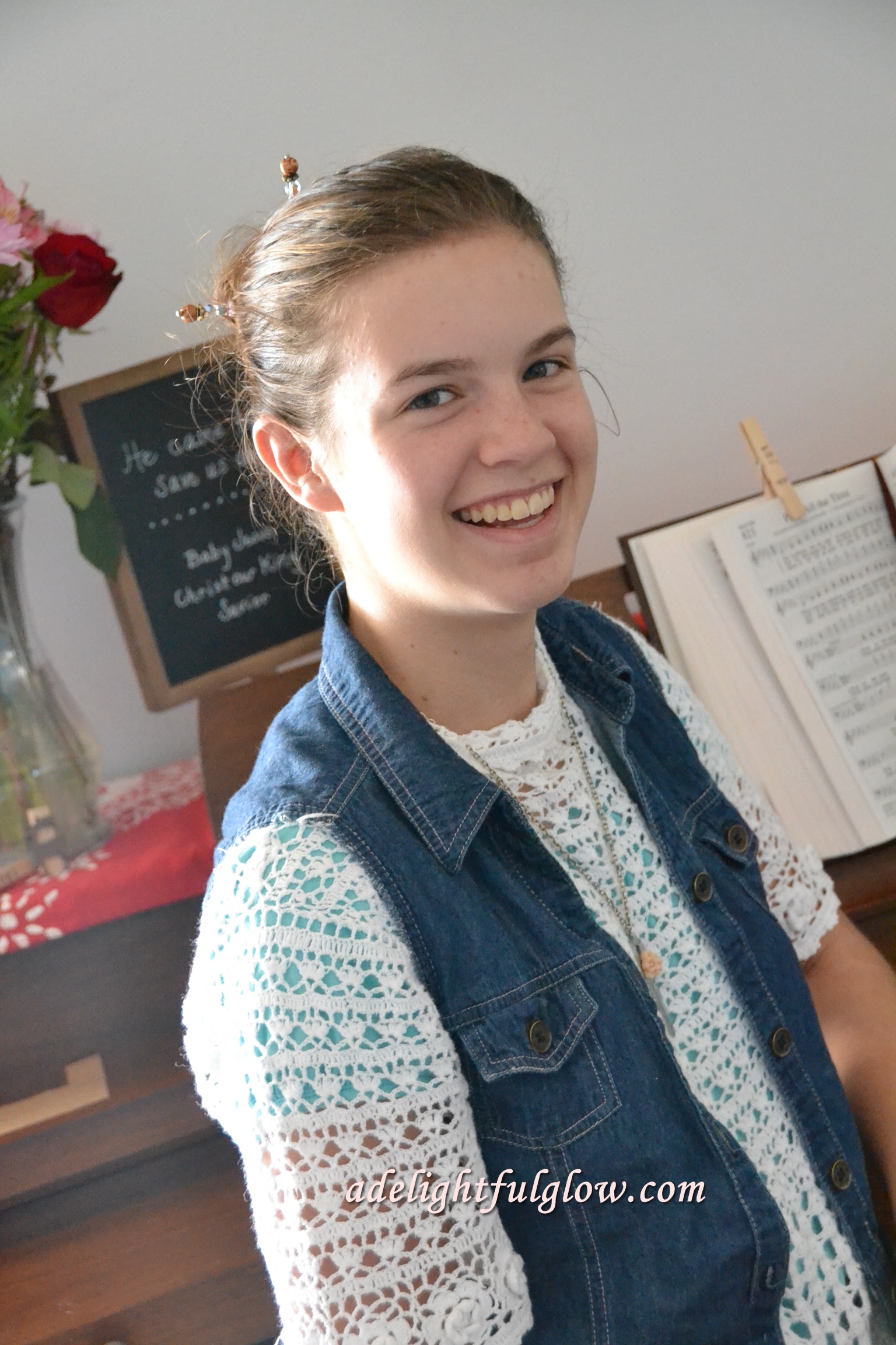 I really like the vest with this white sweater. I’ve always liked the look of denim and lace and denim and pearls.