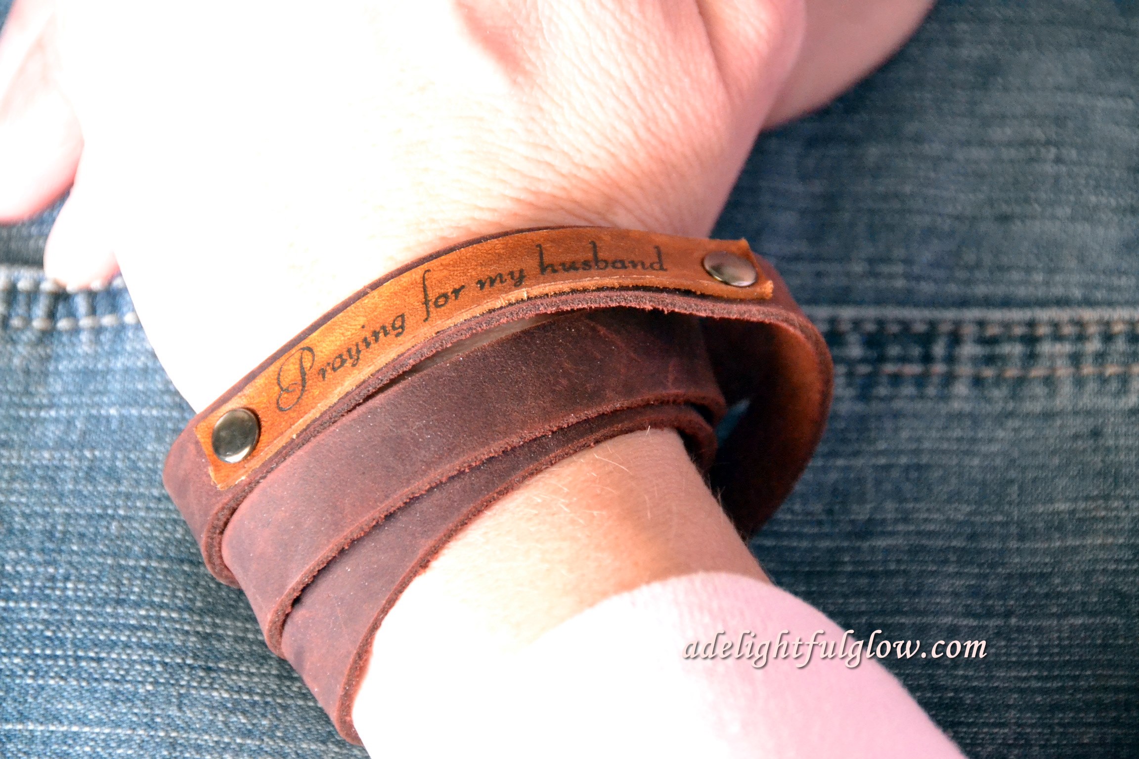 Something else you could do with this besides wearing it as a wrap bracelet is to wrap it around a mason jar used as a vase or a drinking cup or wrapped around a crock or glass container holding utensils in your kitchen. Basically, anywhere that it would be a visual reminder. Plus, I like the leather look. So pretty!