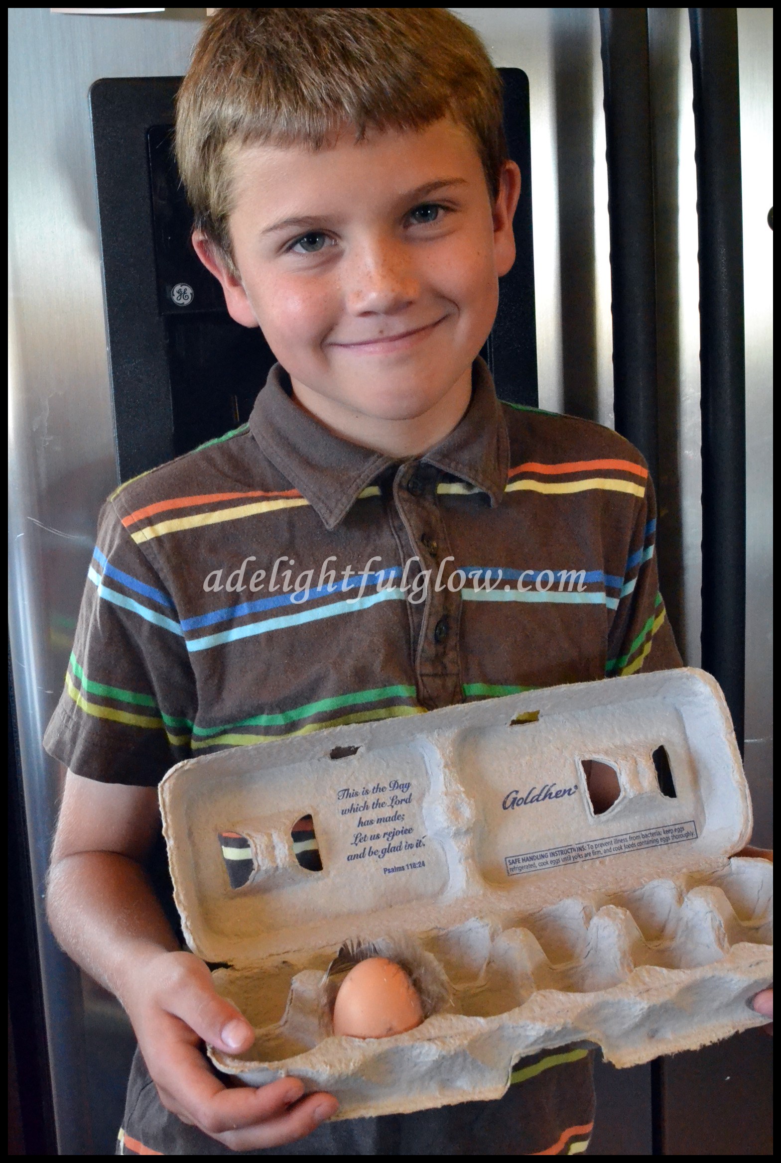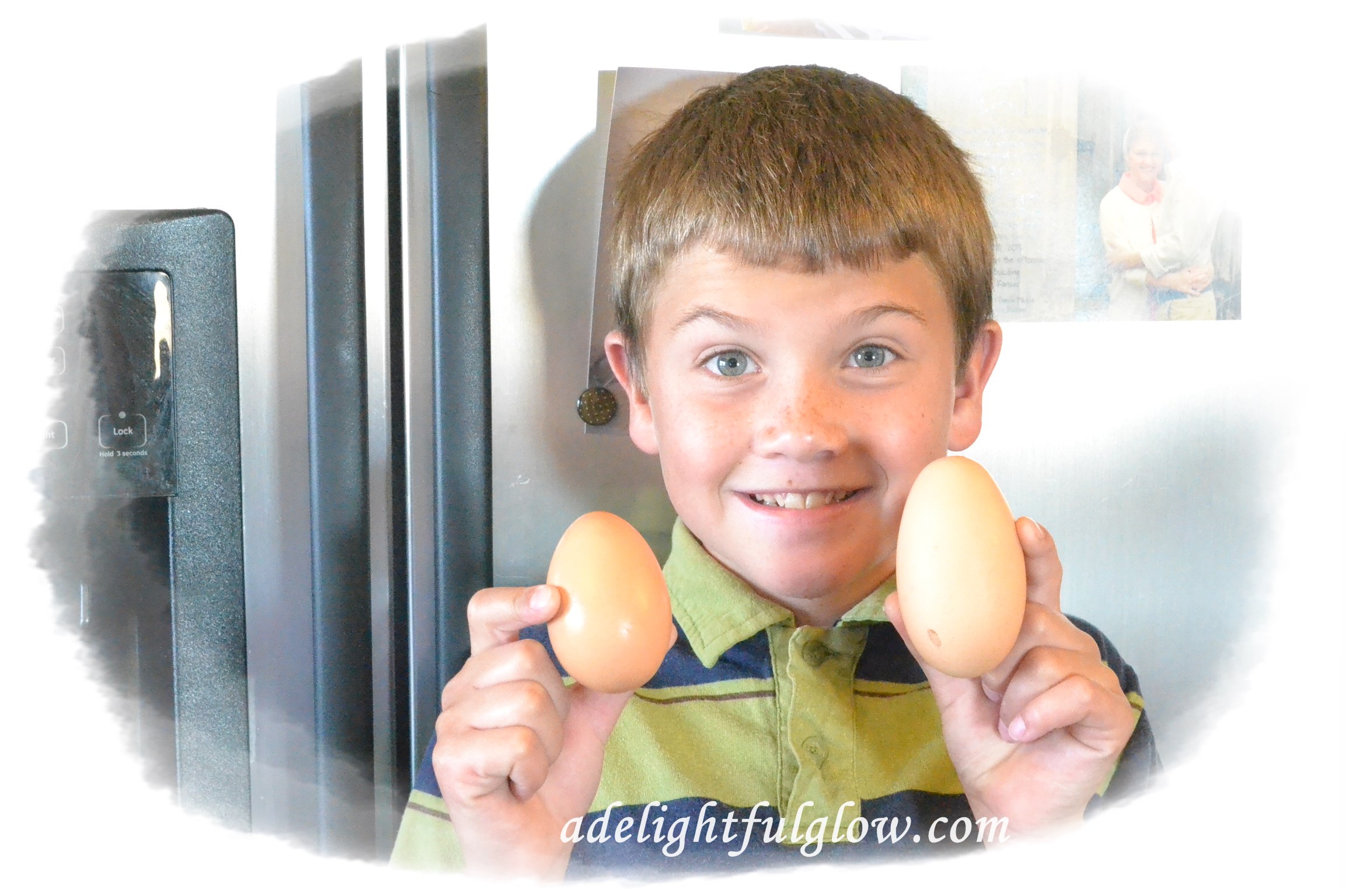 Hello great big eggs! Kiddos are doing chores for neighbors and “picking” eggs from their chickens. They found two huge ones! Tucker was excited with them. They both contained double yolks.