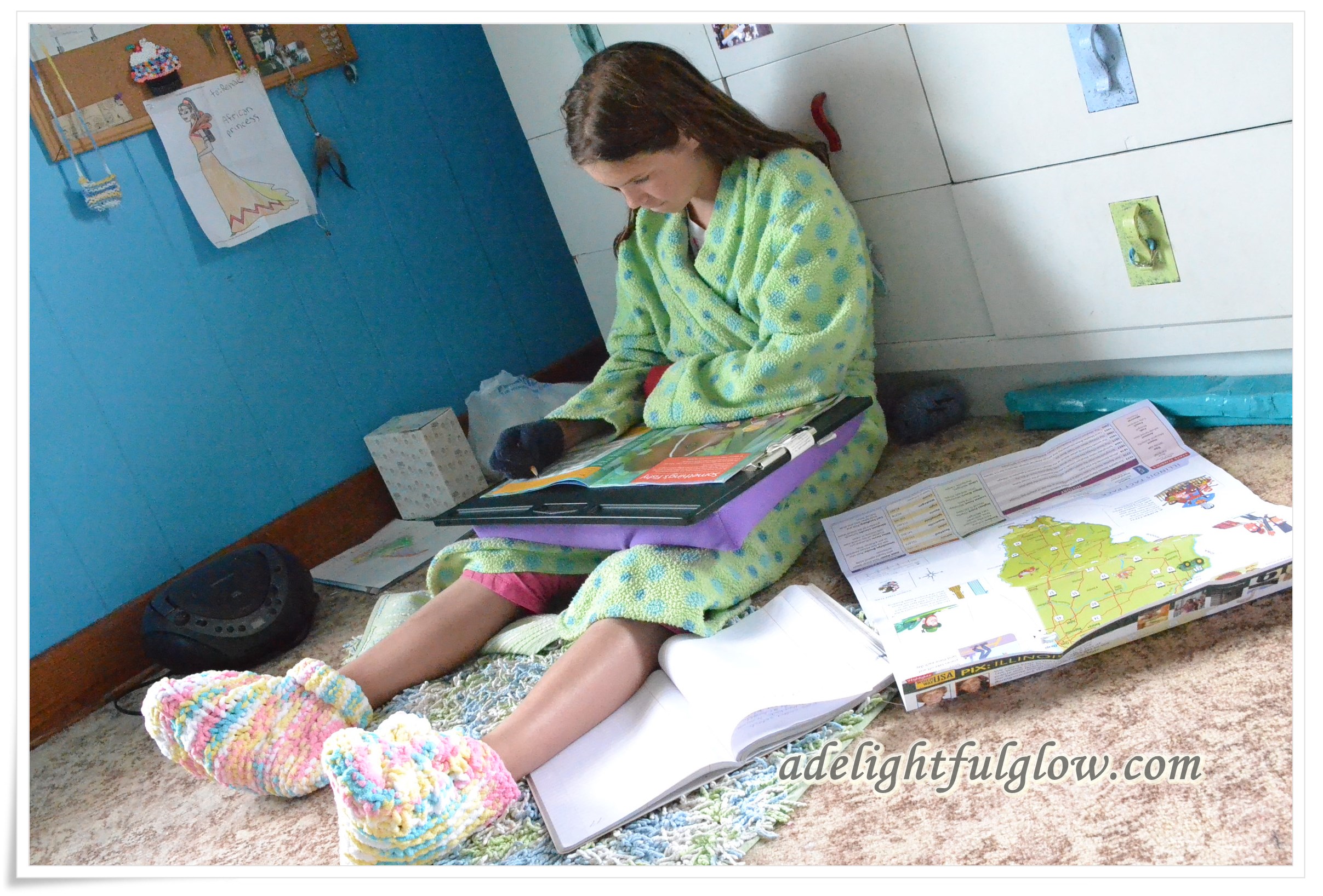I happened to go upstairs and found Renae all cozied up in her robe and slipper socks, so I went back down for the camera. I knew you would especially appreciate the photos. The kiddos had been out swimming, so she was cold.