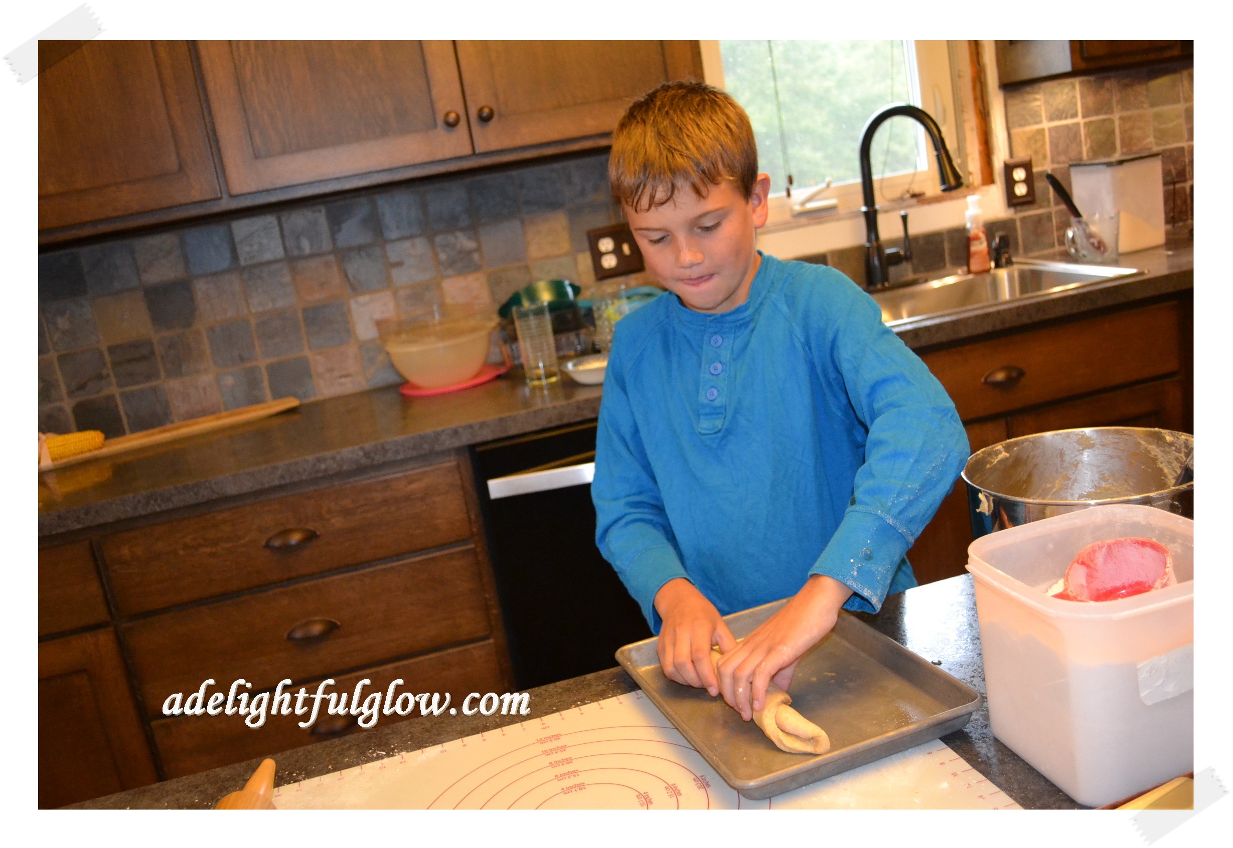 My son came around about the time I was ready to roll out the dough and form the rolls, so I enlisted his help. He rather likes to roll up rolls. He thought it would be fun to make a gigantic butterhorn, so I said, “Go for it.”