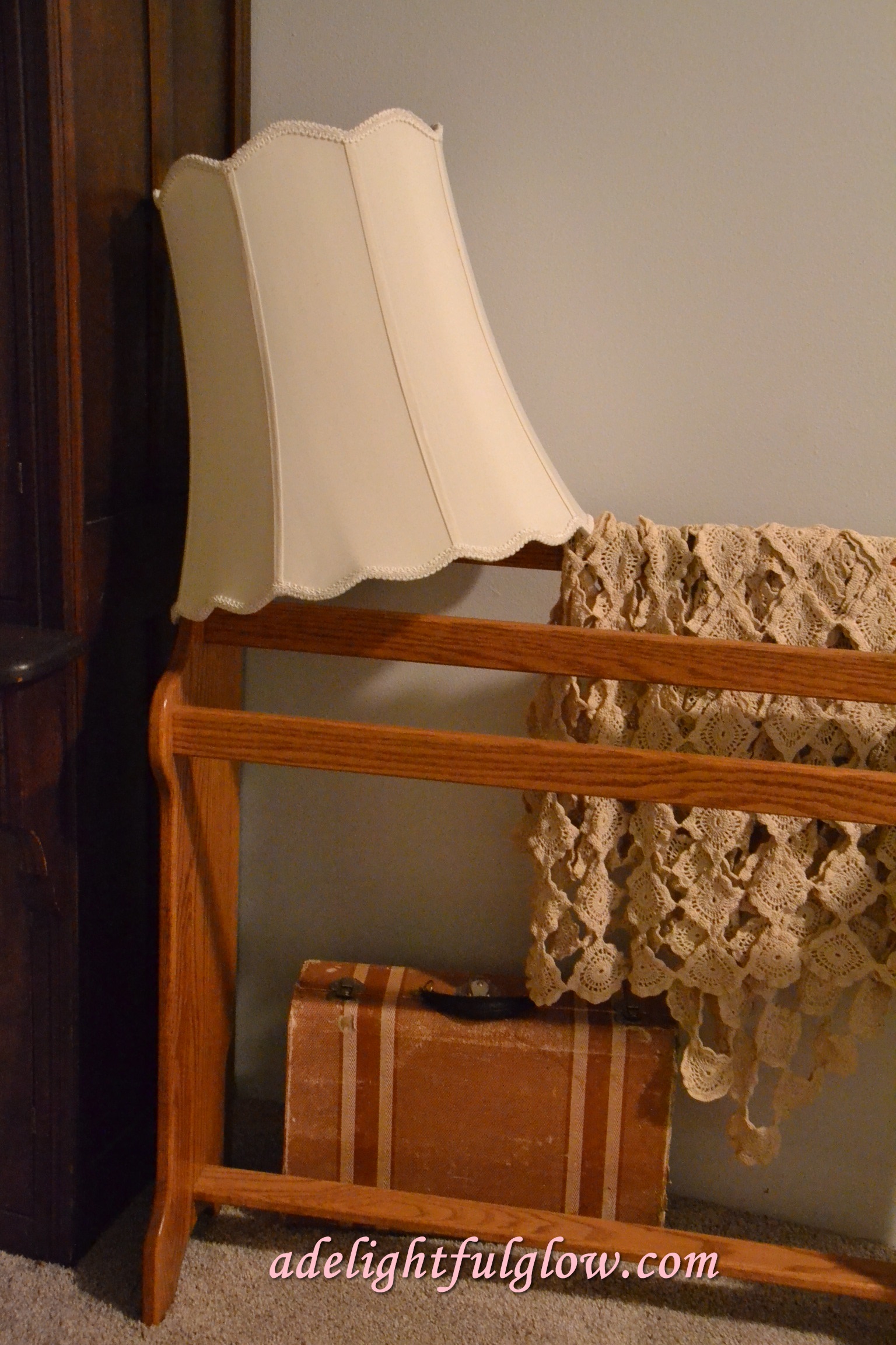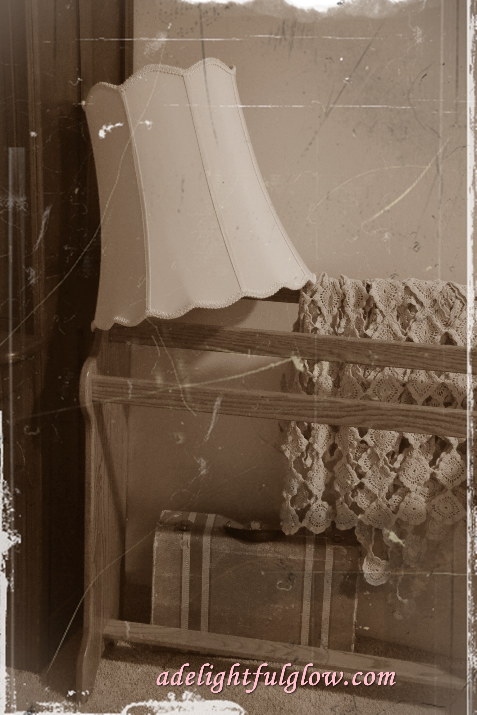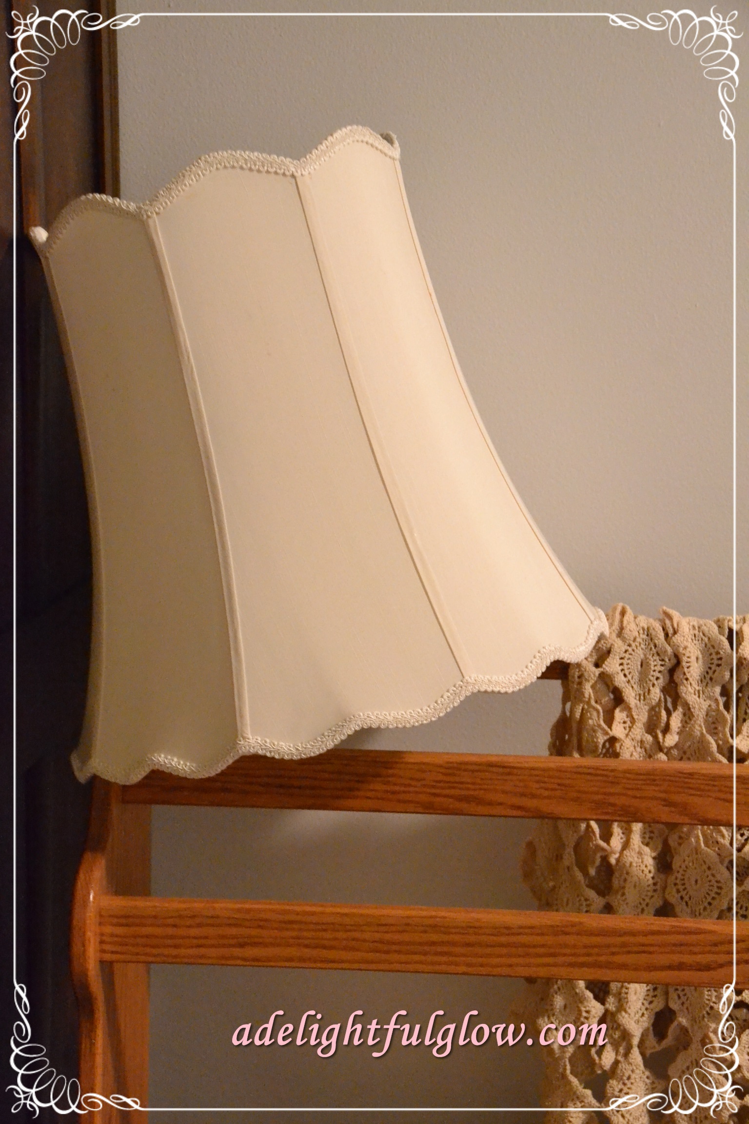 Long story short, I ended up with this amazing lampshade that I think is so pretty. All I have is the lampshade. It is a lampless lampshade. But a beautiful lampless lampshade. I’ve moved it around a few times and it’s residing with my tablecloth and quilt rack and old suitcase at present. I love the lines and color and curves and trim.