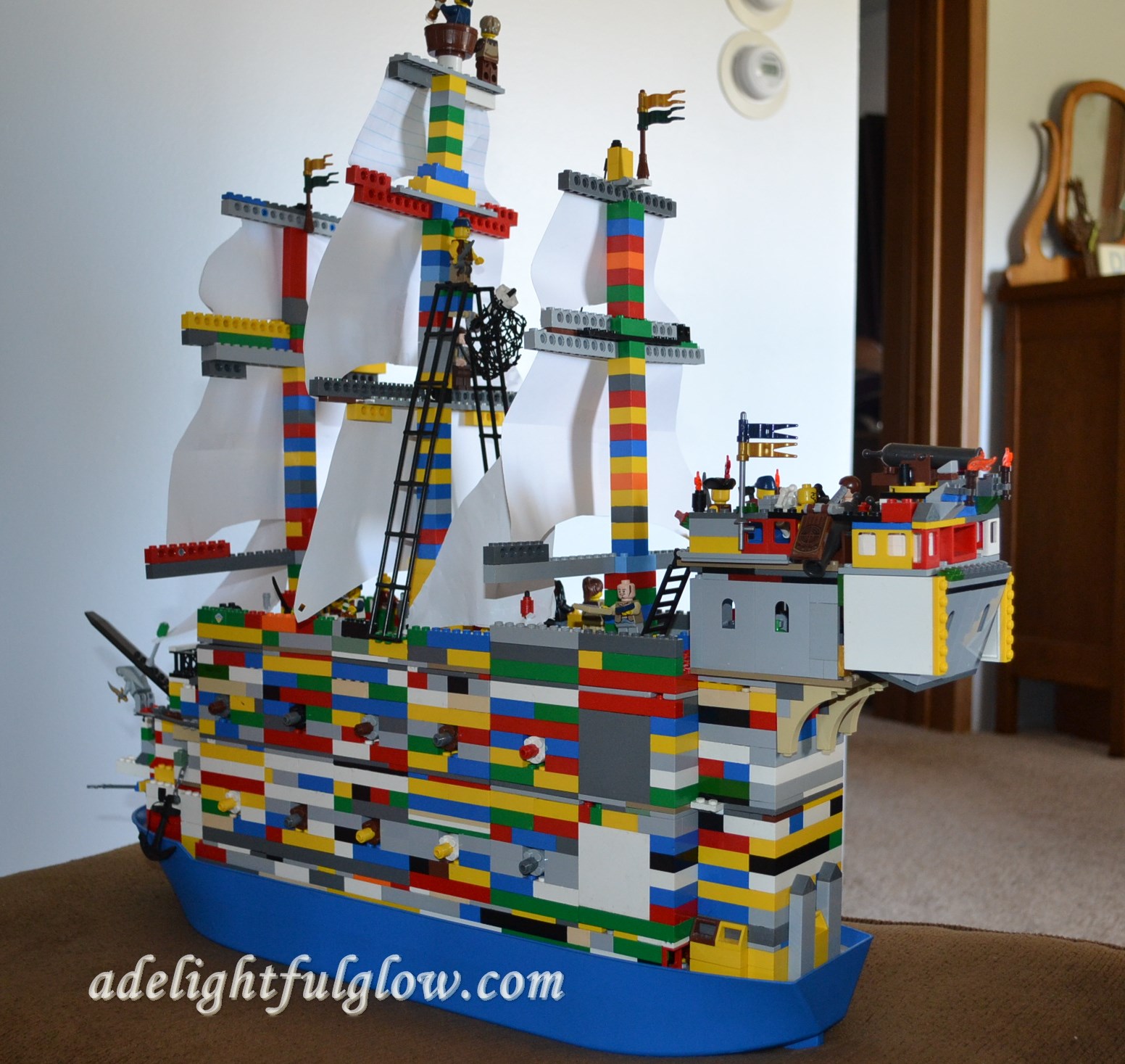 He has a Lego pirate ship and he used the sails from it as a pattern to make sails for this one.
