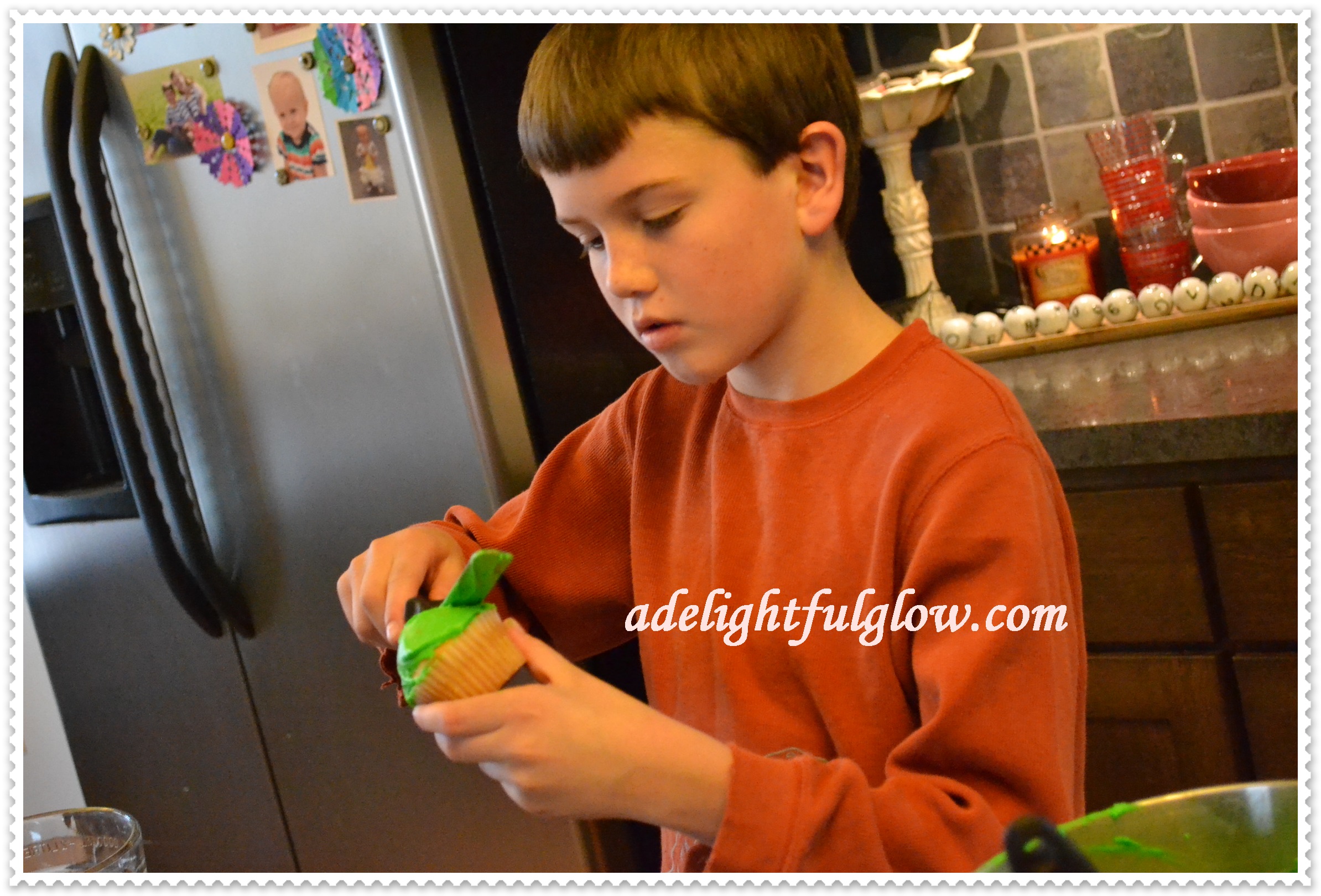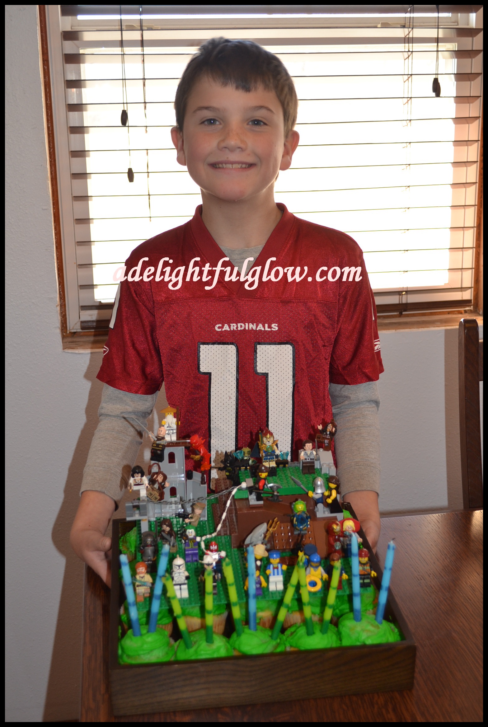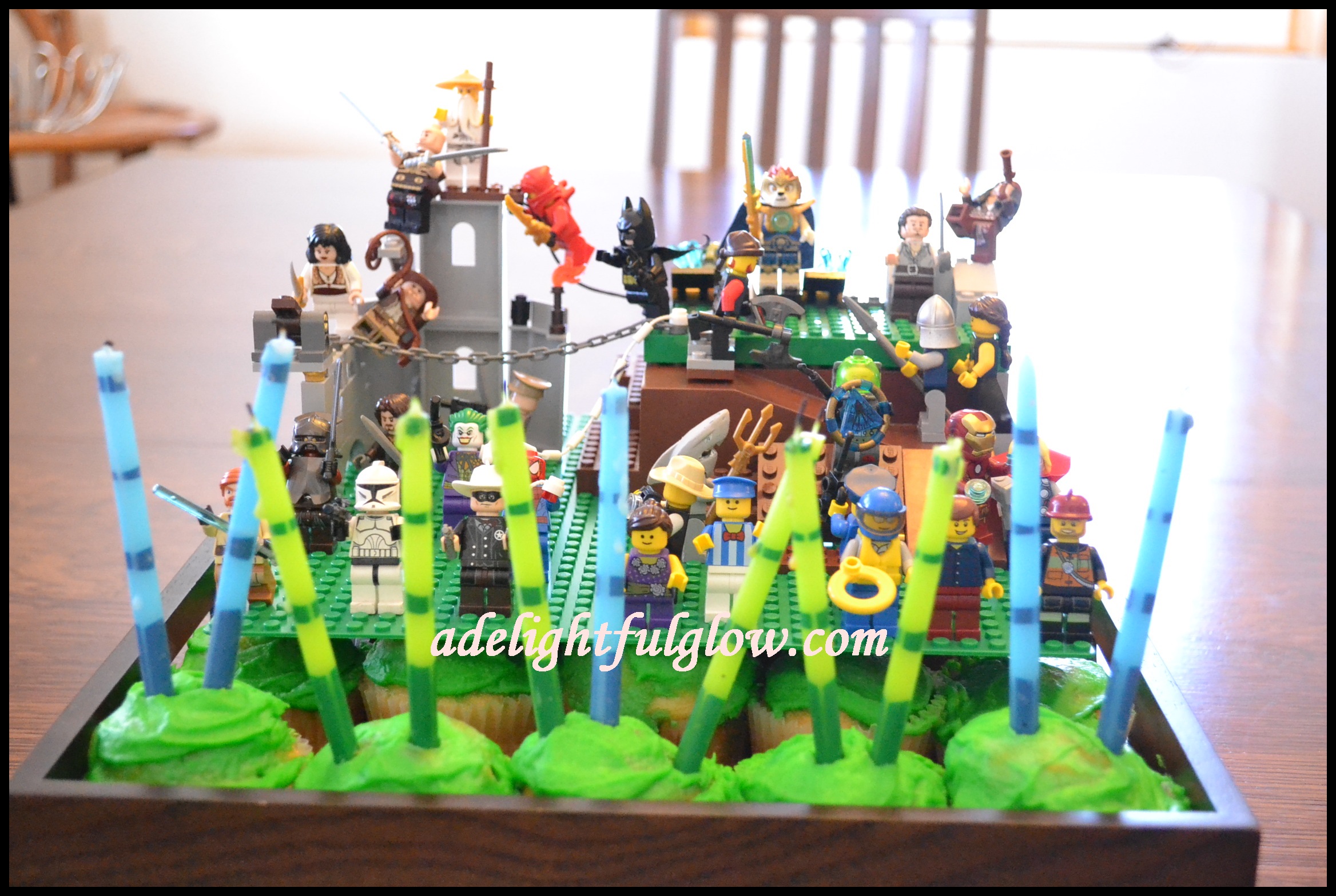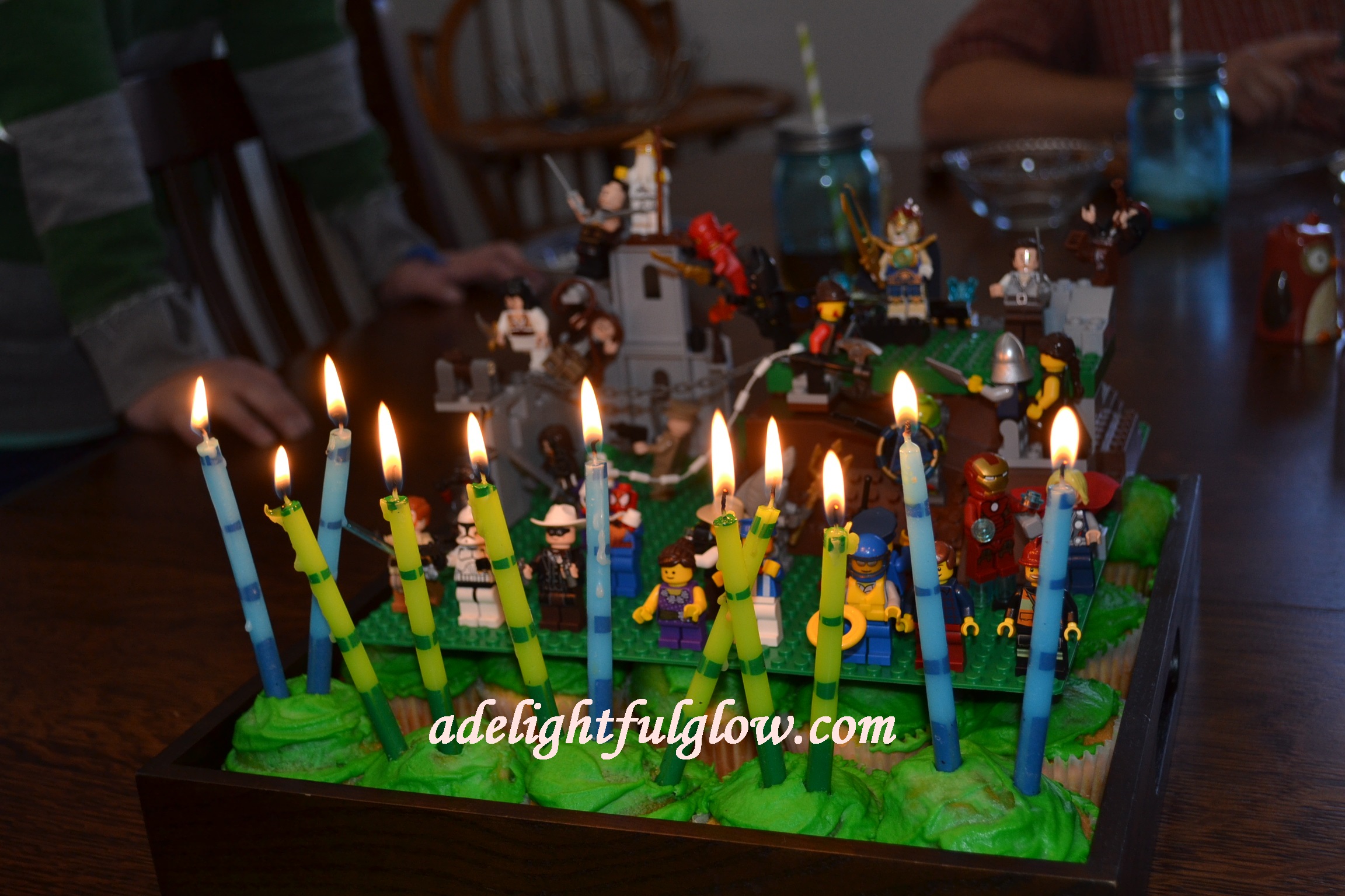 Legos are pretty much Tucker’s main thing. He builds and builds and builds some more. He kept rolling around ideas and debating what he wanted to do for his birthday cake this year. He finally settled on “Lego Themes”. He simply set up a board with figures from a variety of themes that Lego makes. Then we made cupcakes and green icing. {Green has been his favorite color for always, I think.} We put the cupcakes in a tray and put the board on top. I thought it turned out really neat and it was easy. I especially liked the look of it with the candles all lit up.