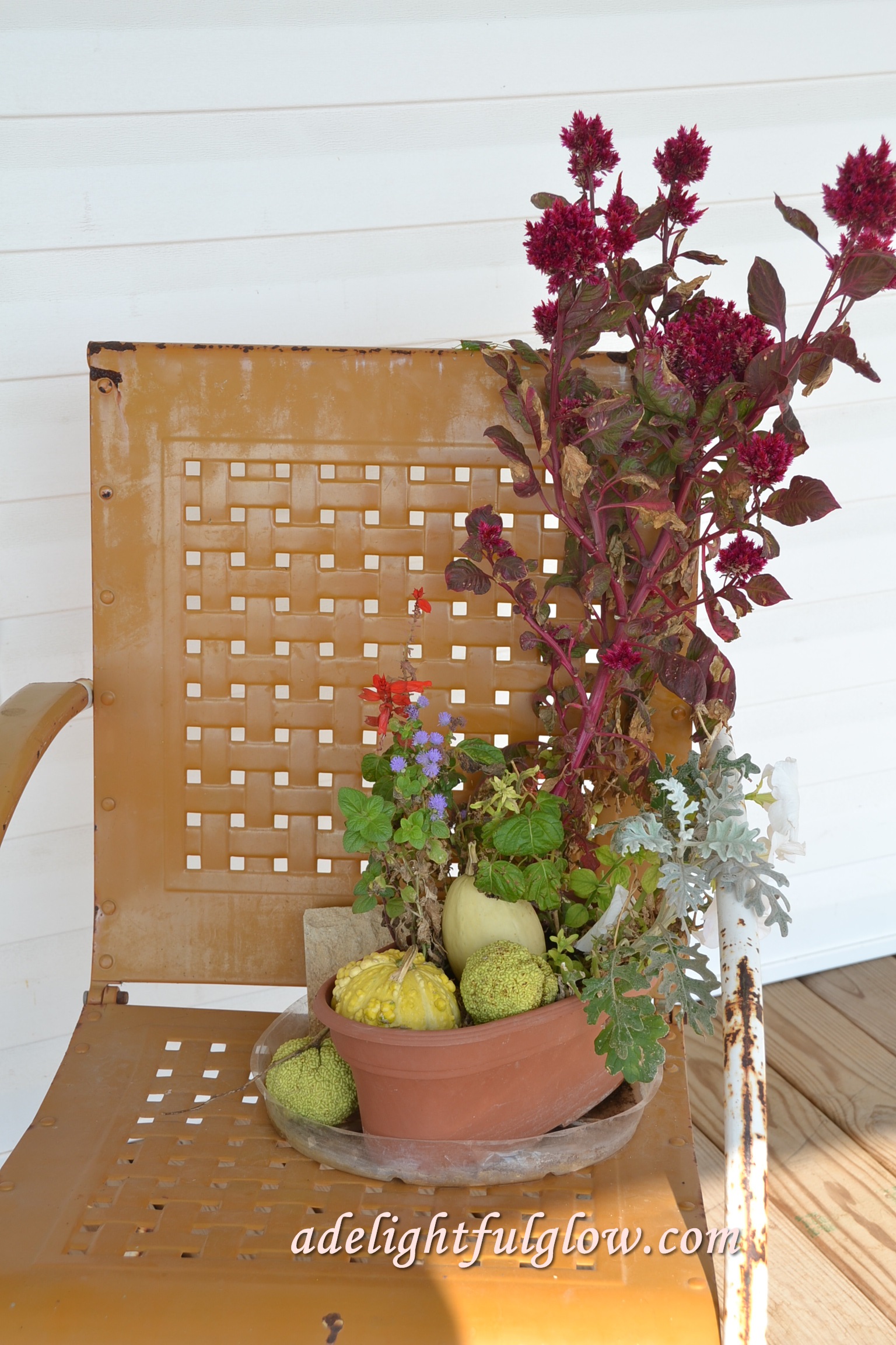 The look of September and October has grasped it! Lovely gourds and pumpkins, and flowers that have a wild, end-of-summer beauty.