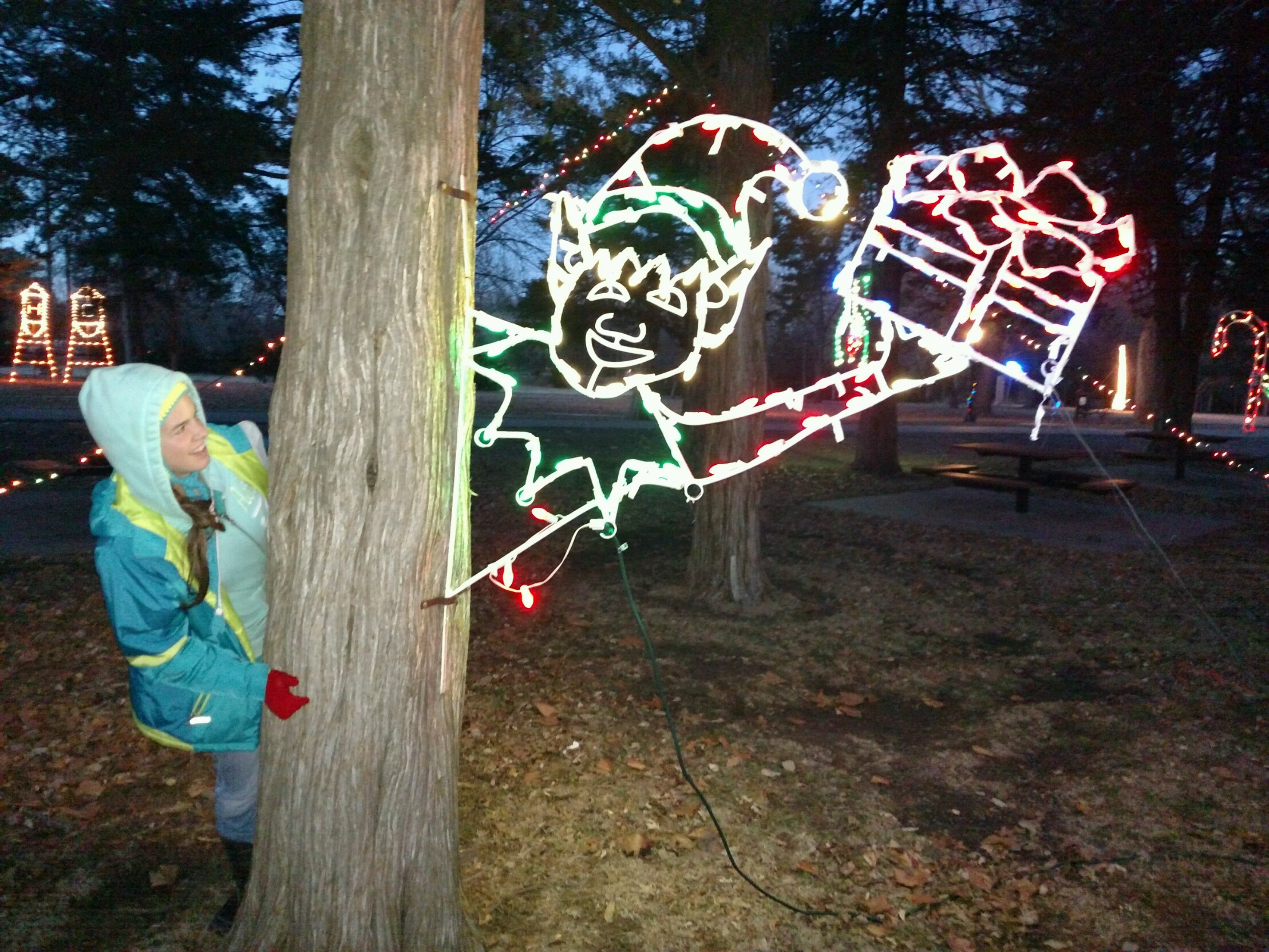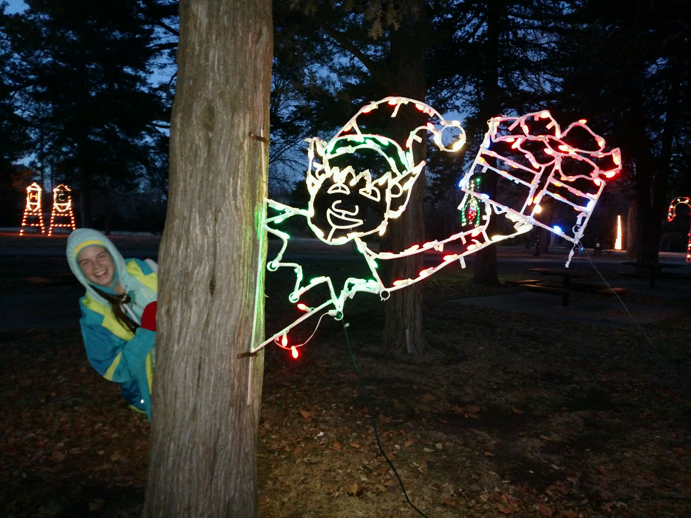 Friday evening Renae and I took a stroll through our park. They deck it out with Christmas lights each year. We walked through the lights, took some pictures and then headed for her first dress rehearsal for the pageant.