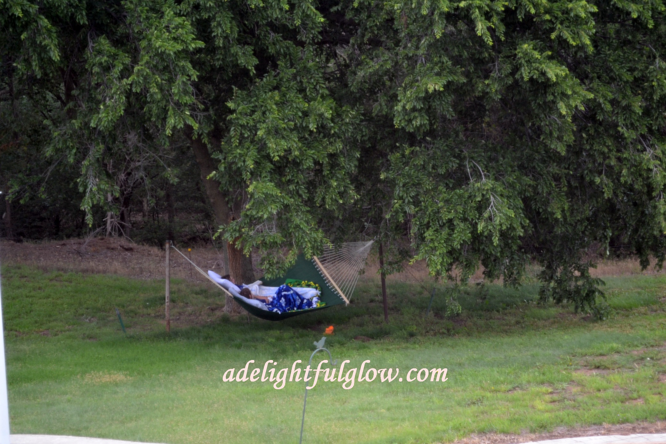 One afternoon the girls put the hammock up and gathered pillows and blankets and books and spent several hours reading and giggling. I have pictures to post sometime of my men setting poles for the hammock. And we need to paint the poles someday-upon-a-time. I like looking out the kitchen window at the hammock. Alas, it doesn’t get to hang there all the time.