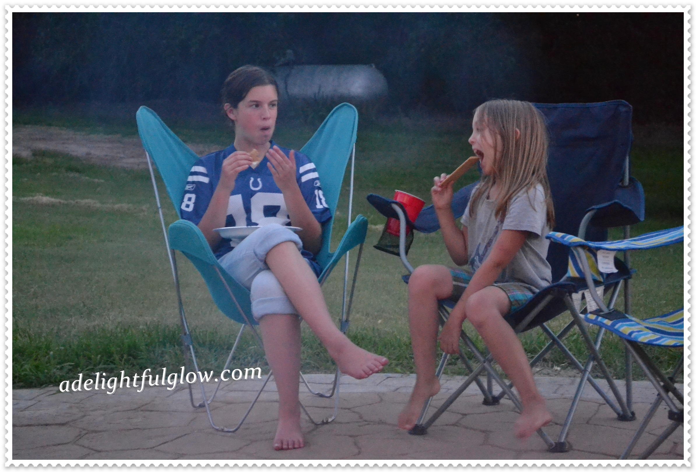 Campfire time! And smores! We had a beautiful Tuesday evening and Travis built a fire and the kiddos drug out chairs and we found some hot dogs and marshmallows and got watermelon out of the fridge and carried it all outside. It was not windy!! Triple hooray! I love evenings like that. It was so pleasant!