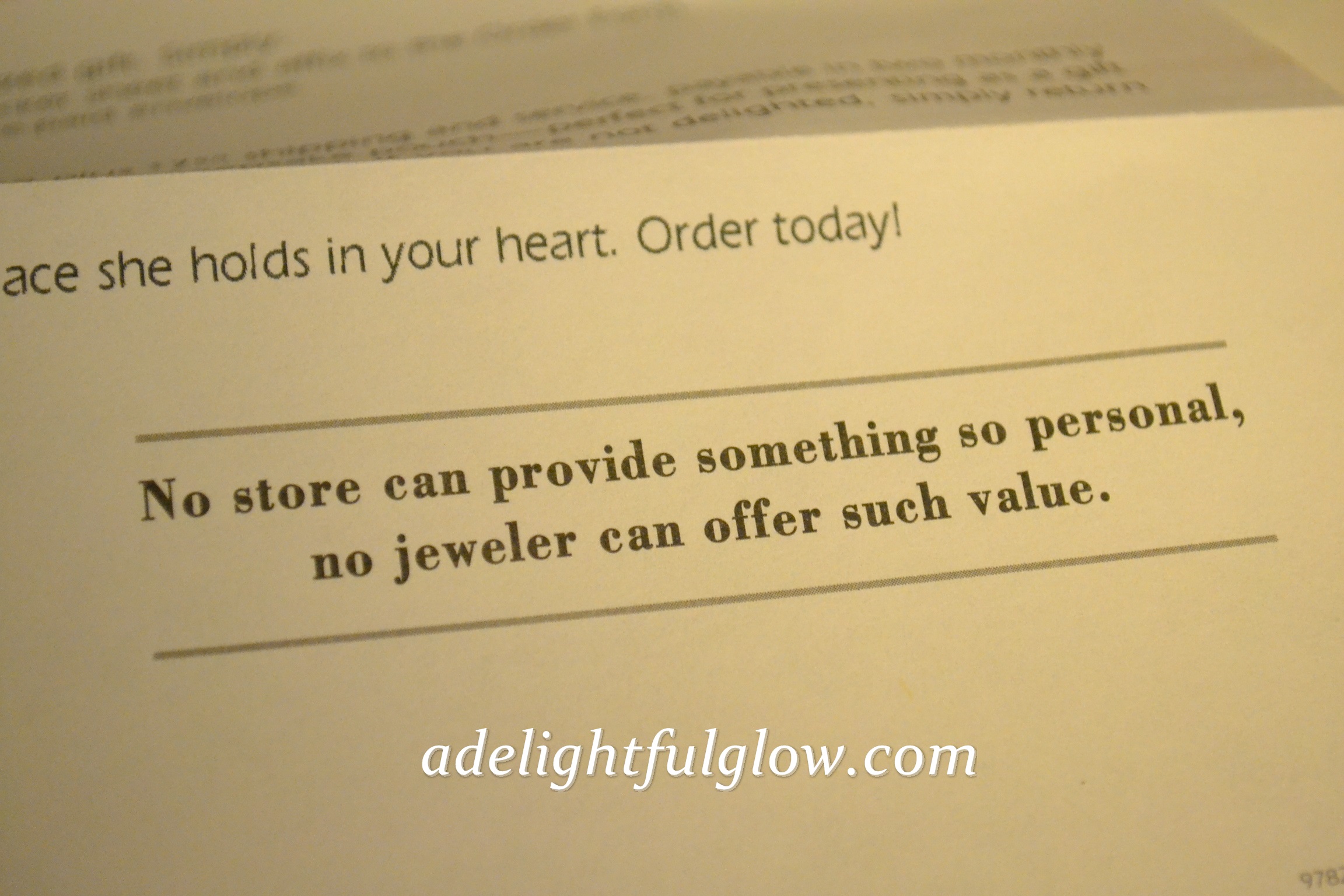 We got a similar ad for a diamond ring, of all things! My reaction was very much like yours. It really struck me funny to think of Dad buying me a ring with our names inside. They do try to talk it up almost making you feel guilty if you don’t order it.
