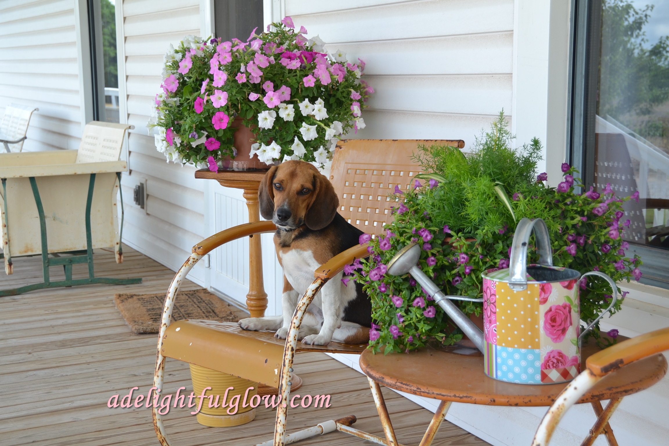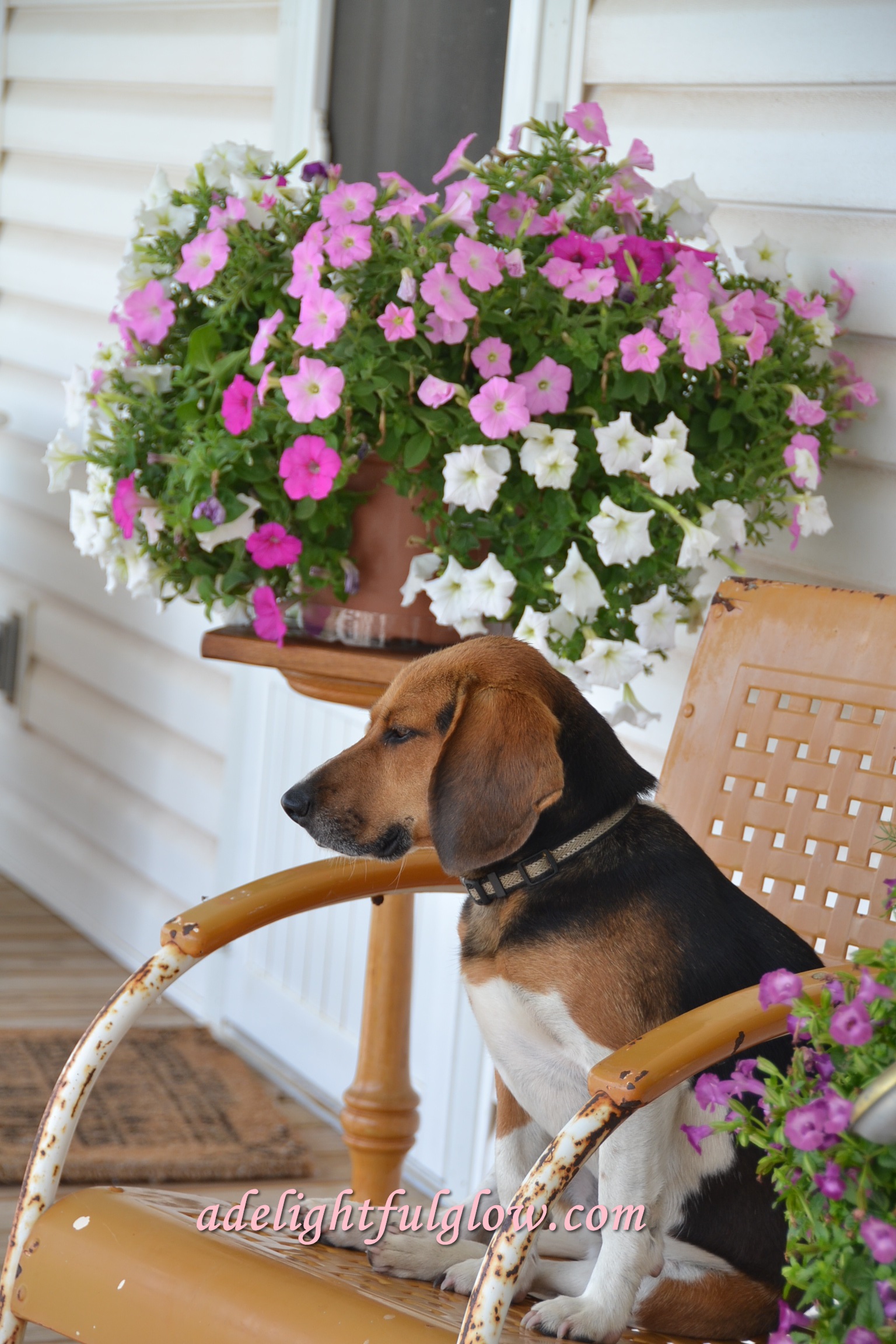 I went out to snap some pics of my flowers and porch and Cooper came trotting along and jumped up to pose. He was so funny. I’m convinced he knew what he was doing. He’d sit there and look at me and pose perfectly and then gaze off in another direction, then look back, then move to a different pose. 🙂