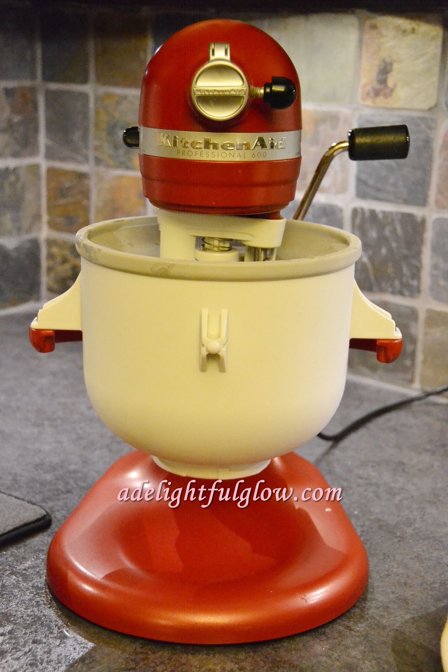 I pulled out this bowl for my mixer. You store it in the freezer or stick it in overnight and then you’re set to make a batch of homemade ice cream with it! Mmmmm! Chocolate ice cream before bedtime snack. {Darling of course.}