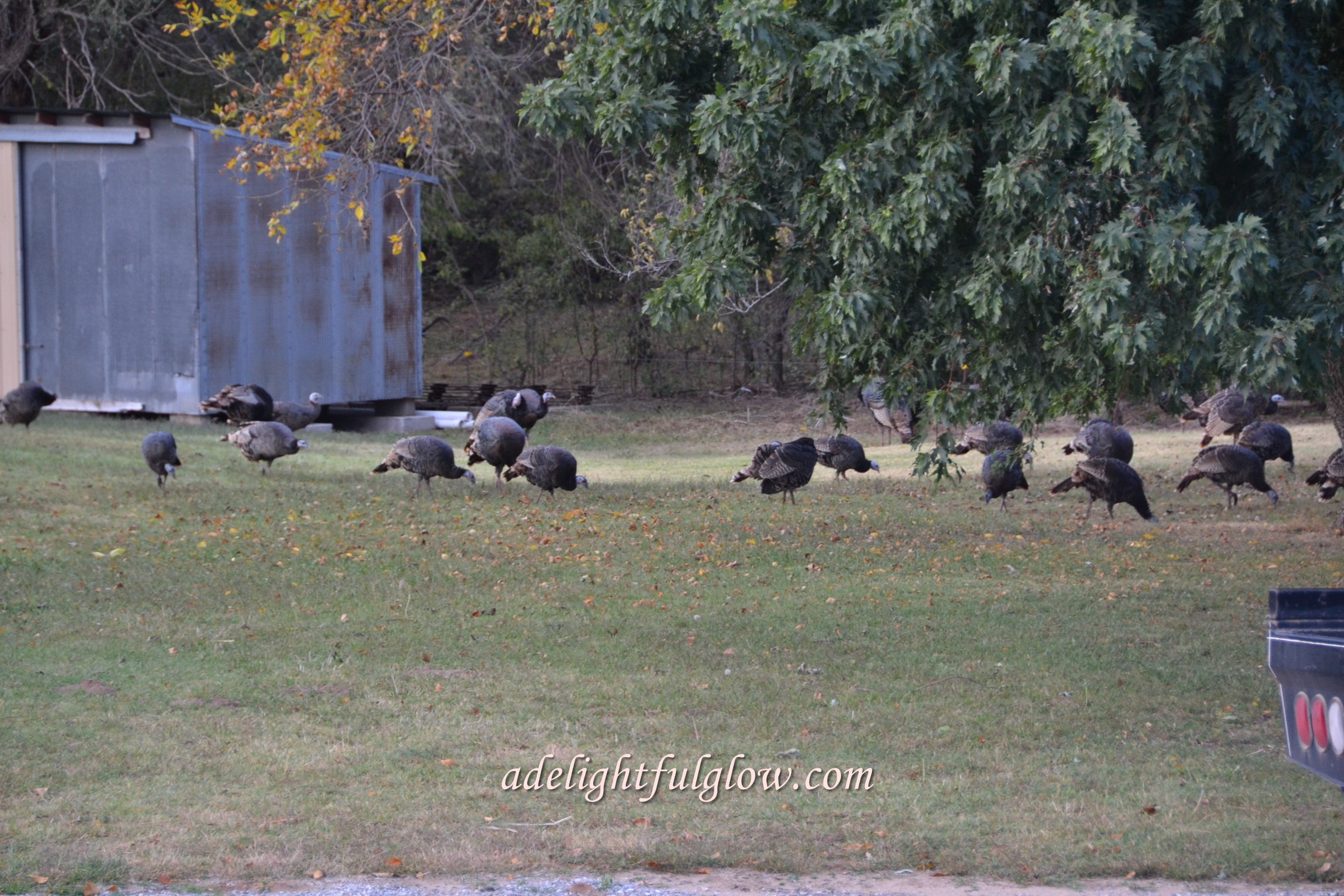 This group of turkeys were all congregated right in our backyard one morning. Until I let Cooper out. He scattered them and many of them took wing. They can fly pretty well when they need to!!