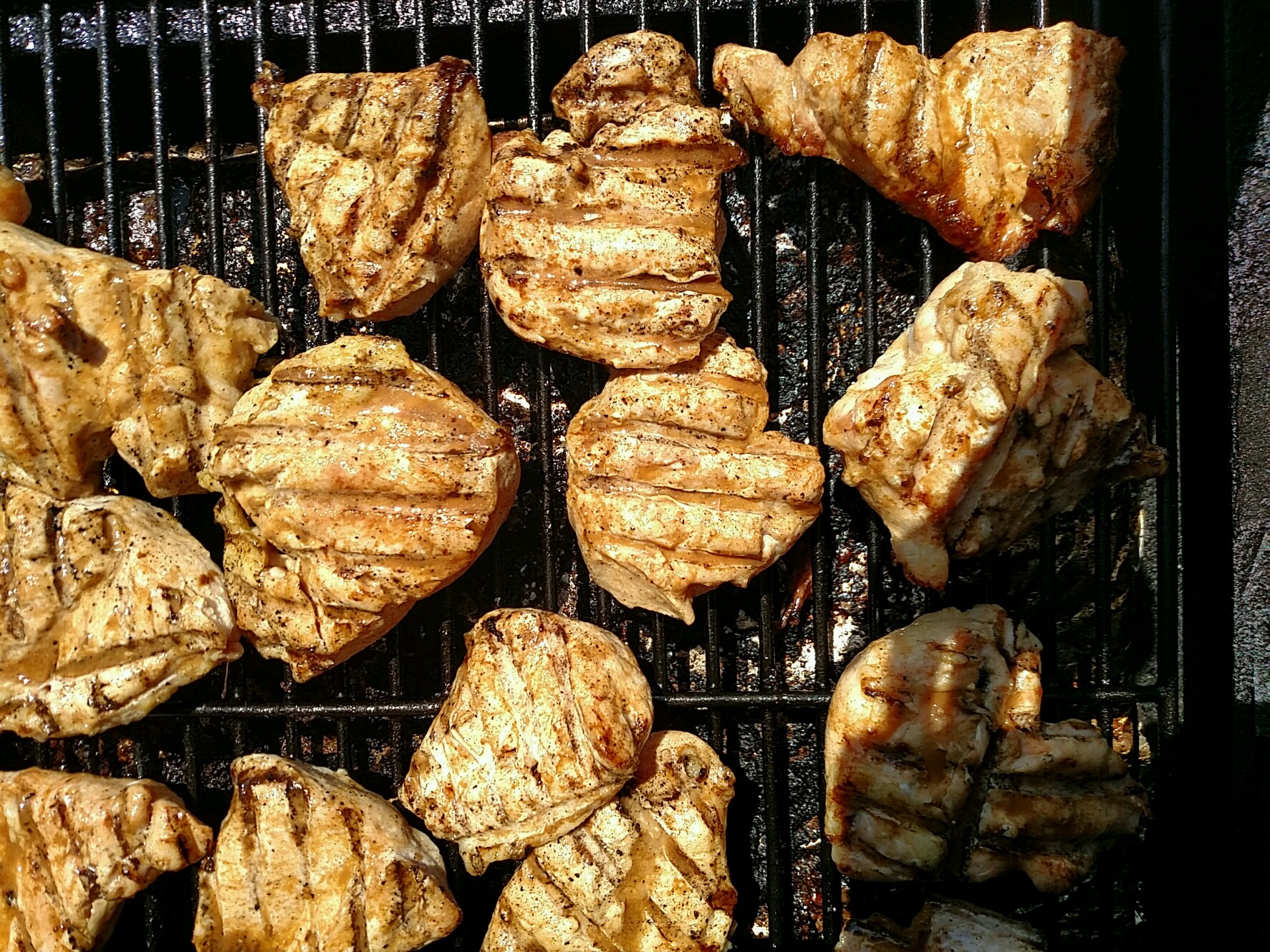 Out the chicken goes and out comes the pan of BBQ sauce and my brush and I begin to splash the chicken pieces. The chicken looks so pretty as the Traeger hums and slowly turns it golden. I take a picture to post on Instagram and I include these words,