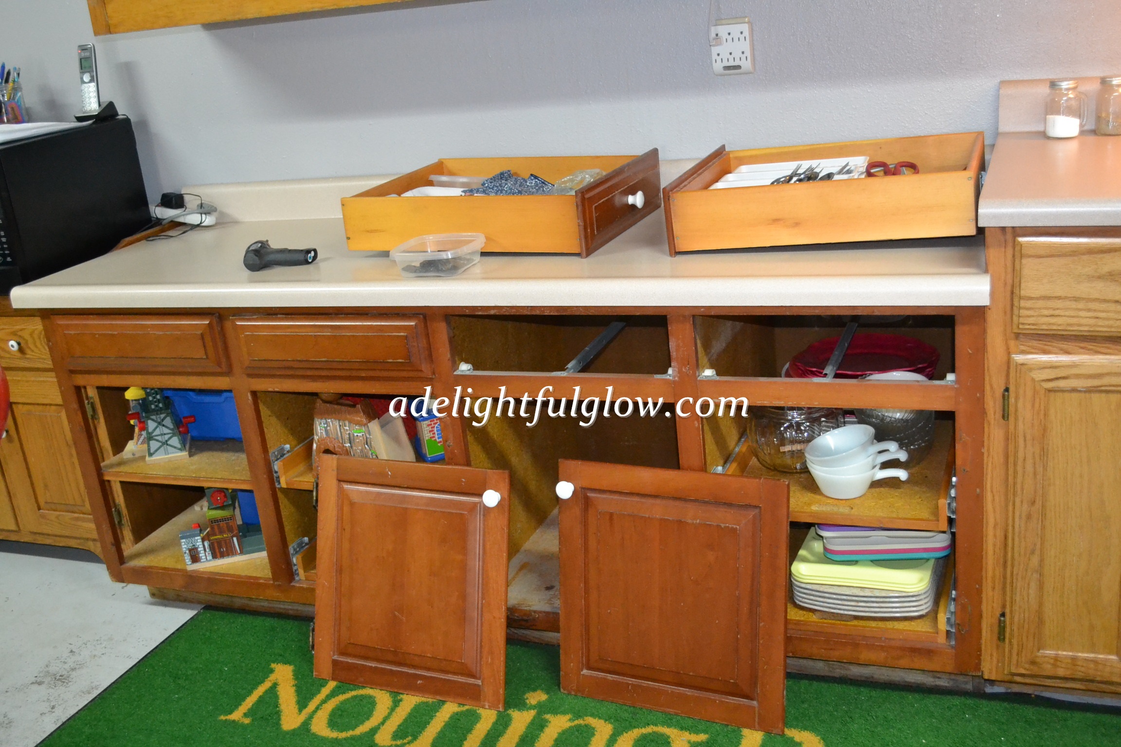 I really wasn’t trying to match the gray of the cupboards to the gray of our basement, but it ended up matching very, very closely.