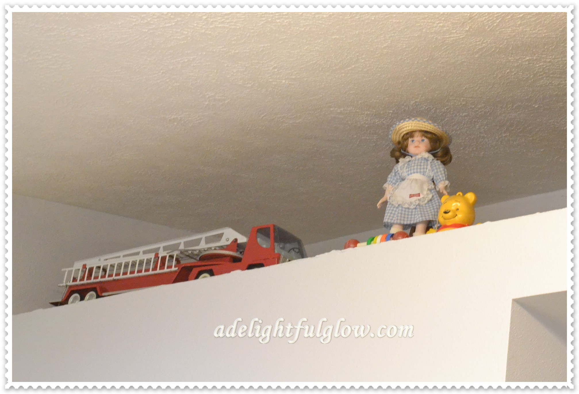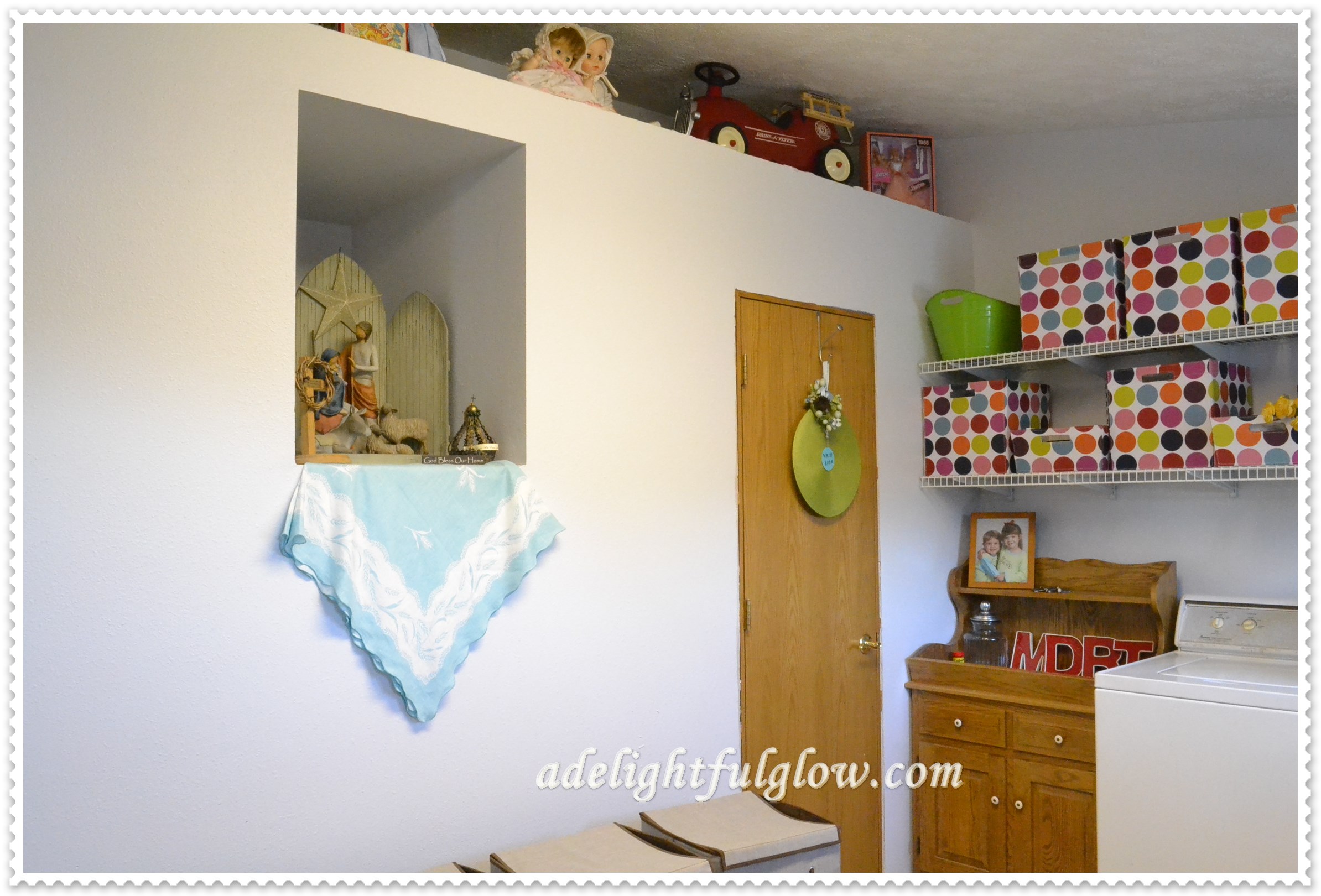 The homemaker’s father had also inspired an idea for the laundry area with a simple comment made, just as they were saying good-byes and preparing to return to the east, back in the summer. He mentioned a toy car they had and that the up-high-close-to-the-ceiling-but-open-space in our laundry would be a good place to display it. The homemaker was struck with this observation and it made her think about some toys and old things she had. She liked this collection of odds and ends “stuff” but it was all just stuck away. She decided to dig out some of these old things, with memories attached, and display them up above. So she did. And she liked it. None of it means much to anyone visiting, but it is dear to the homemaker of this house. And while some people can totally label their decor style as vintage or Victorian or modern, this homemaker would label her style something like, “It Speaks to Me” or “A Hodge-Podge Of What I Like.” It goes along with one of her favorite quotes that she recently quoted in this blog post about having things in your home that you LOVE or USE.