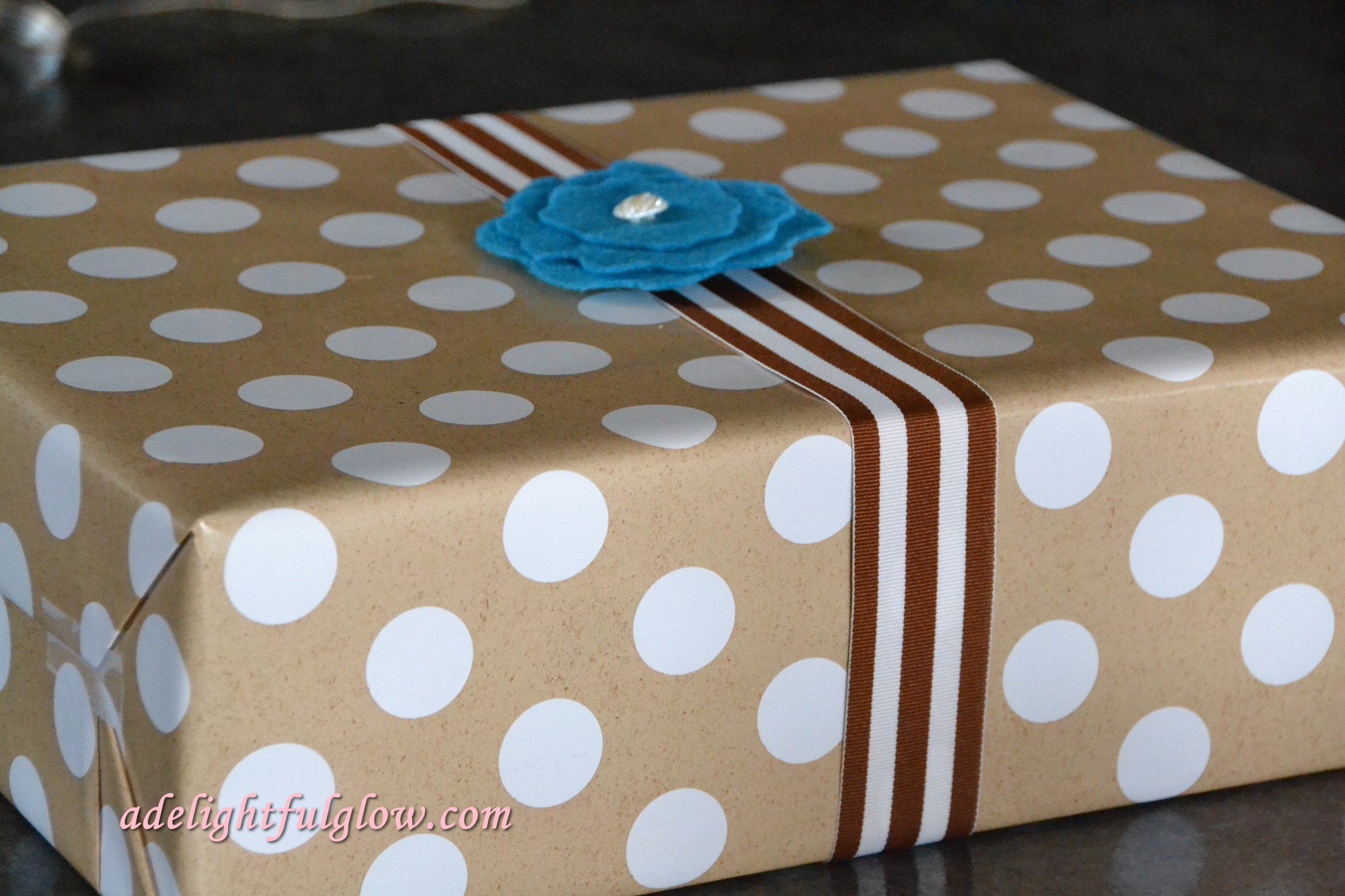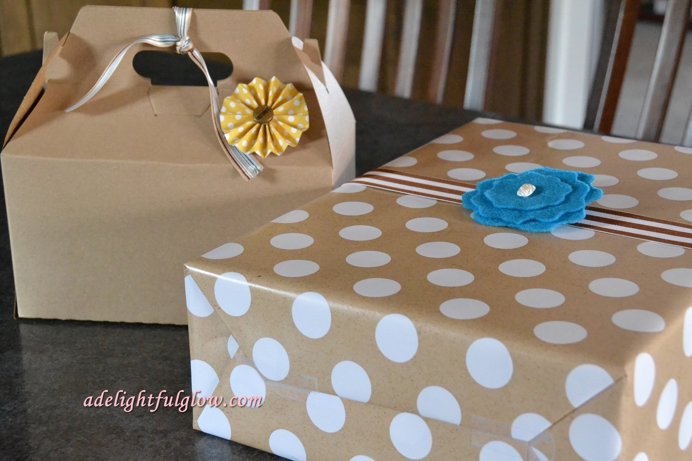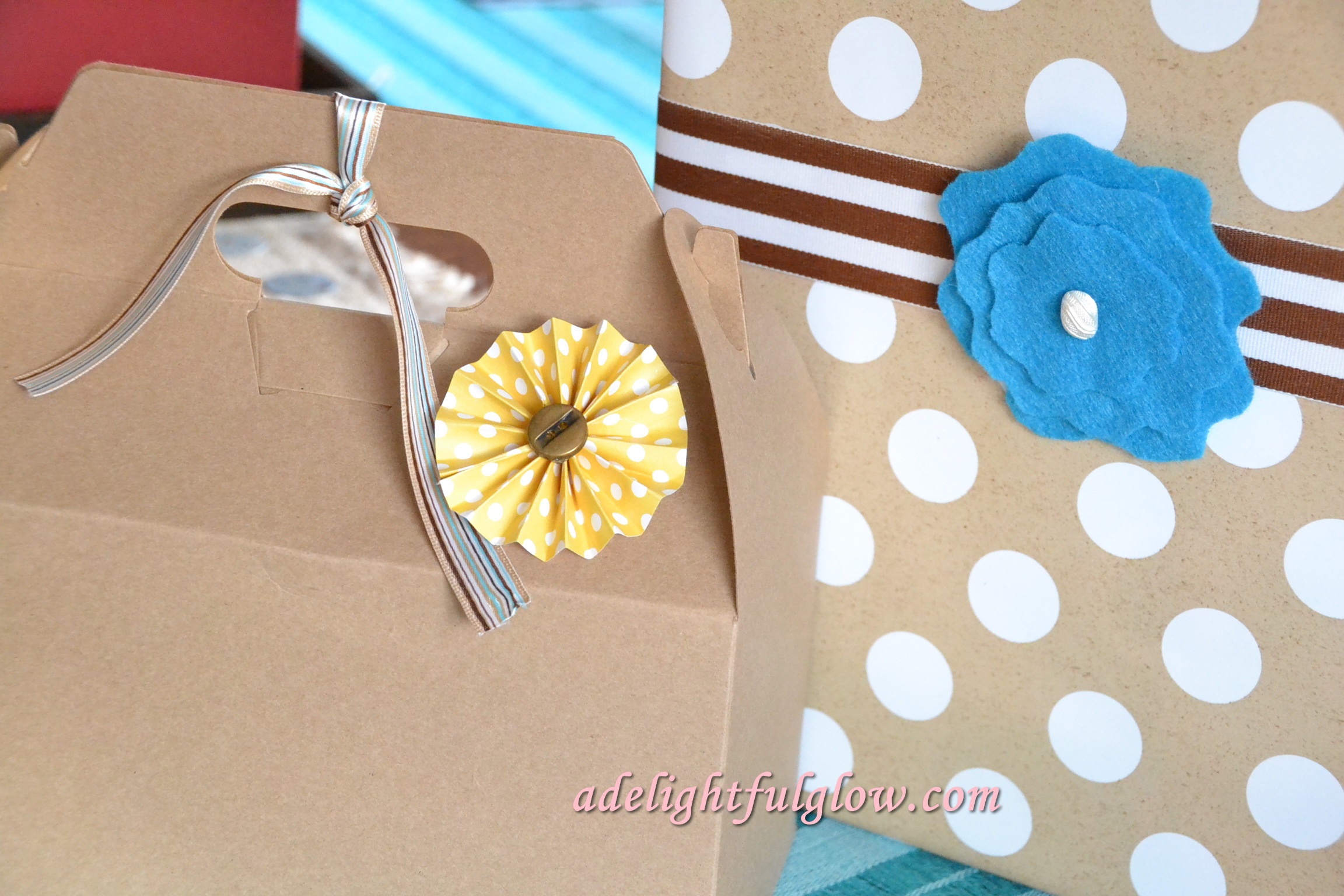 Kraft boxes and brown paper are fun to use for packages. Polka dots always catch my eye. I’ve been hooked on flowers for bows for a while now too!