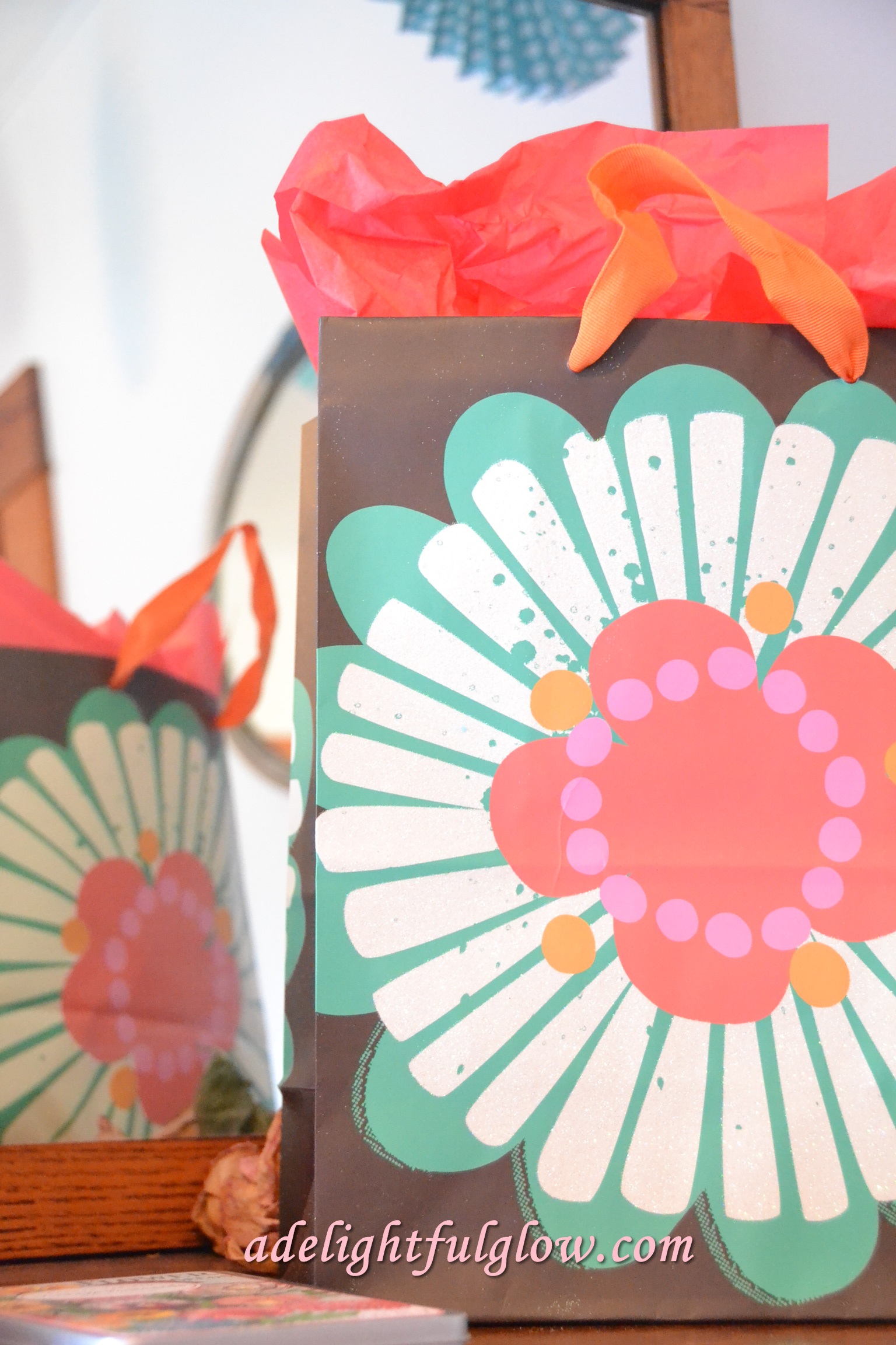 I mean!! There are so many fun gift bag designs! My girlie-o fixed up this package above for a friend. I liked how she added the little packages of candy alongside the tag on the bag.