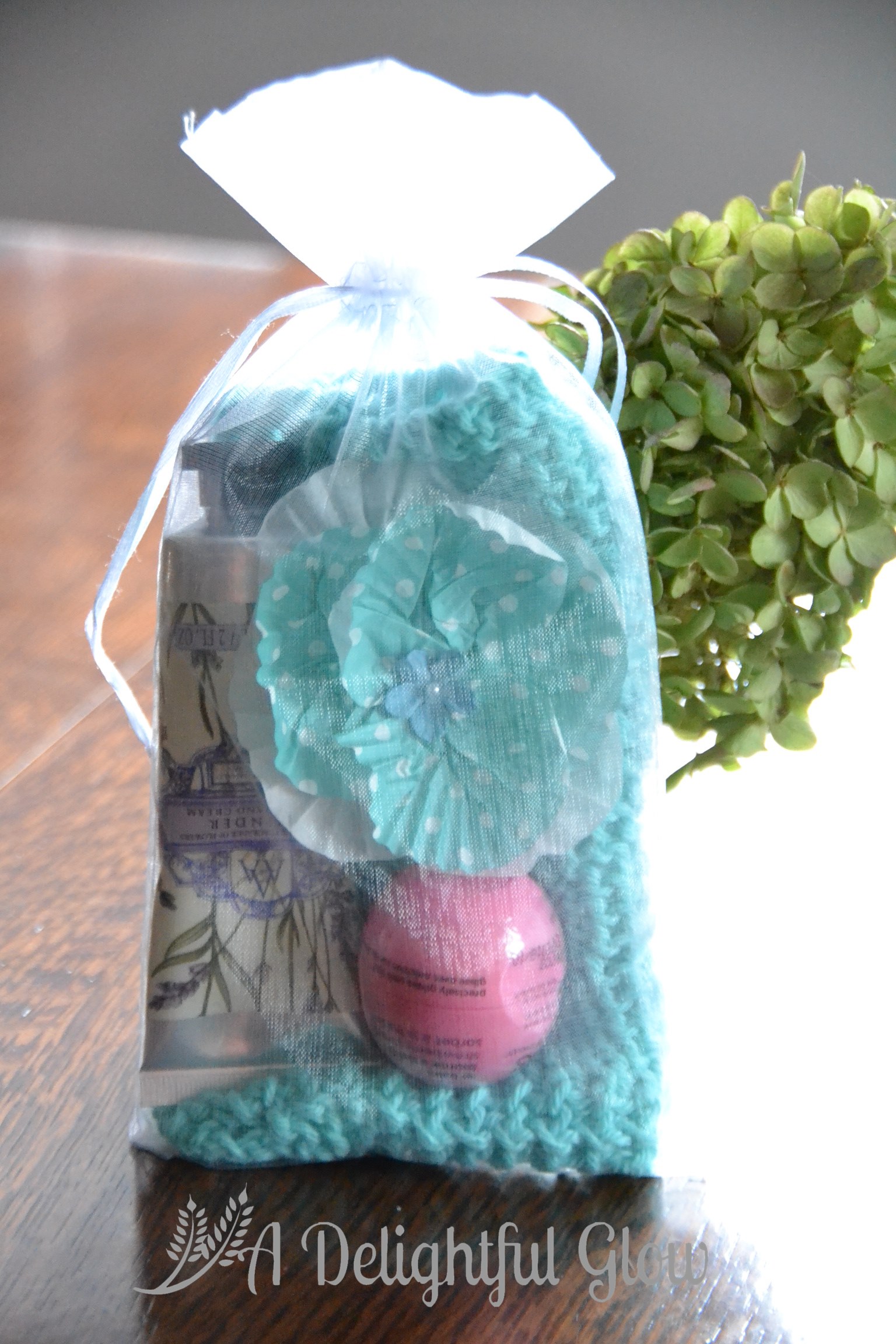 I tucked a dishcloth, lotion and fave EOS lip balm in one, along with a paper flower for pretty!