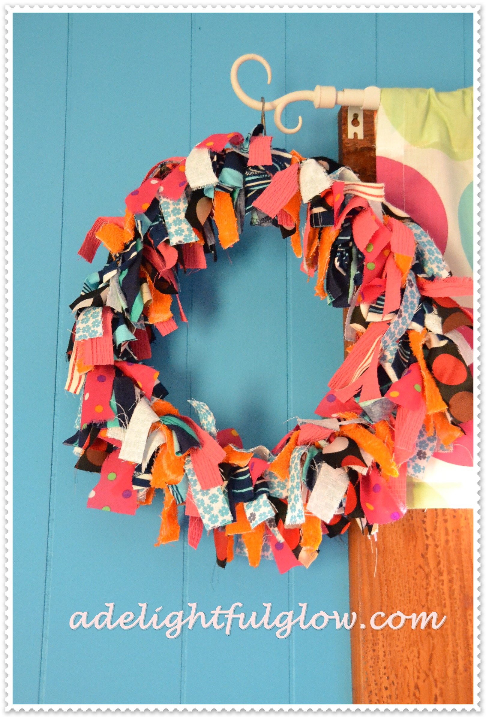 She made this wreath. You twist a coat hanger into the wreath shape and use the top of the hanger to hang the wreath! She used scraps of fabric we had around and voilà!