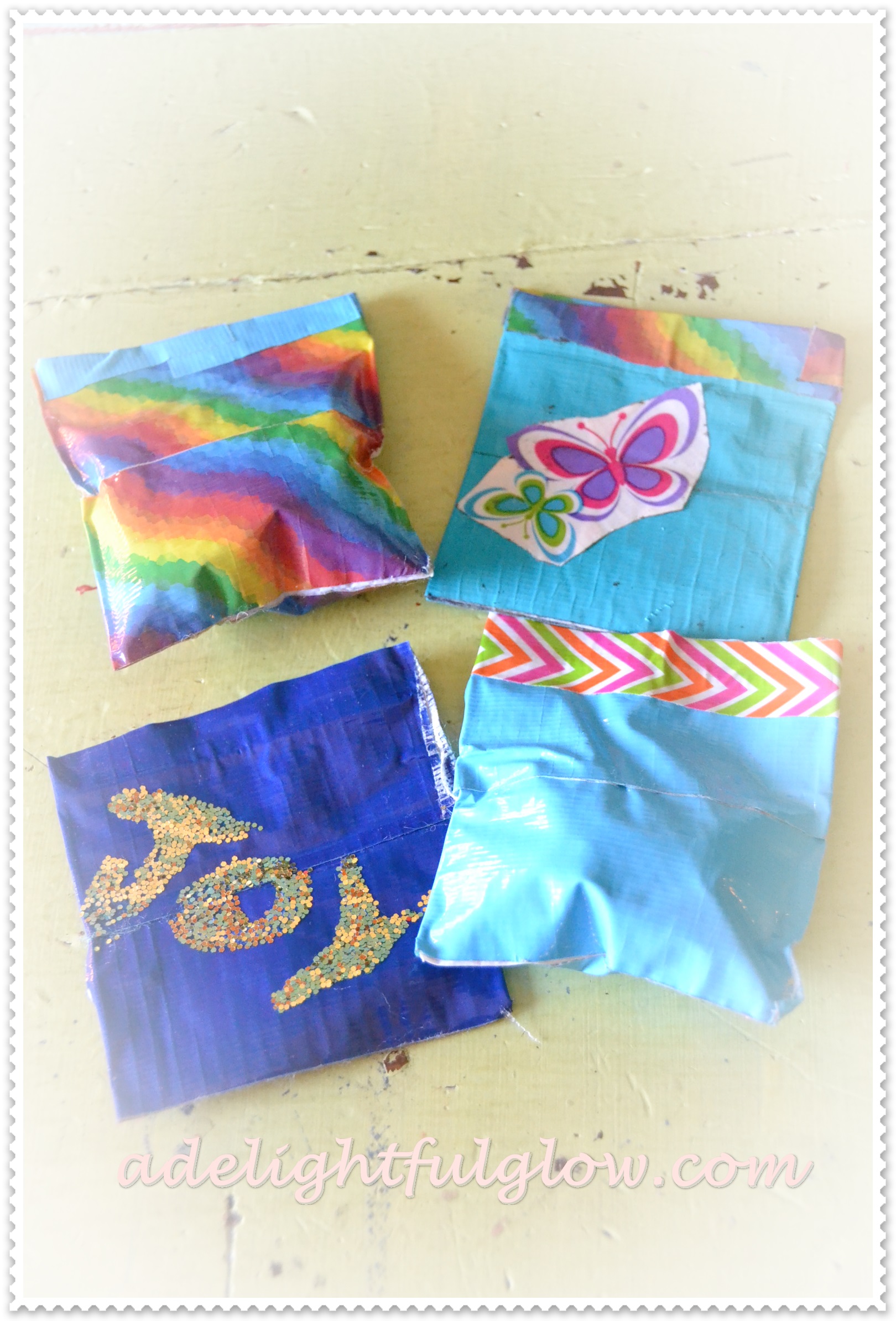 These little zipper pouches were from the rubber bands for her braces. They were white and she covered them with duct tape and made handy-dandy zip pouches!