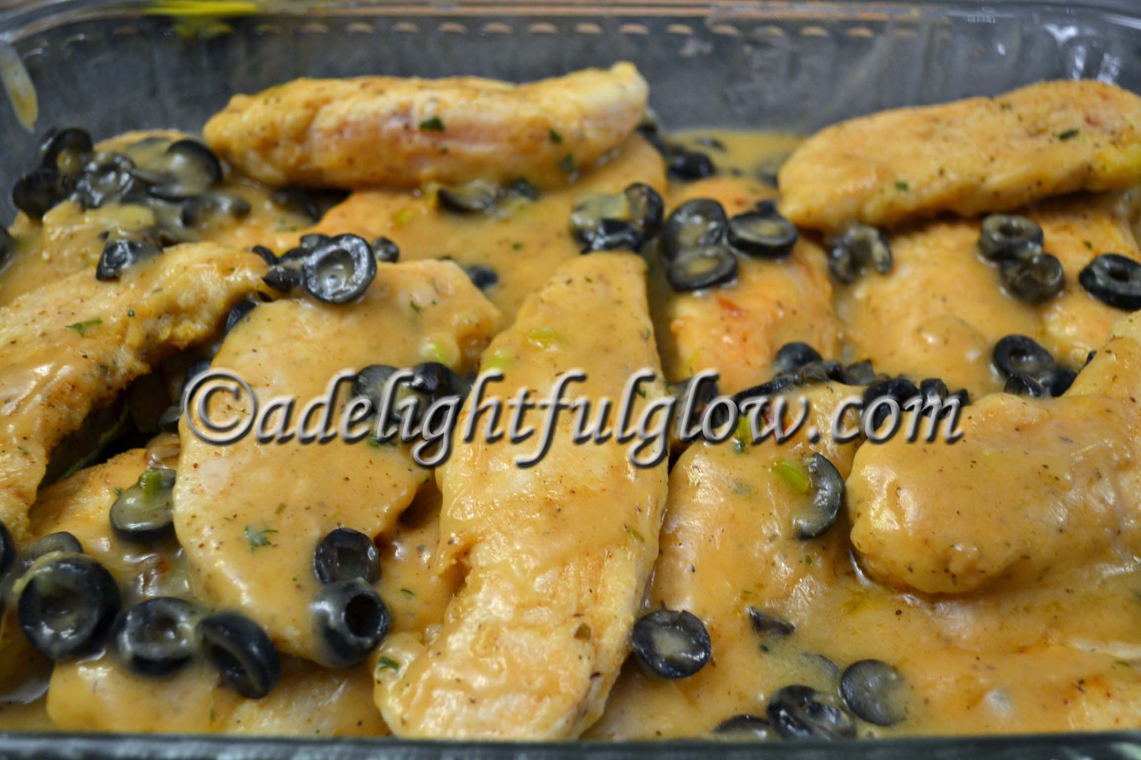 - In skillet, melt 1/4 cup butter and brown 1/4 cup chopped green onions and 1/2 tsp minced garlic. Add 1/4 cup leftover flour mixture, 2 cups chicken broth, and 1/2 can sliced olives. If you are mushroom lovers-we aren't-you can also add mushrooms at this point. Stir until thickens a little. Pour over chicken. Bake at 350-375 degrees for 1 hour covered.