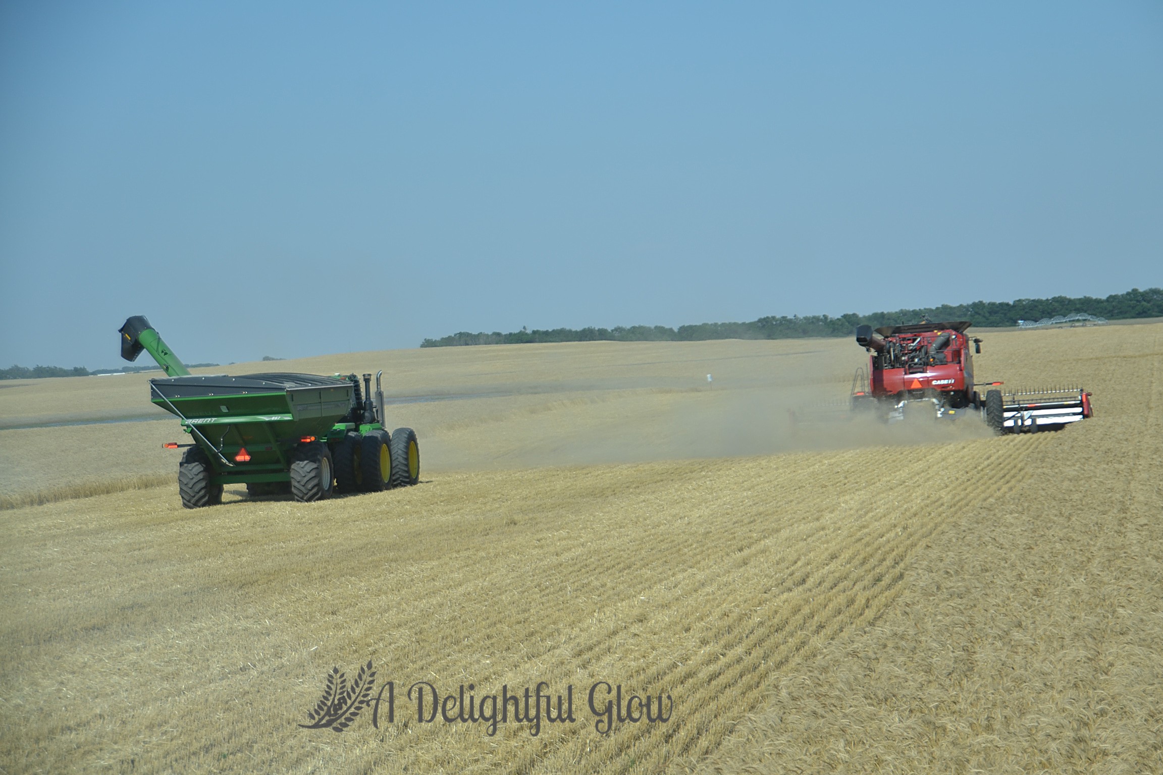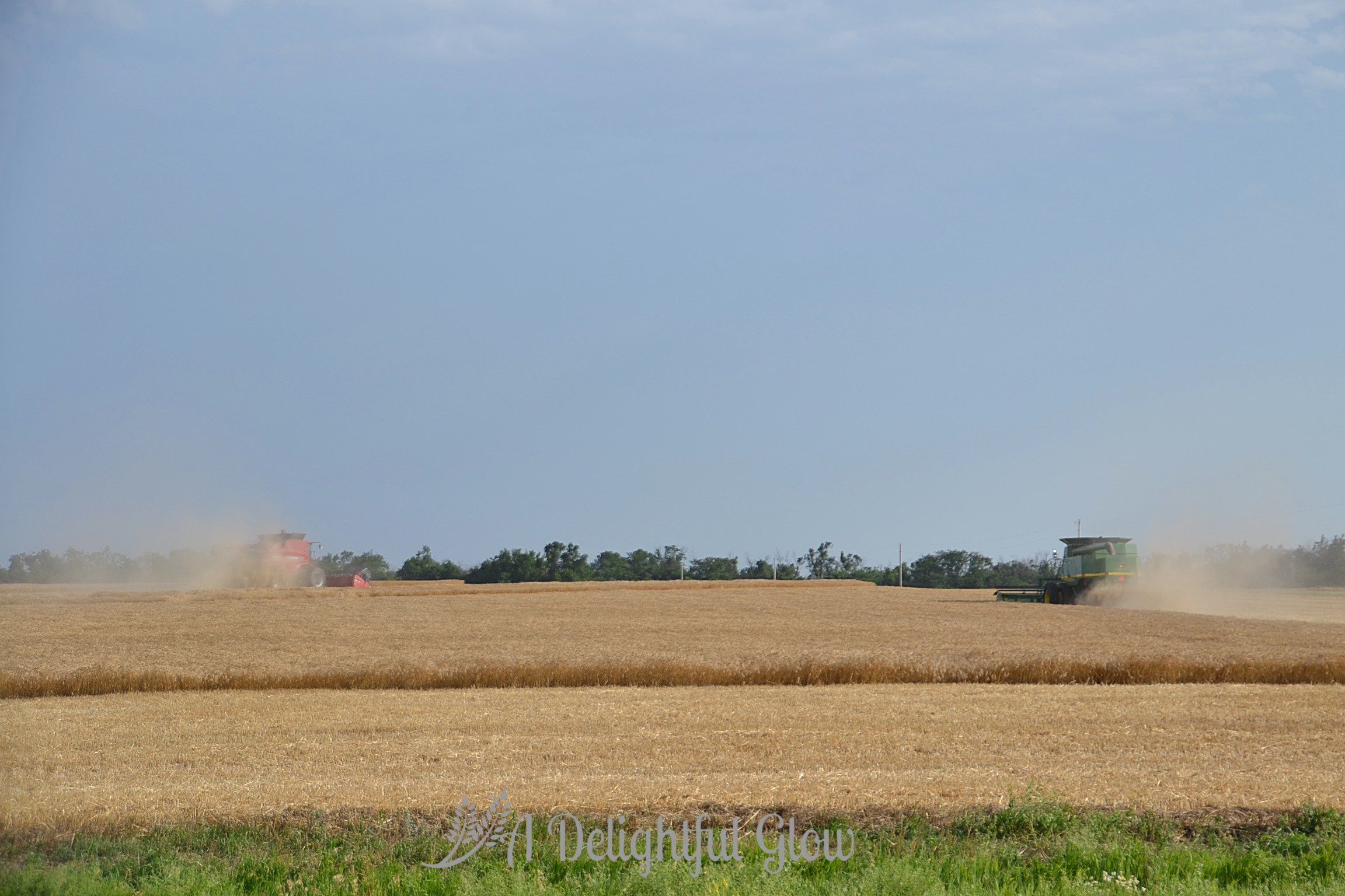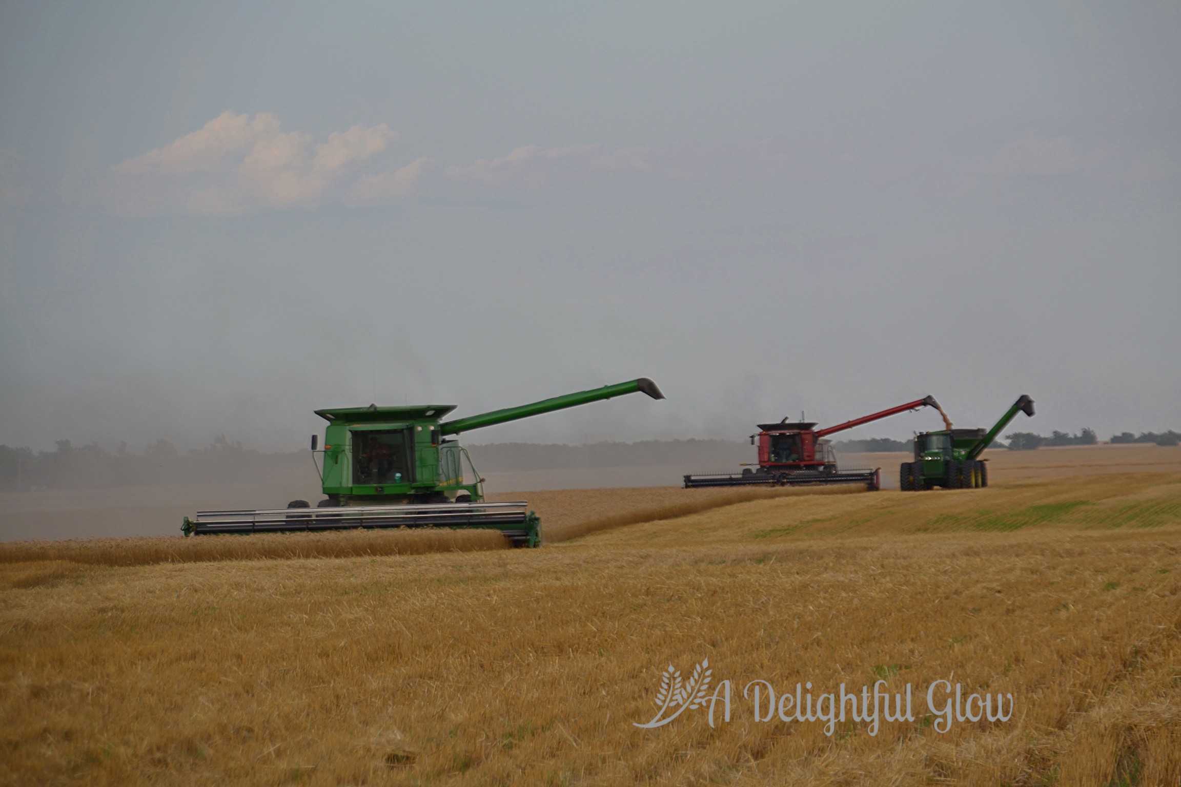 We pass out suppers and combines and drivers continue their laborious song. Around and around. Dust and dirt hang heavy on the still air, rubbing a haze right along the horizon.
