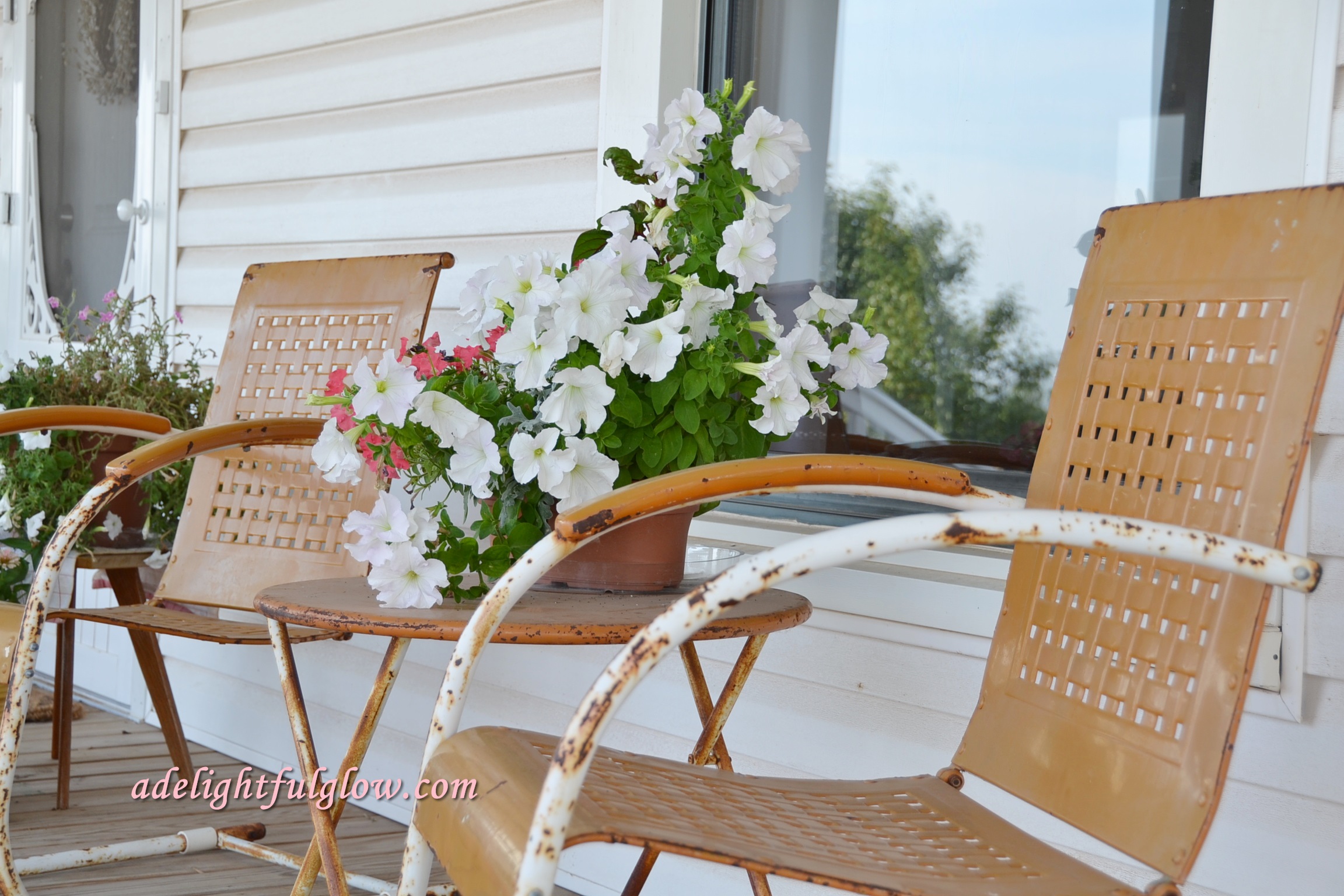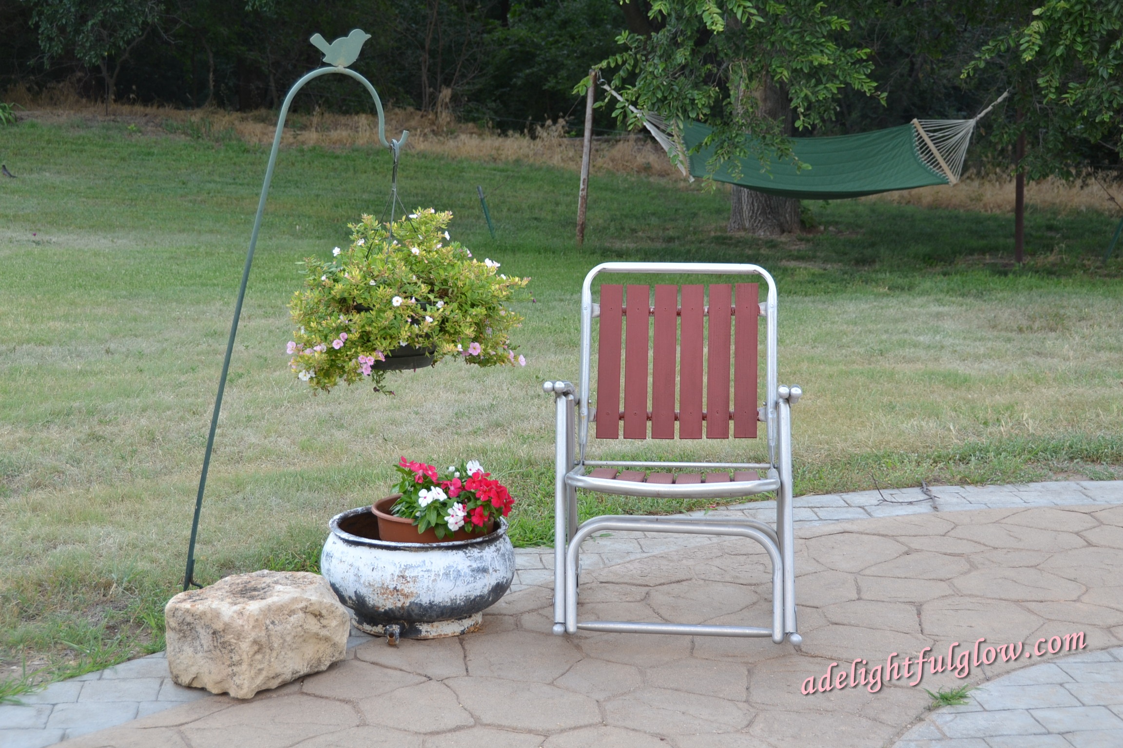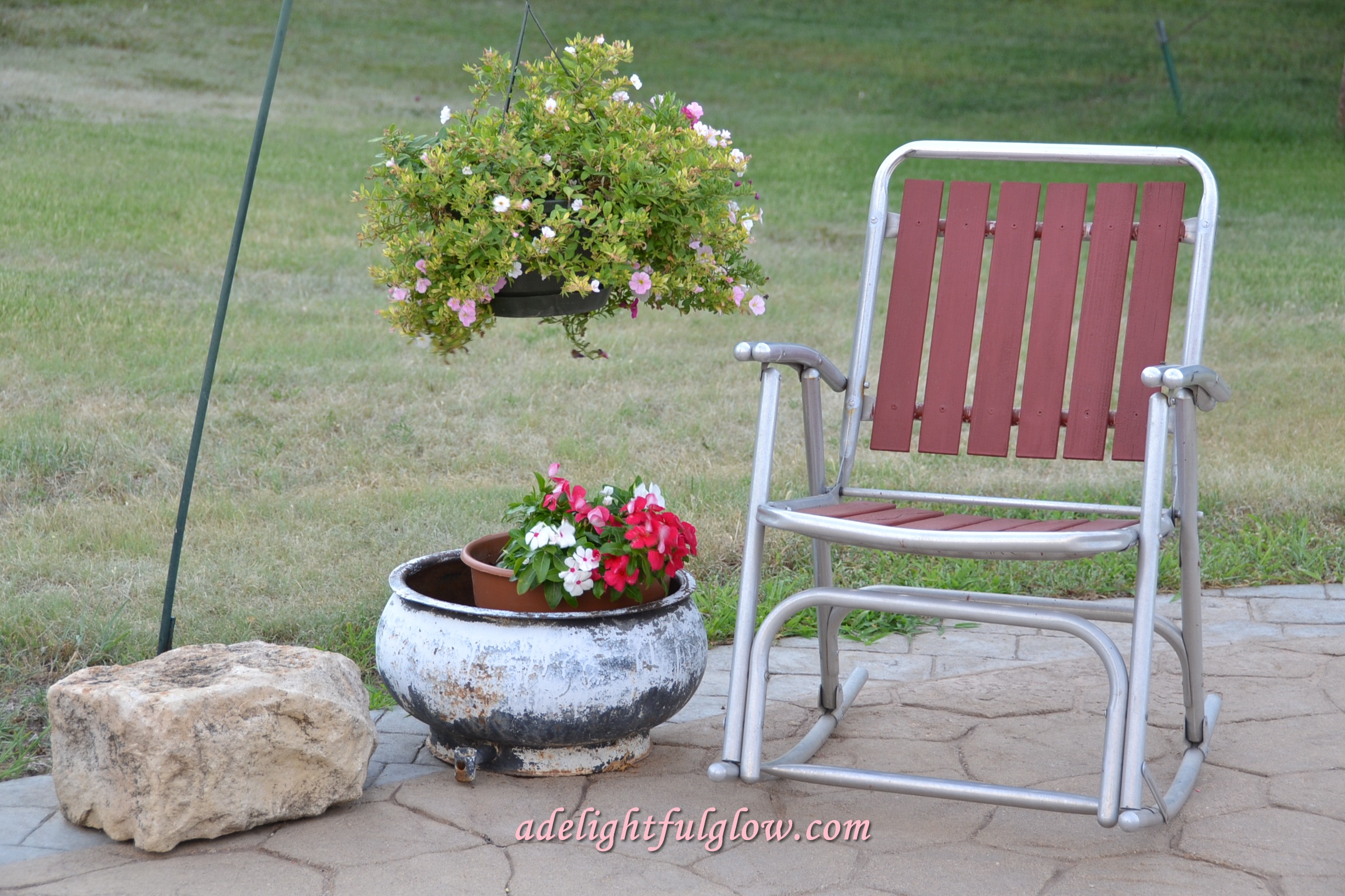 I can see these pots and this rocker from my kitchen window and have enjoyed it immensely. The rocker was my Grandma’s and she had some other outdoor furniture that matched it. It makes me think of her backyard and this outdoor furniture sitting in it for years.