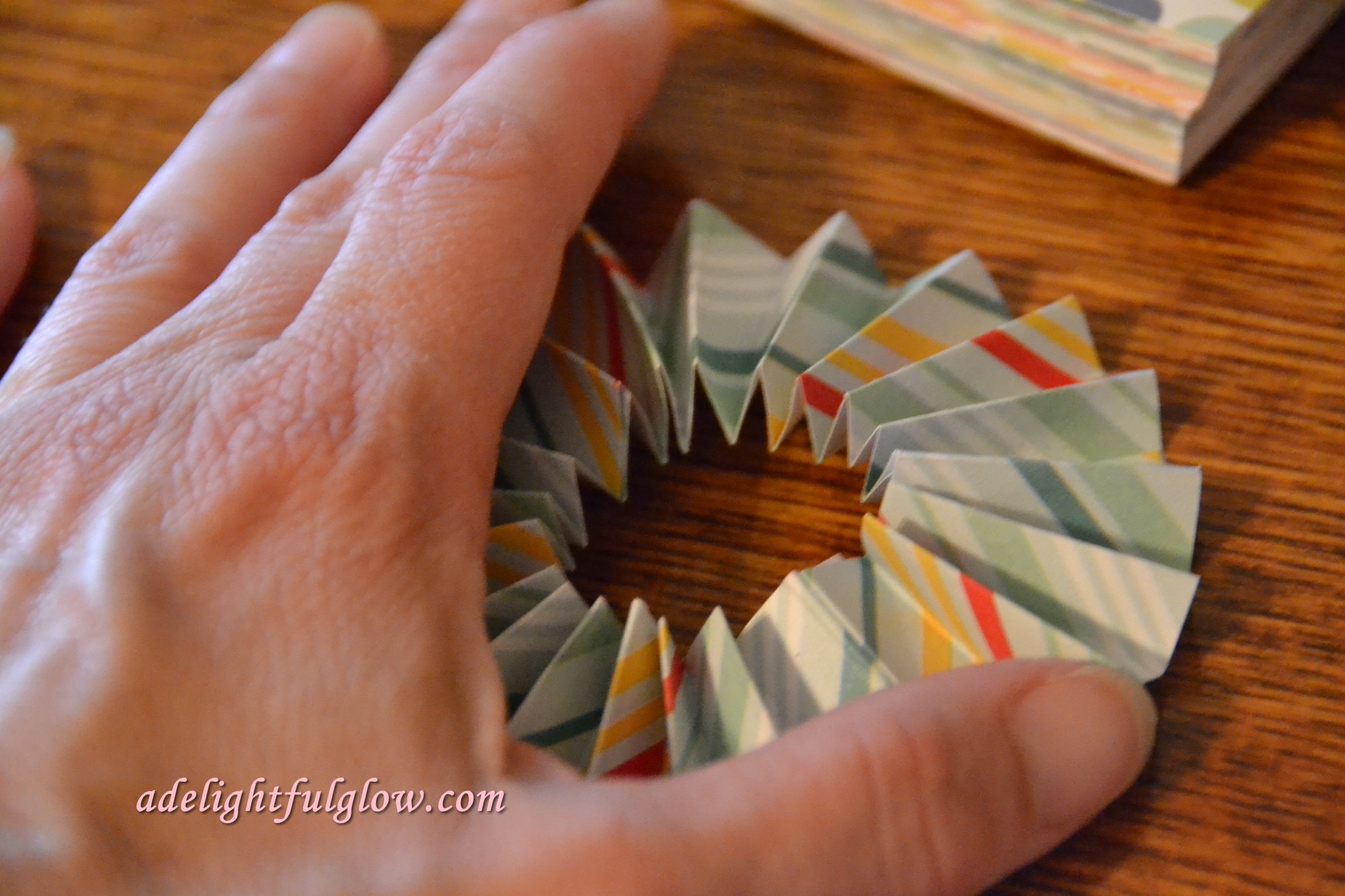 Glue ends together with glue stick. Now you have an accordion folded circle. {I keep spelling accordion wrong. If you aren’t a speller, this won’t matter to you. It totally bugs me, because I always liked spelling and for the most part it came easily to me. It doesn’t so much anymore. Ack!}